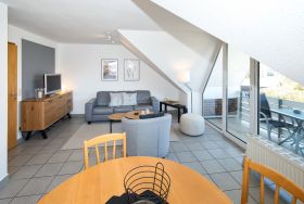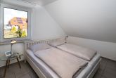 Maike 3b. Die schöne Ferienwohnung für bis zu 3 Personen liegt in der Anlage Maike im 1. OG eines Endreihenhauses und ist aufgeteilt mit einem kleinen Vorflur, Duschbad/WC, Schlafzimmer mit Doppelbett und einem weiteren Schlafbereich mit einem Einzelbett und Kleiderschrank für die 3. Person, dem Wohnbereich mit großem Esstisch und der gut ausgestatteten Küche. Vom Wohnbereich geht es auf den sonnigen Westbalkon. Eine Waschmaschine zur kostenfreien Nutzung steht für Sie im Badbereich zur Verfügung.