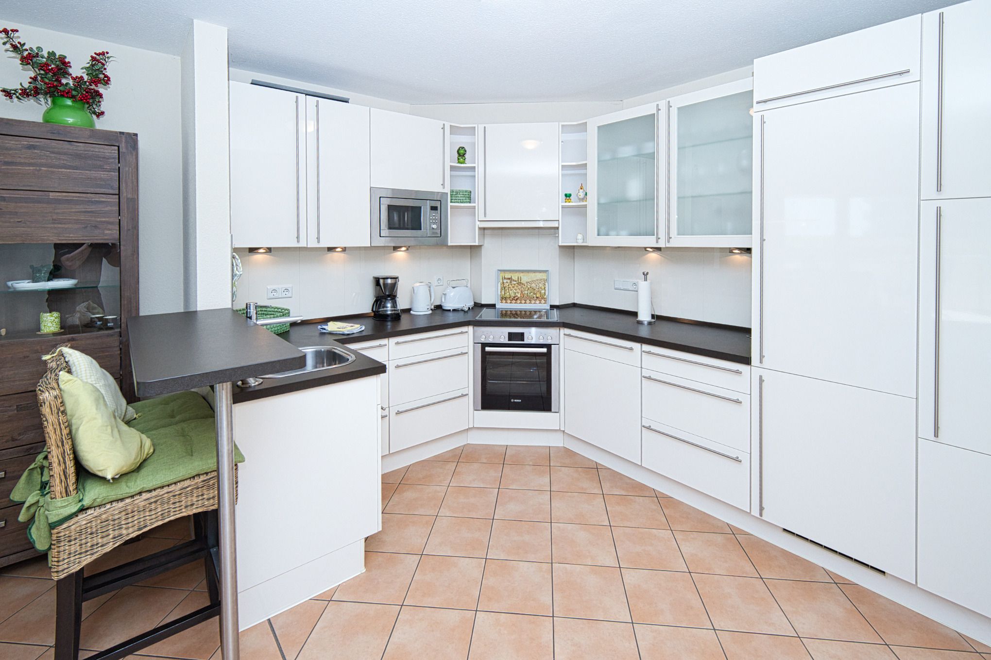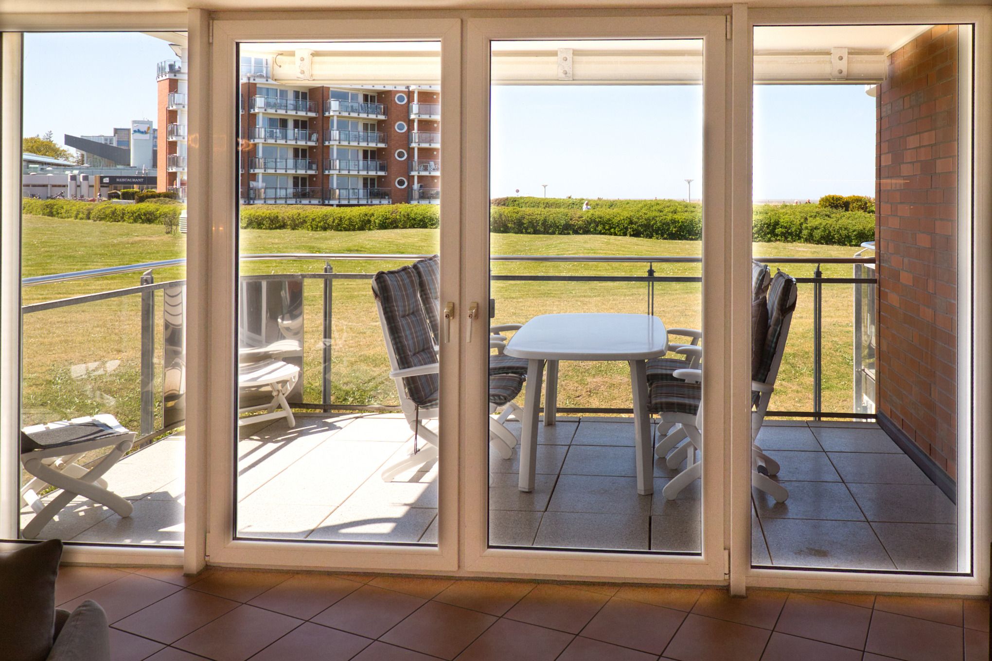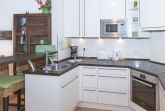 Der großzügige Wohn- und Essbereich lädt mit seiner hochwertigen Einrichtung und Fußbodenheizung zum Wohlfühlen ein. Die offene, komplett ausgestattete Einbauküche mit Tresen ist ideal, um einen Espresso zwischendurch zu genießen. Am Esstisch oder auf der gemütlichen Sofaecke lässt es sich entspannt frühstücken oder den Tag bei einem Gesellschaftsspiel ausklingen – stets mit herrlichem Blick auf die Nordsee. Der Wohnbereich bietet direkten Zugang zum Balkon, auf dem Sie die frische Meeresbrise und den Blick auf die Strandpromenade genießen können.