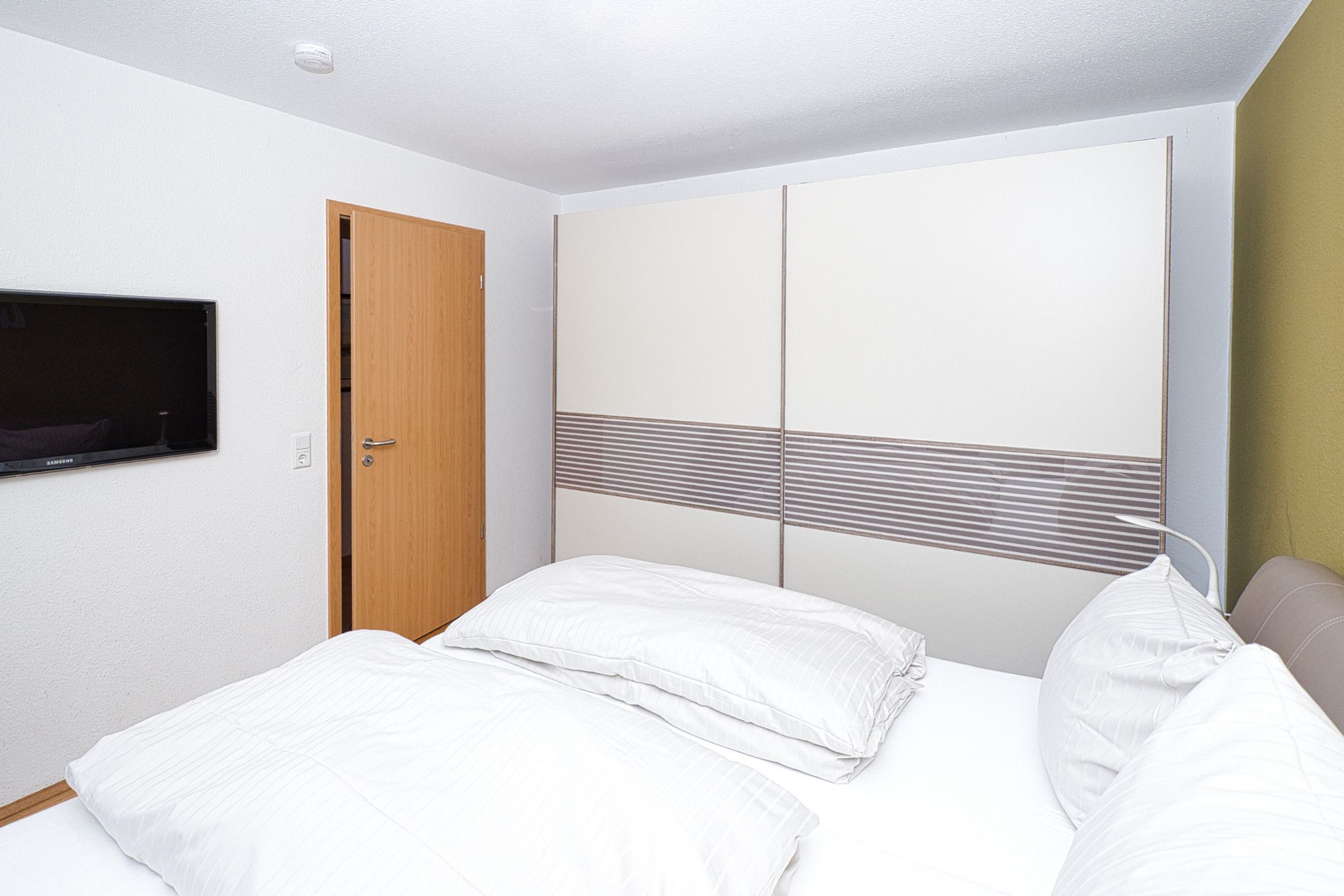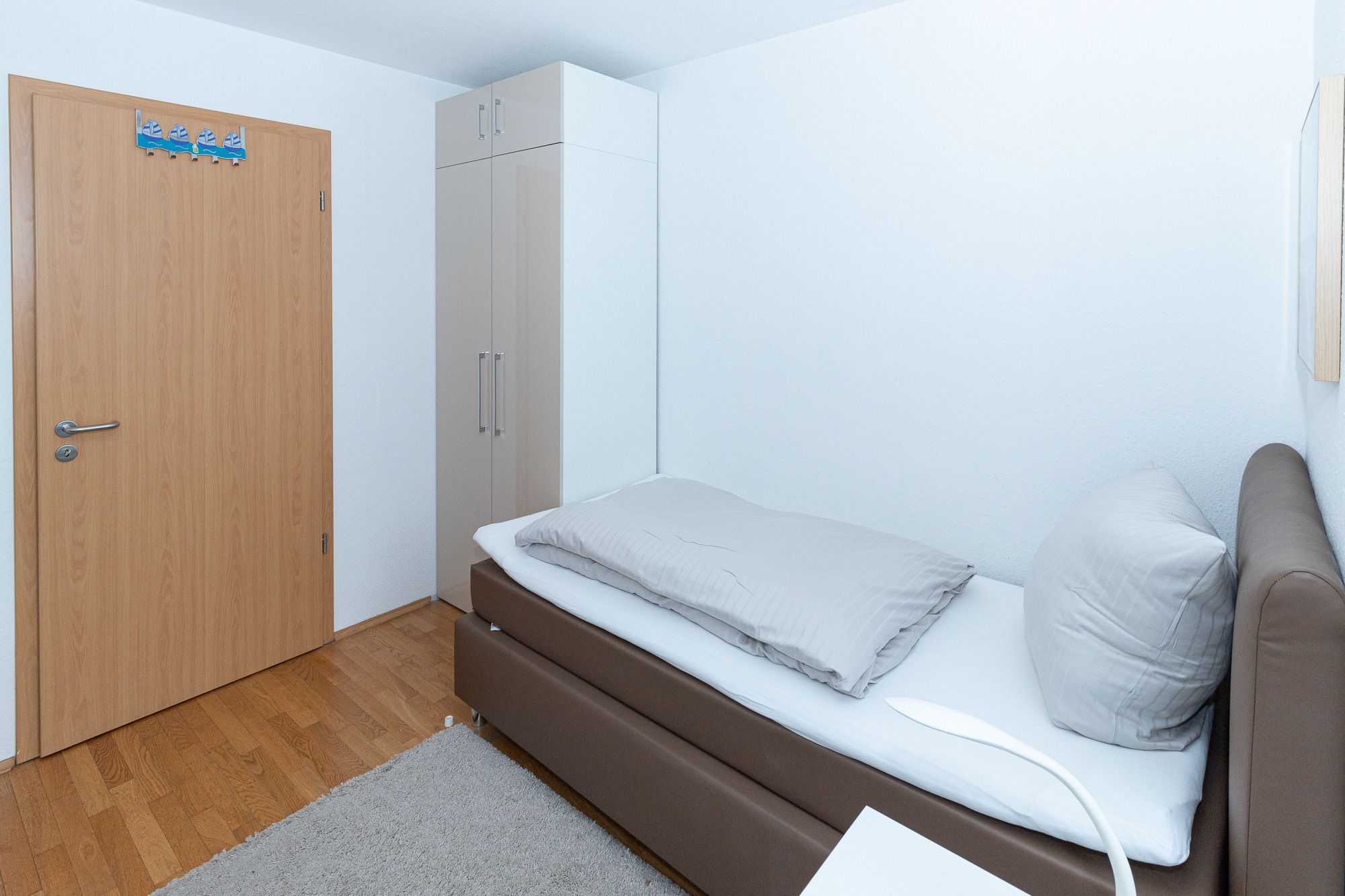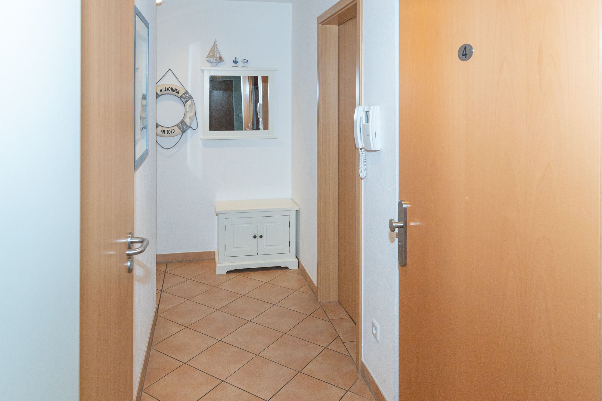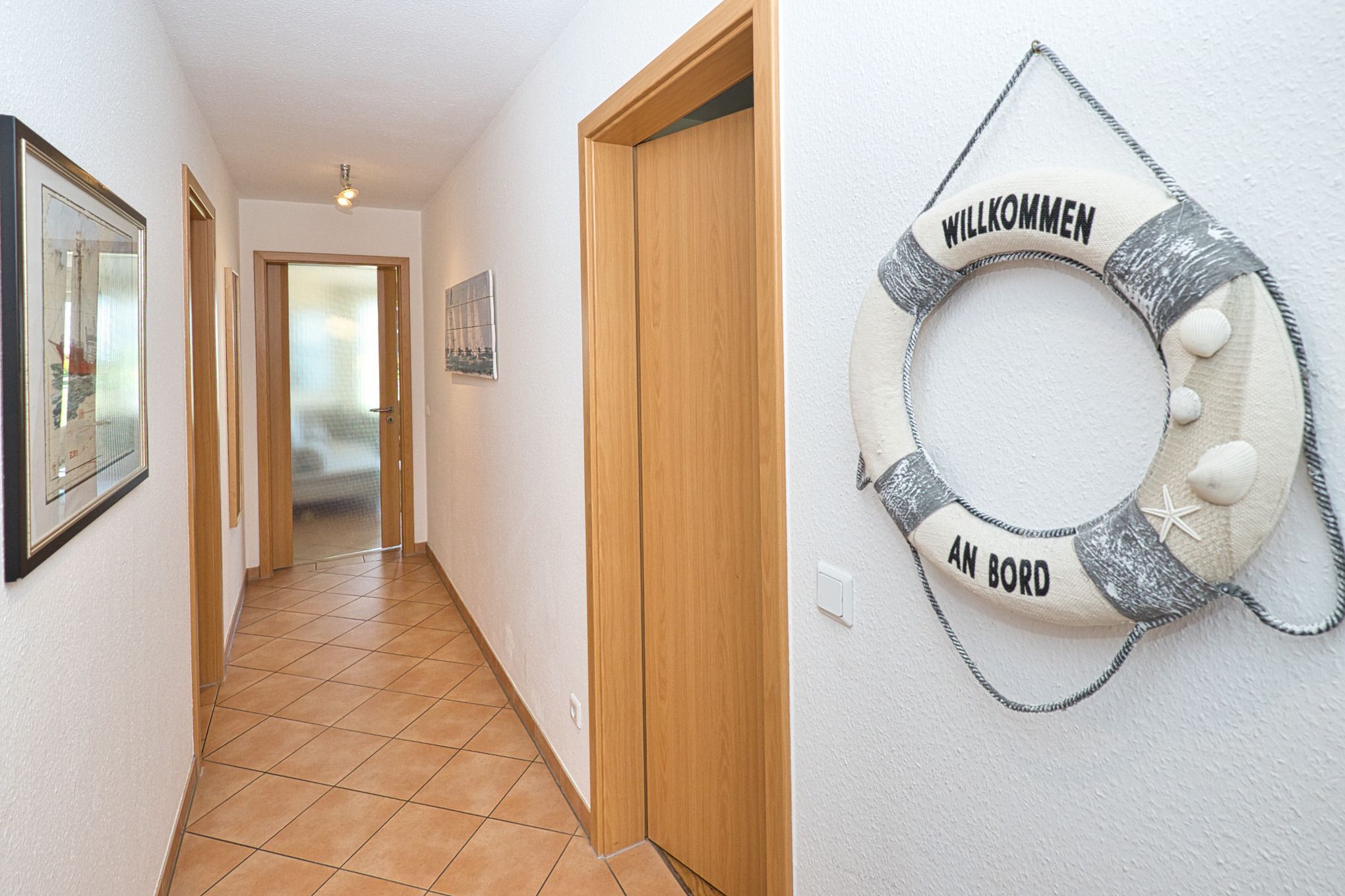 Vom Eingangsbereich, der mit Garderobe und einer Sitzmöglichkeit ausgestattet ist, gelangen Sie in die beiden gemütlichen Schlafzimmer – eines mit einem Boxspring-Doppelbett und das zweite Schlafzimmer mit zwei Boxspring-Einzelbetten. Beide Schlafzimmer haben Zugang zu dem 2. Balkon mit Seesicht, der sich wunderbar für entspannte Momente eignet. Die Schlafzimmer sind von Außen mit Außenjalousien versehen und von Innen mit Lamellenvorhängen.