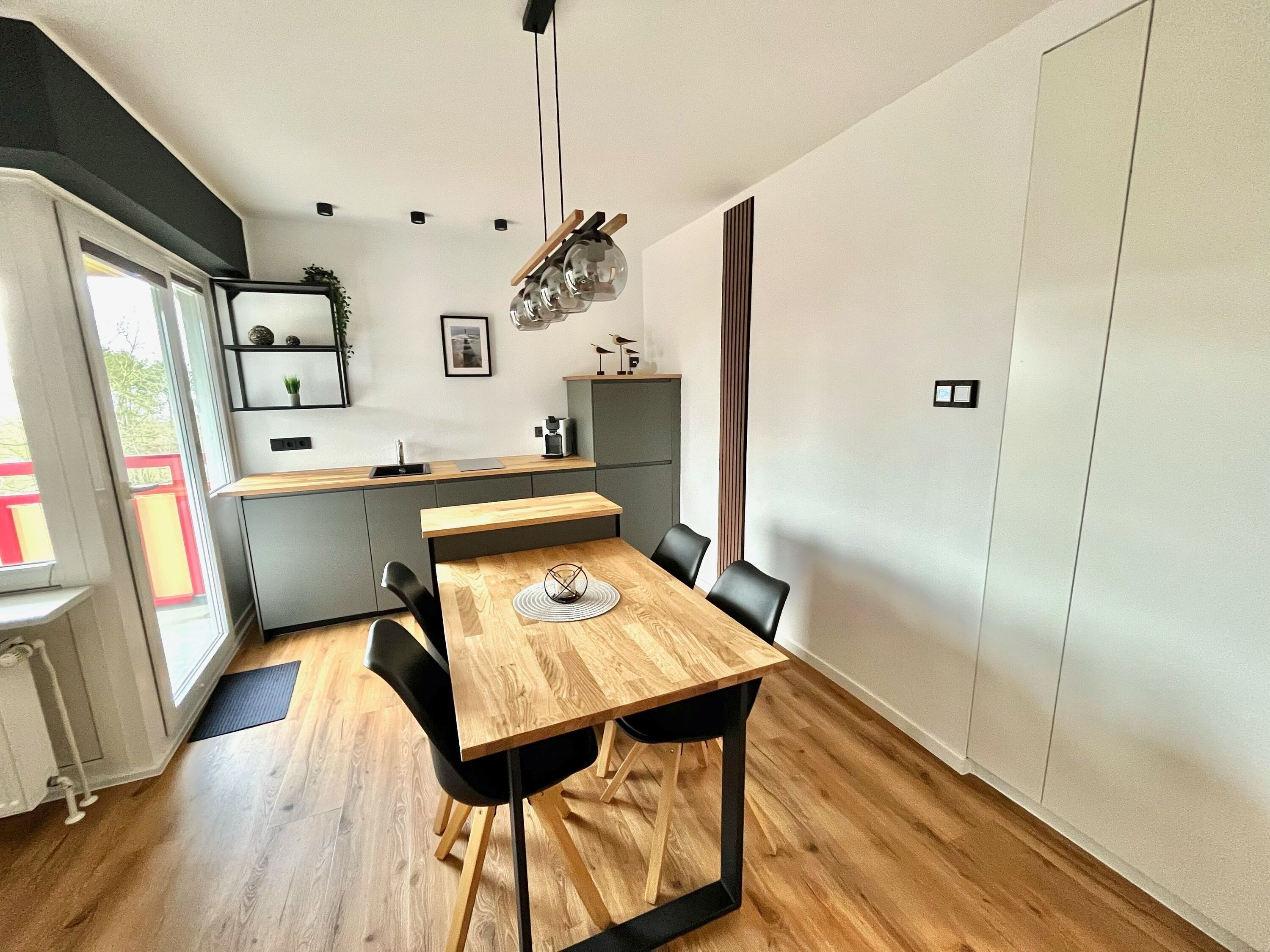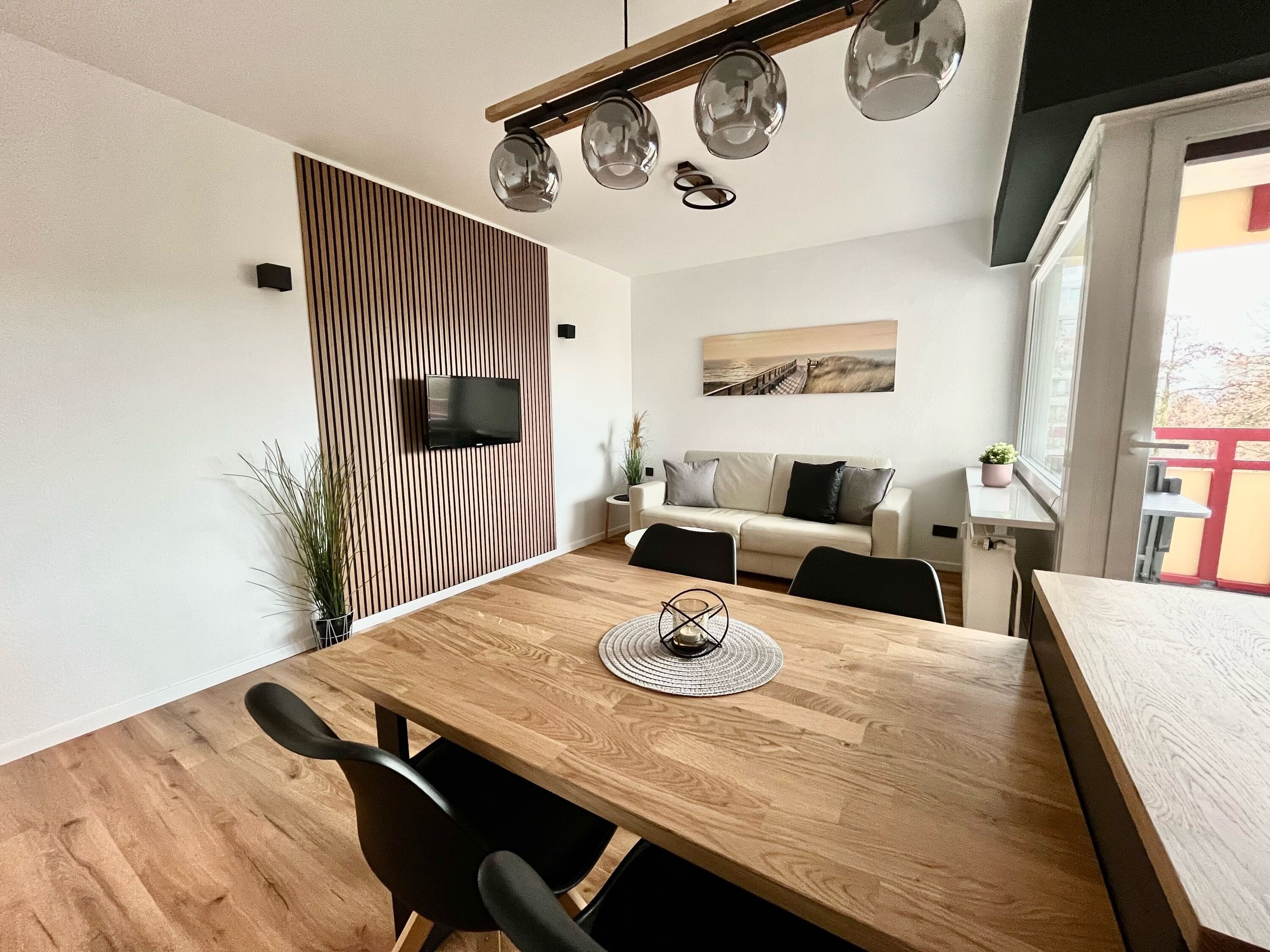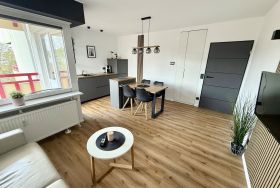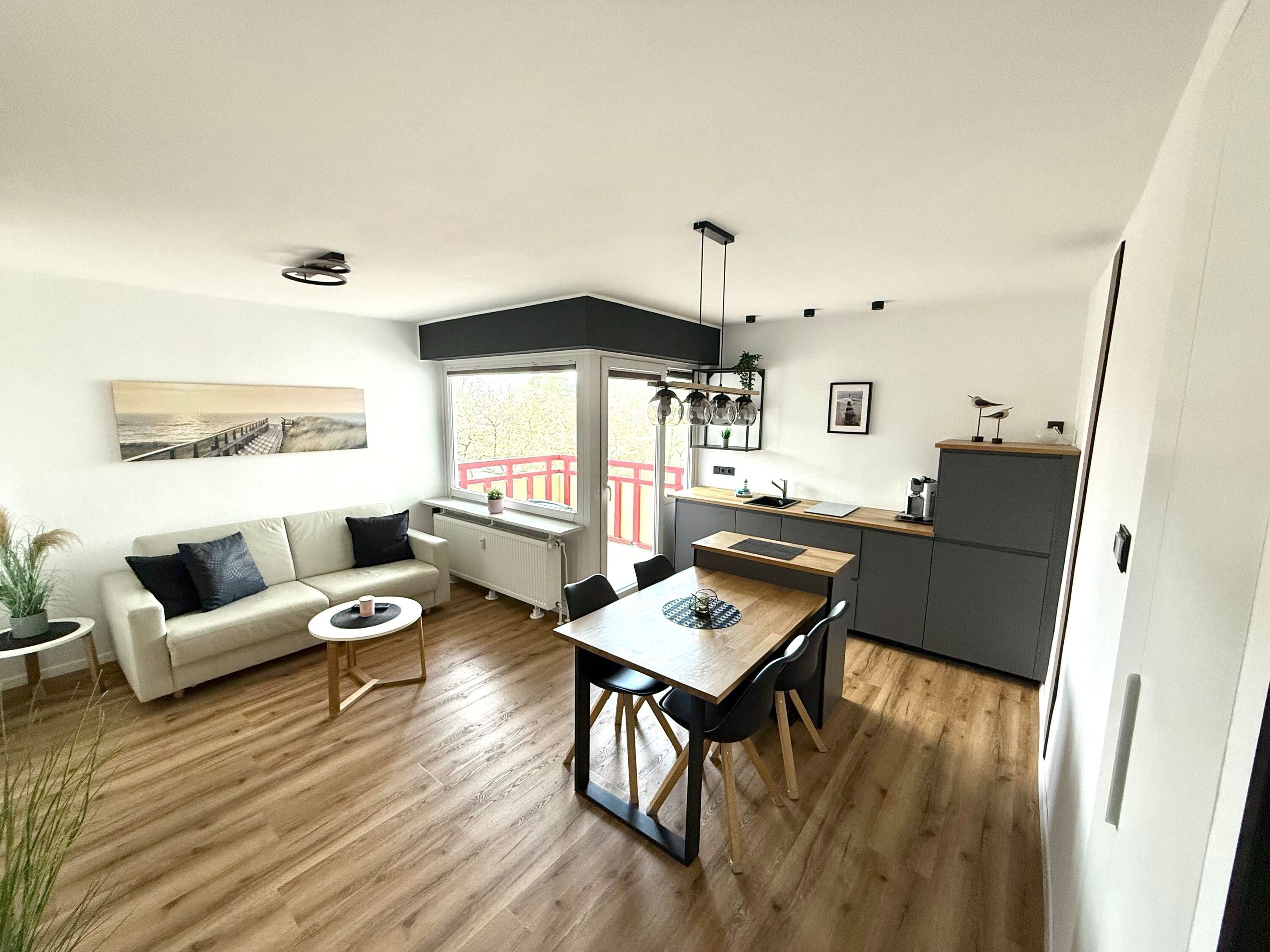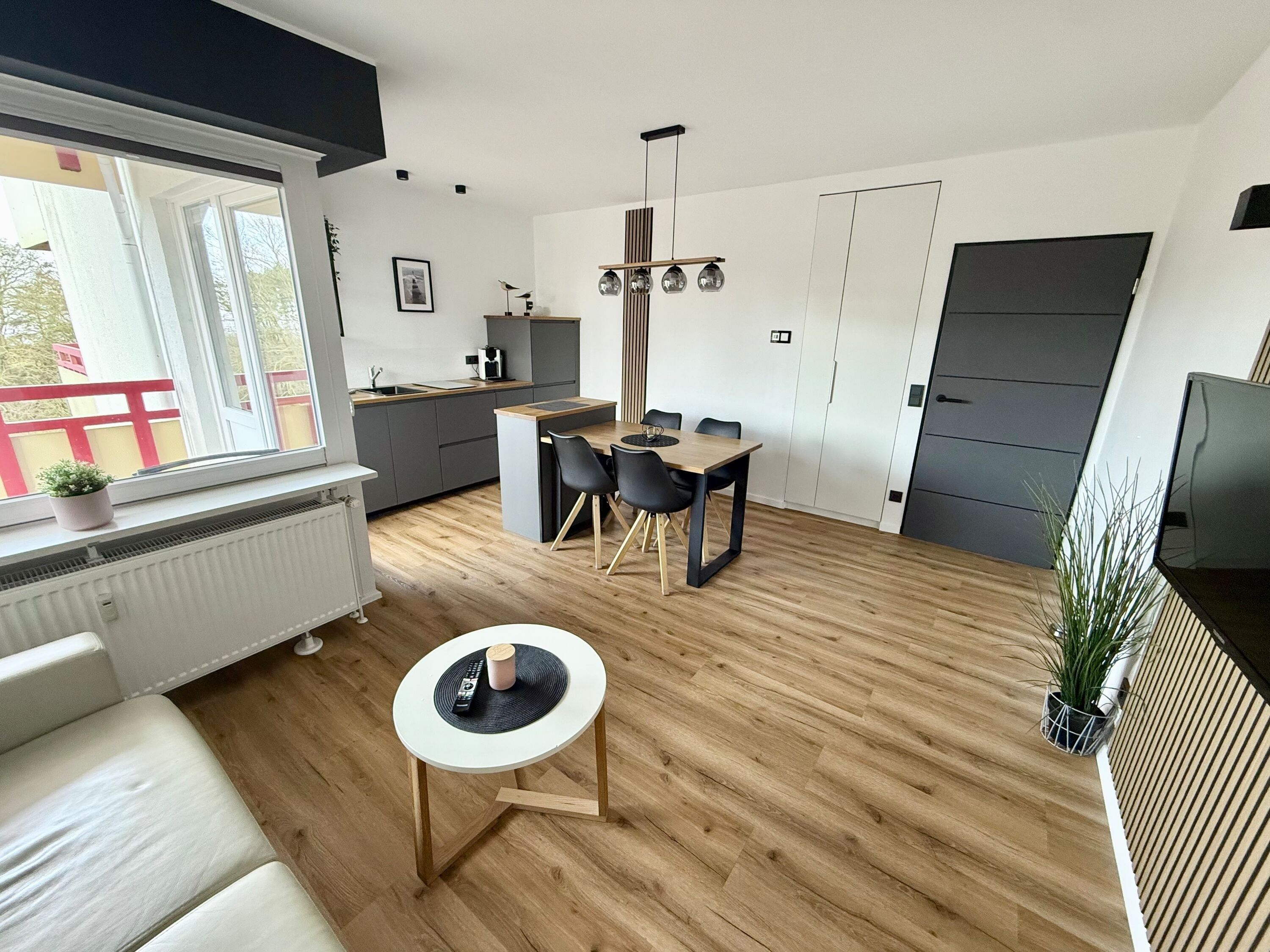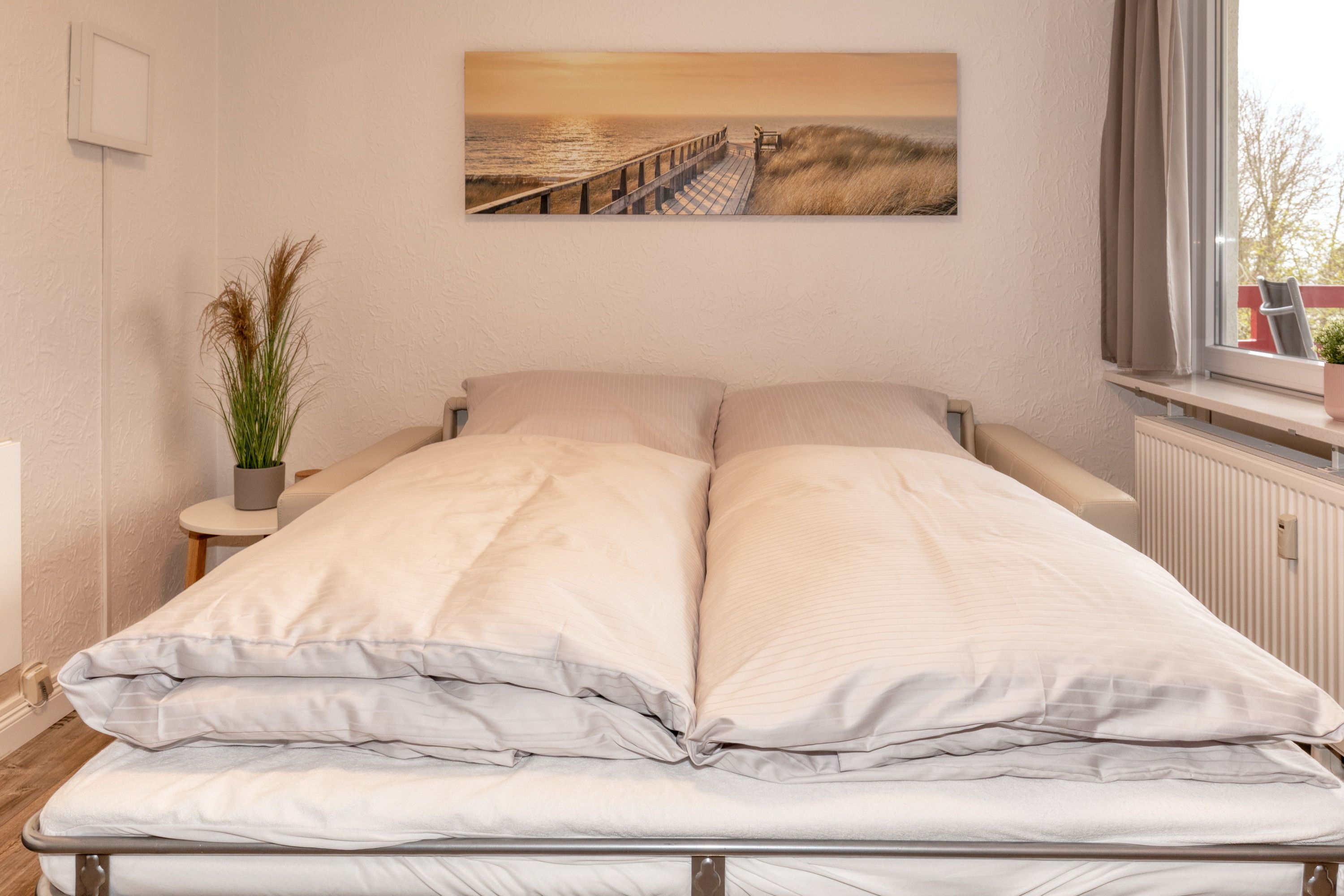 Das Appartement 45 ist ein 2-Raum-Appartement im 4. Obergeschoss für bis zu 4 Personen mit 35 qm. Der möblierte Westbalkon bietet morgens Schatten und nachmittags Sonne.