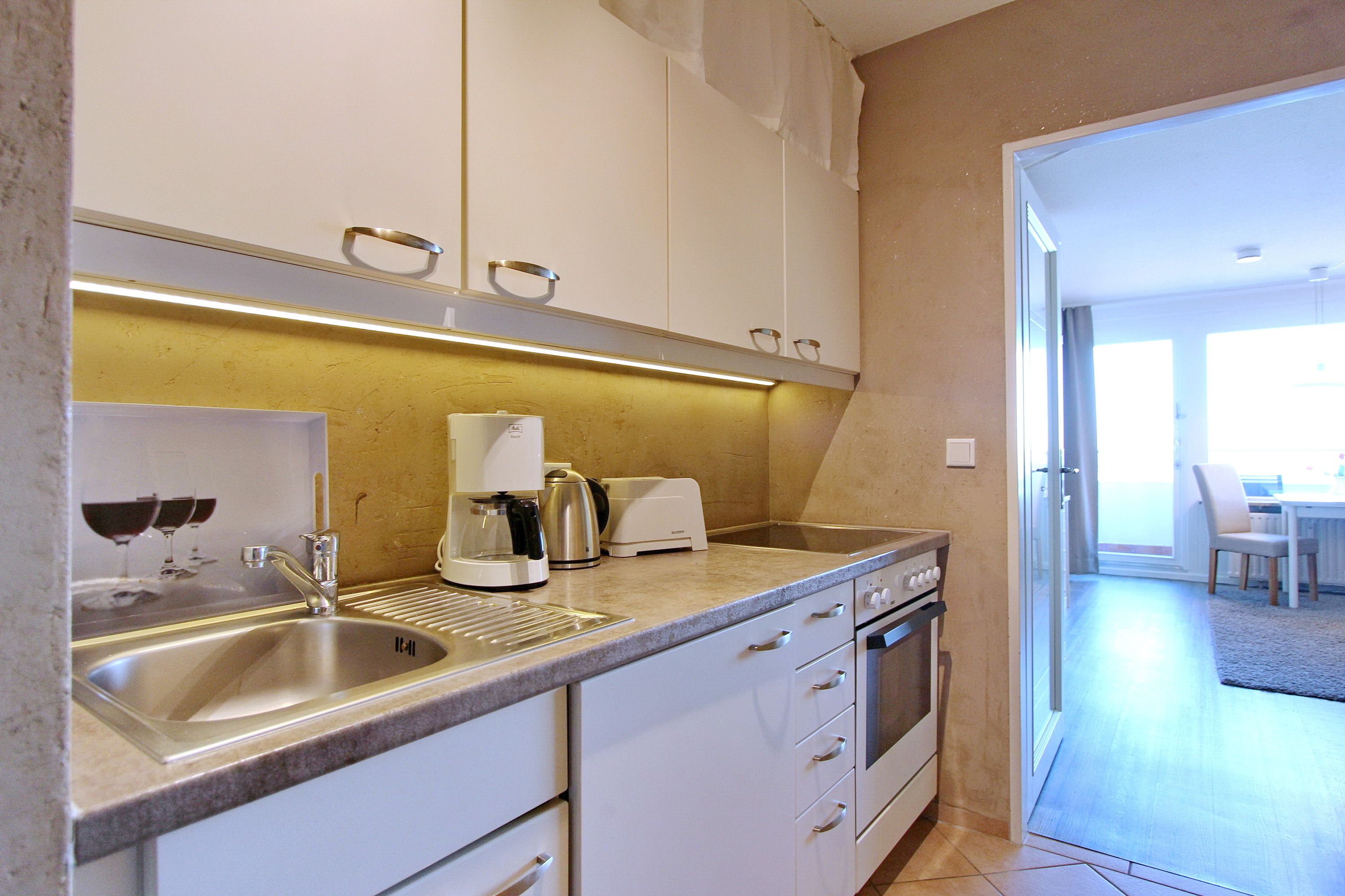 Einen tollen Meeresblick haben Sie aus dieser Einzimmerwohnung in der 8. Etage des Haus Metropol. Der kombinierte Wohn-/Schlafraum mit vorgelagertem Westbalkon (Balkonmöbel mit Kissen sind vorhanden) verfügt über Einzelschrankbetten und einen Essplatz mit 2 Stühlen, der direkt am Fenster steht. In der Wohnung wurde Laminatfußboden verlegt und es gibt eine Couch und einen Sessel. Das Badezimmer hat eine Dusche, Handtuchtrockner und einen Hocker. In der Einbauküche im Flur mit Cerankochfeld und Backofen können sie sich selbst verpflegen. Zur technischen Ausstattung gehört: ein Flachbildfernseher und ein CD Player. Das freie WLAN Netzwerk (WEG Haus Metropol - Passwortfrei - ohne Gewähr) steht ihnen kostenfrei zur Verfügung. Die Wohnungsgröße dieser Nichtraucherwohnung beträgt: ca. 34 m².