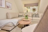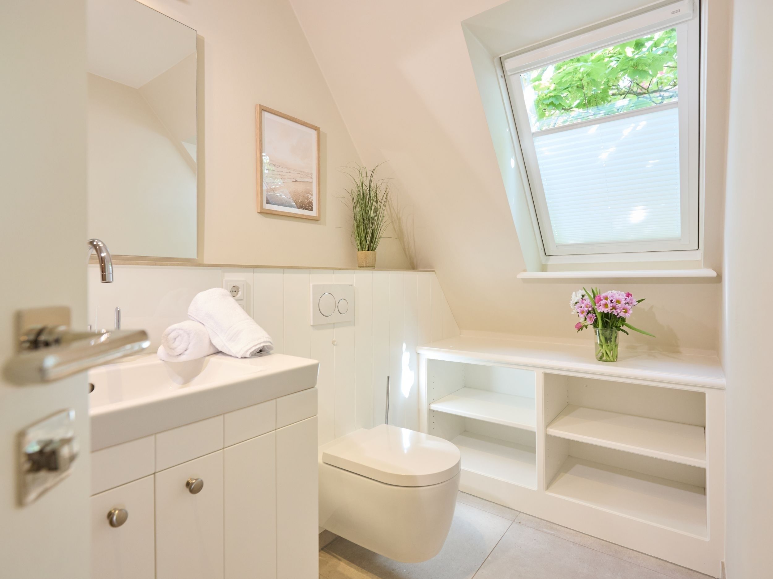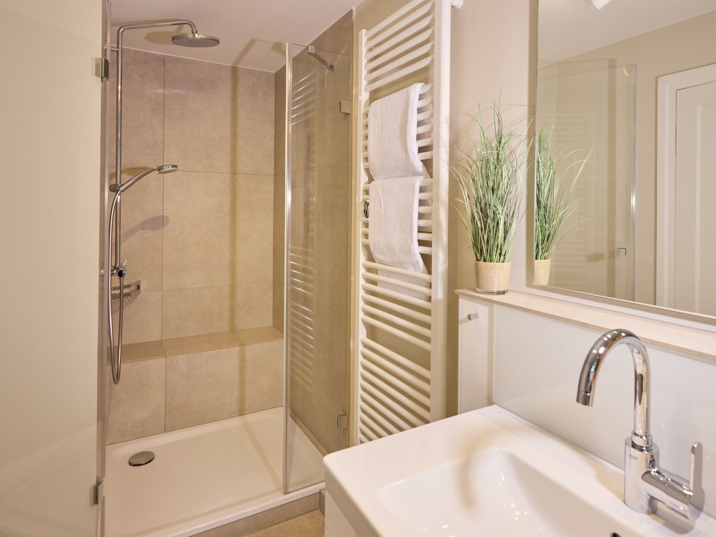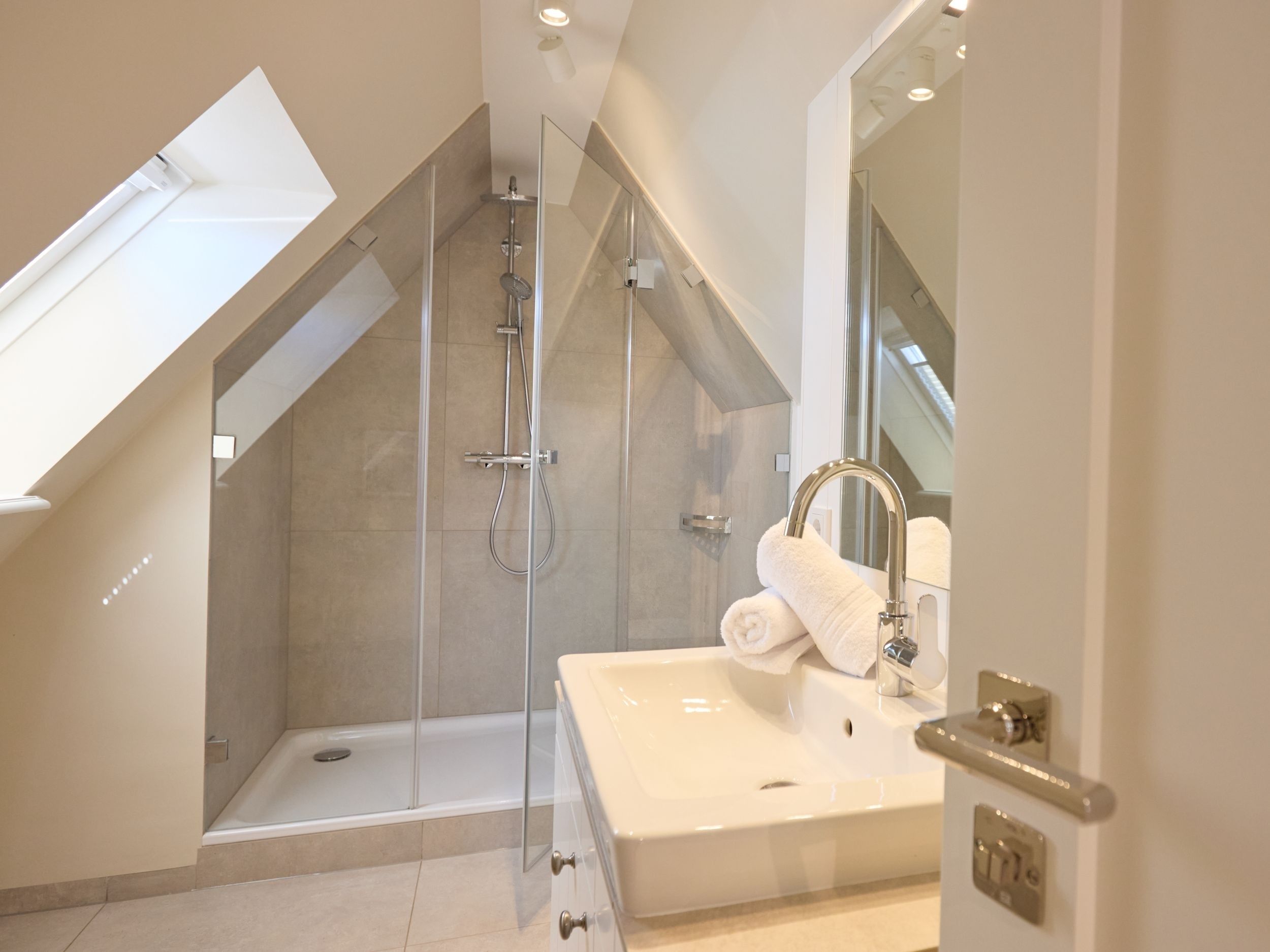 Folgen Sie der Treppe nun ins 2. OG erblicken Sie ein weiteres, helles und modernes Duschbad sowie ein weiteres Zimmer zur freien Verfügung.