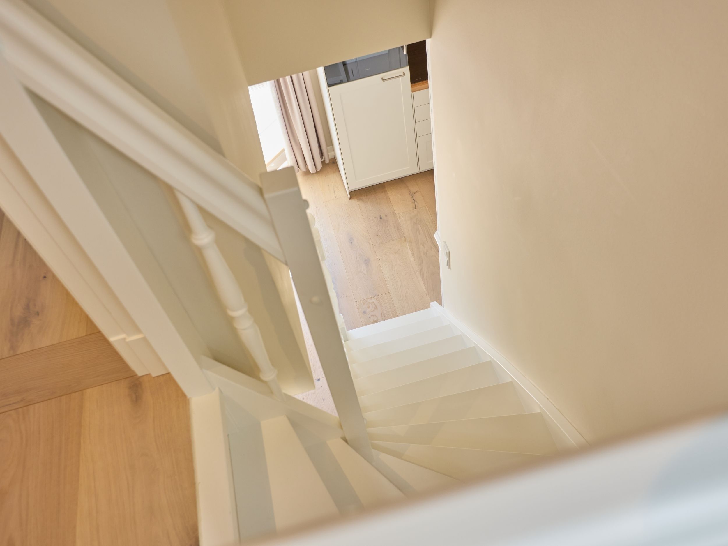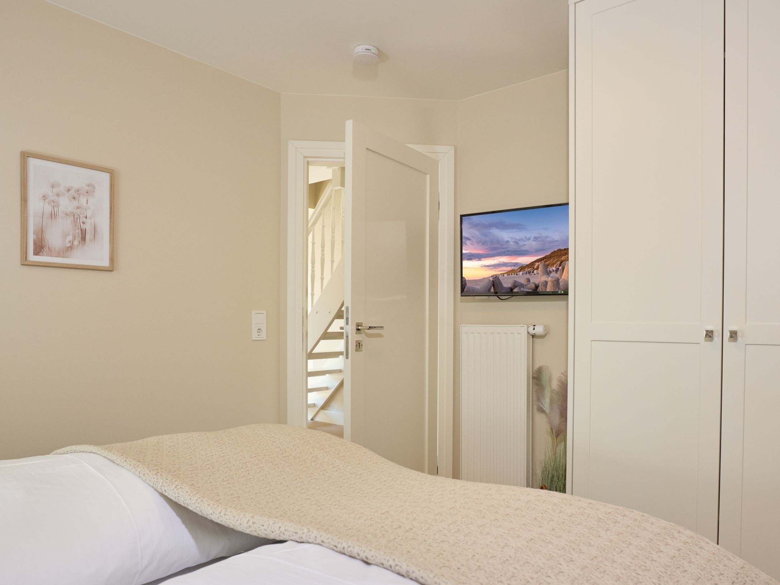 Über Ihren privaten Eingang betreten Sie Ihr helles Feriendomizil. Zu Ihrer rechten finden Sie eine kleine Abstellfläche. Folgen Sie dem Flur und nehmen Sie die Treppe nach Oben ins 1. OG.