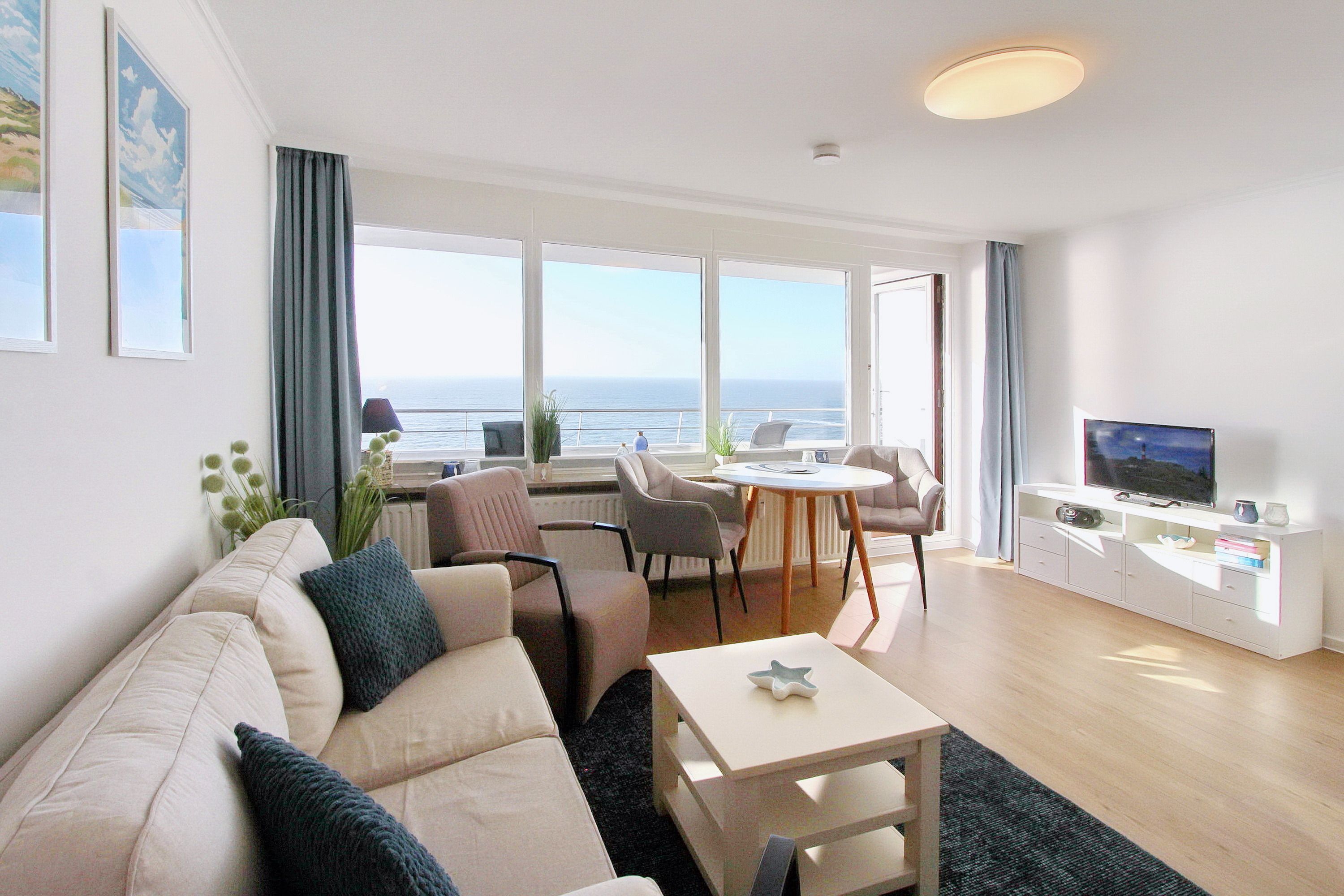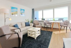 Einzimmerwohnung in der 11. Etagen im Haus Metropol mit einem herrlichen Blick über den Strand und die Nordsee. Der Wohn-/Schlafraum hat einen vorgelagerten Westbalkon mit Balkonmöbeln, feststehendes Doppelbett, einen Essplatz mit 2 Stühlen am Fenster und ein Sofa für 2 Personen. Zwei Sessel sind ebenfalls vorhanden. Der Mix aus alten und neuen Einrichtungselementen verleiht der Wohnung einen speziellen Look. Das Badezimmer hat eine Dusche (mit niedrigem Einstieg), einen Hocker, sowie einen Fön. In der separaten Küche mit Mikrowelle können Sie sich selbst verpflegen. Zur technischen Ausstattung gehört: ein 32 Zoll Flachbildfernseher von Panansonic und ein Radio mit CD Player. Ein freies WLAN Netzwerk (WEG Haus Metropol - Passwortfrei - ohne Gewähr) steht ihnen kostenfrei zur Verfügung. Wohnungsgröße: ca. 42 m².