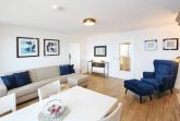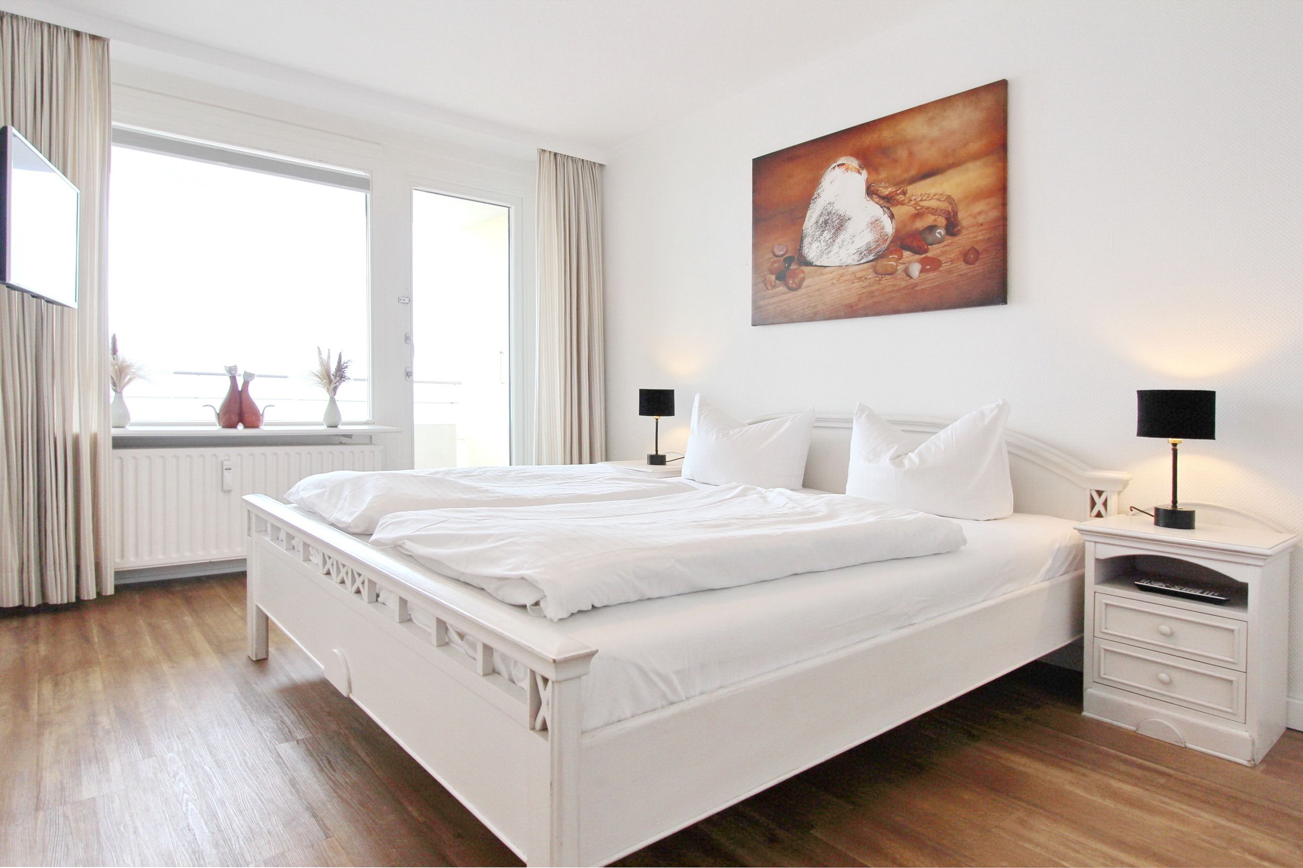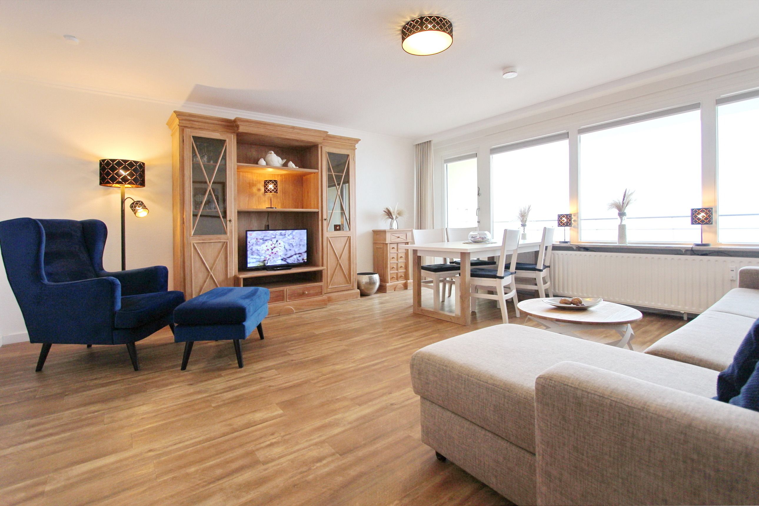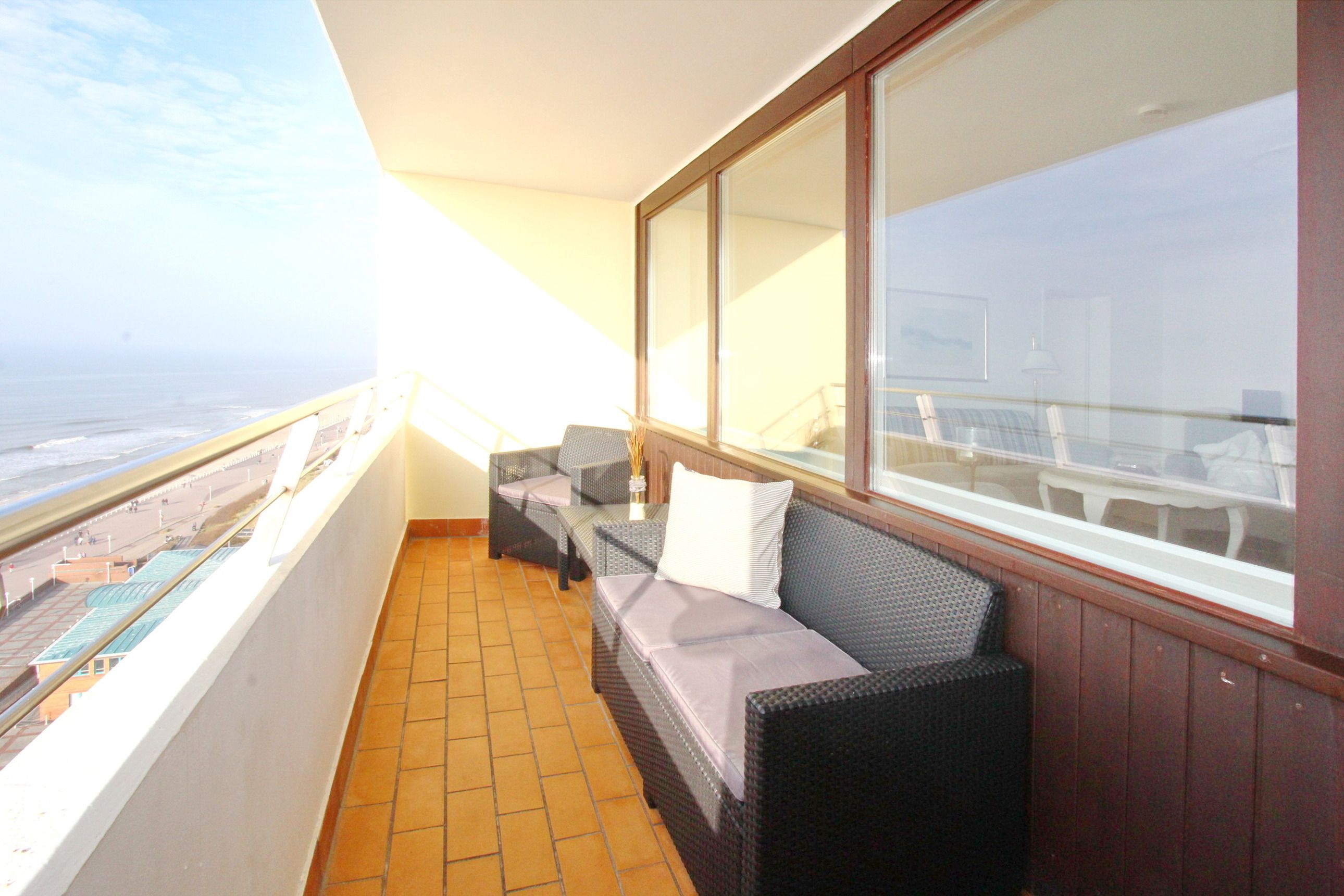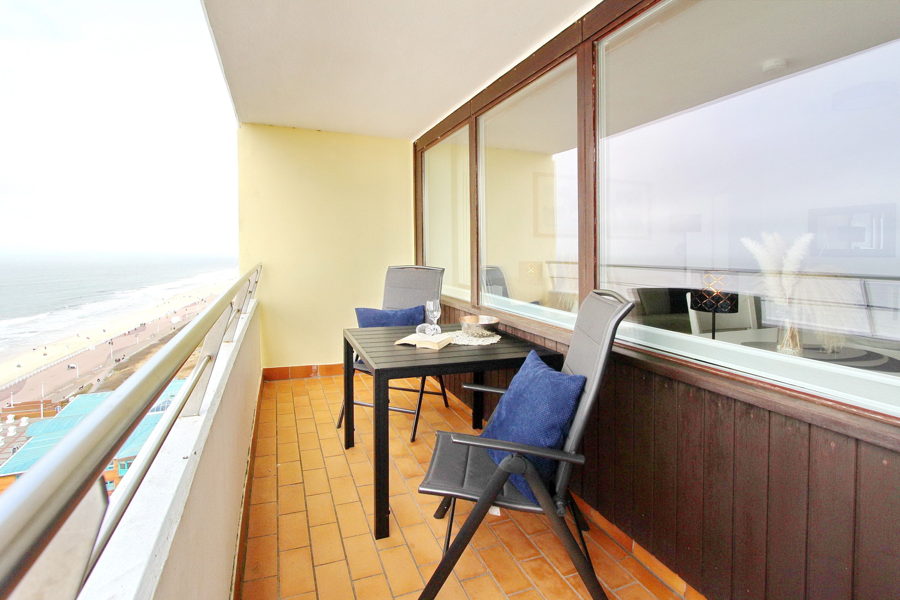 Große Zweizimmerwohnung in der 12. Etage im Haus Metropol mit herrlichem Blick über den Strand und das Meer. Das Wohnzimmer und das Schlafzimmer haben je einen vorgelagerten Westbalkon mit Loungemöbeln. Ausgestattet ist die Wohnung mit einer Couch mit Schlaffunktion, 1 gemütlichen Ohrensessel mit Hocker, einem Essplatz mit 4 Stühlen und einer Schrankwand mit viel Stauraum. Designboden in Holzoptik verleiht dem Raum Wärme und Gemütlichkeit. Im Schlafzimmer gibt es ein feststehendes Doppelbett mit 2 Matratzen und ein TV. Im separaten Ankleidezimmer gibt es einen großen Kleiderschrank, Sessel und Spiegel. Um sich selbst zu verpflegen verfügt diese Wohnung über eine kleine Küche mit Geschirrspüler, Backofen, Ceranfeld und Mikrowelle. Stilvoll decken Sie den Tisch mit Geschirr von Thomas Trend. Das Badezimmer hat eine Dusche, die einen niedrigen Einstieg hat, einen Fön und einen Handtuchtrockner. Zur technischen Ausstattung gehört: ein Flachbildfernseher von Panasonic und ein Radio. Ein freies WLAN Netzwerk (WEG Haus Metropol - Passwortfrei - ohne Gewähr) steht ihnen kostenfrei zur Verfügung. Wohnungsgröße: ca. 67 m².