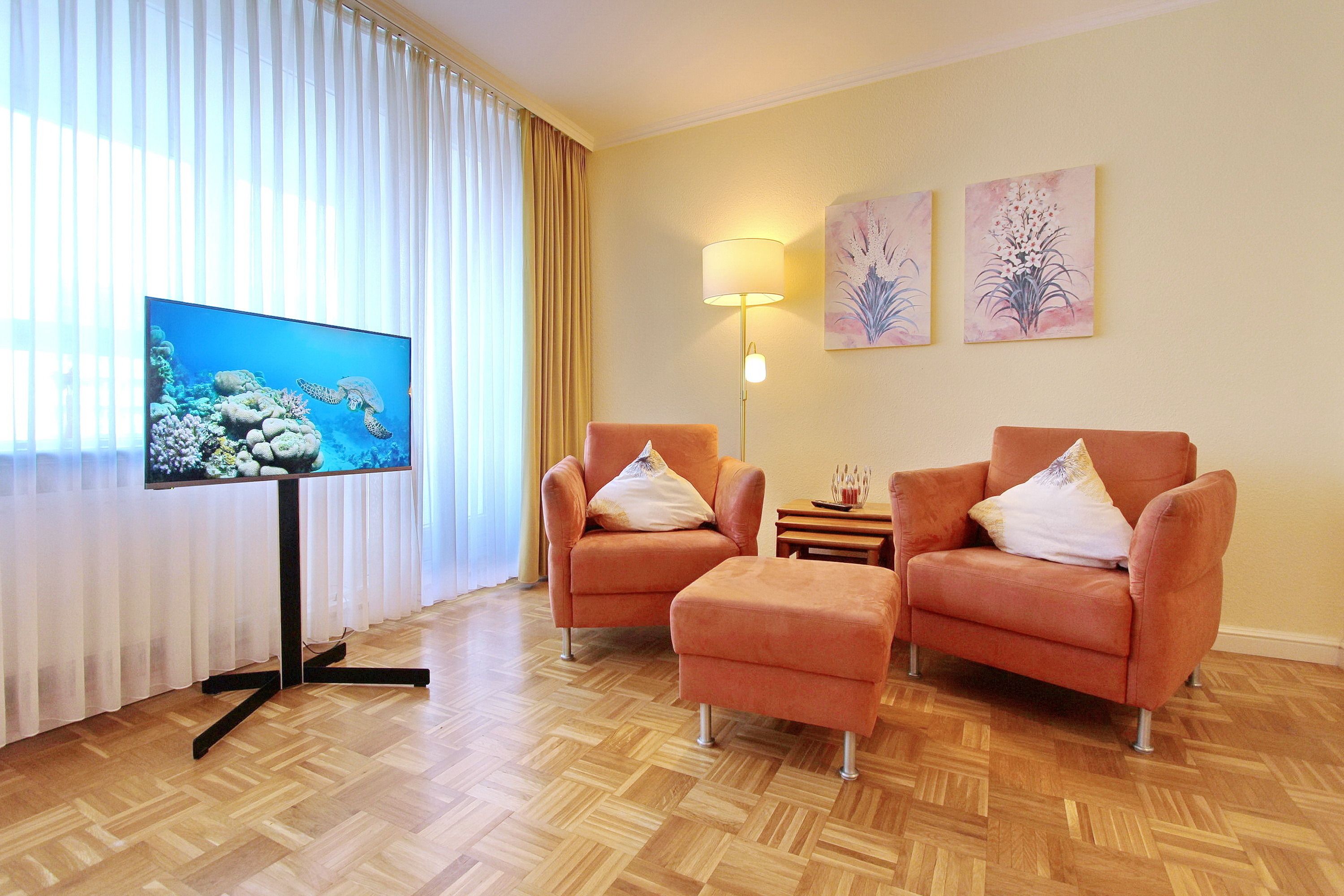 Hell und freundlich eingerichtete 1 Zimmer Wohnung in der 1. Etage zur Westseite. Diese Nichtraucherwohnung in unmittelbarer Strandlage ist mit Einzelschrankbetten, einem Essplatz für 2 Personen sowie einer komfortablen, ansprechende Sitzgruppe ausgestattet. In der offenen Küchenzeile im Wohnbereich (mit Mikrowelle und zusätzlicher Nespressomaschine) können sie einfach und schnell kleine Mahlzeiten oder ein köstliches Frühstück zubereiten. Im hellen Badezimmer gibt es eine Dusche und einen Handtuchtrockner. Den verglasten Westbalkon (Wintergarten) mit modernen Loungemöbeln können sie auch bei schlechtem Wetter nutzen. Diese Wohnung verfügt über einen modernen Flachbildfernseher von Panasonic. Wohnungsgröße: ca. 40 m².