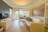 Im Wohnzimmer befindet sich der Essplatz mit Blick von der gemütlichen dänischen Küchenbank in den Garten, eine Ledercouch mit ggfs. zusätzlichem Schlafplatz (150x200), Leseecke und Smart TV. Vor dem Wohnzimmer liegt die überdachte Südterrasse, von dort geht es über eine Stufe in den Gemeinschaftsgarten.