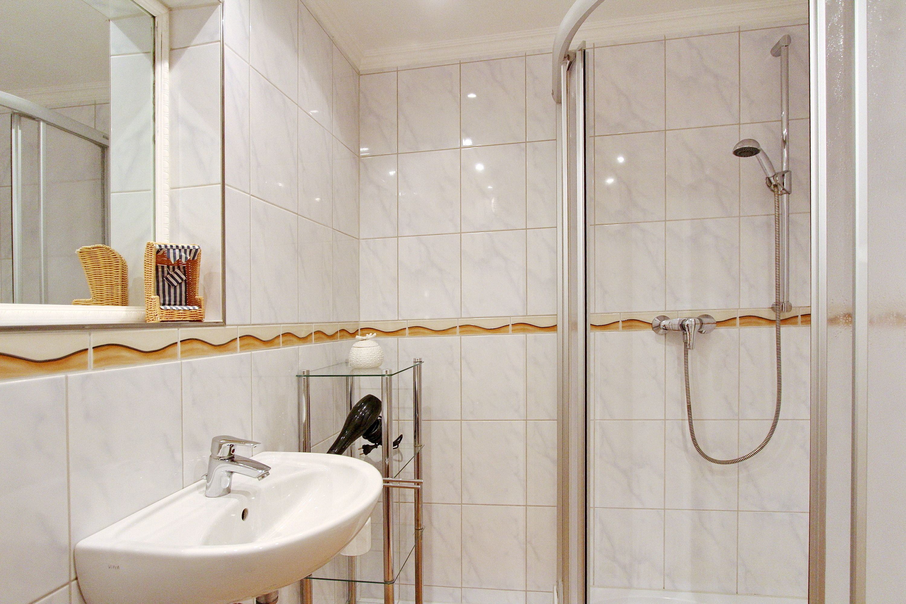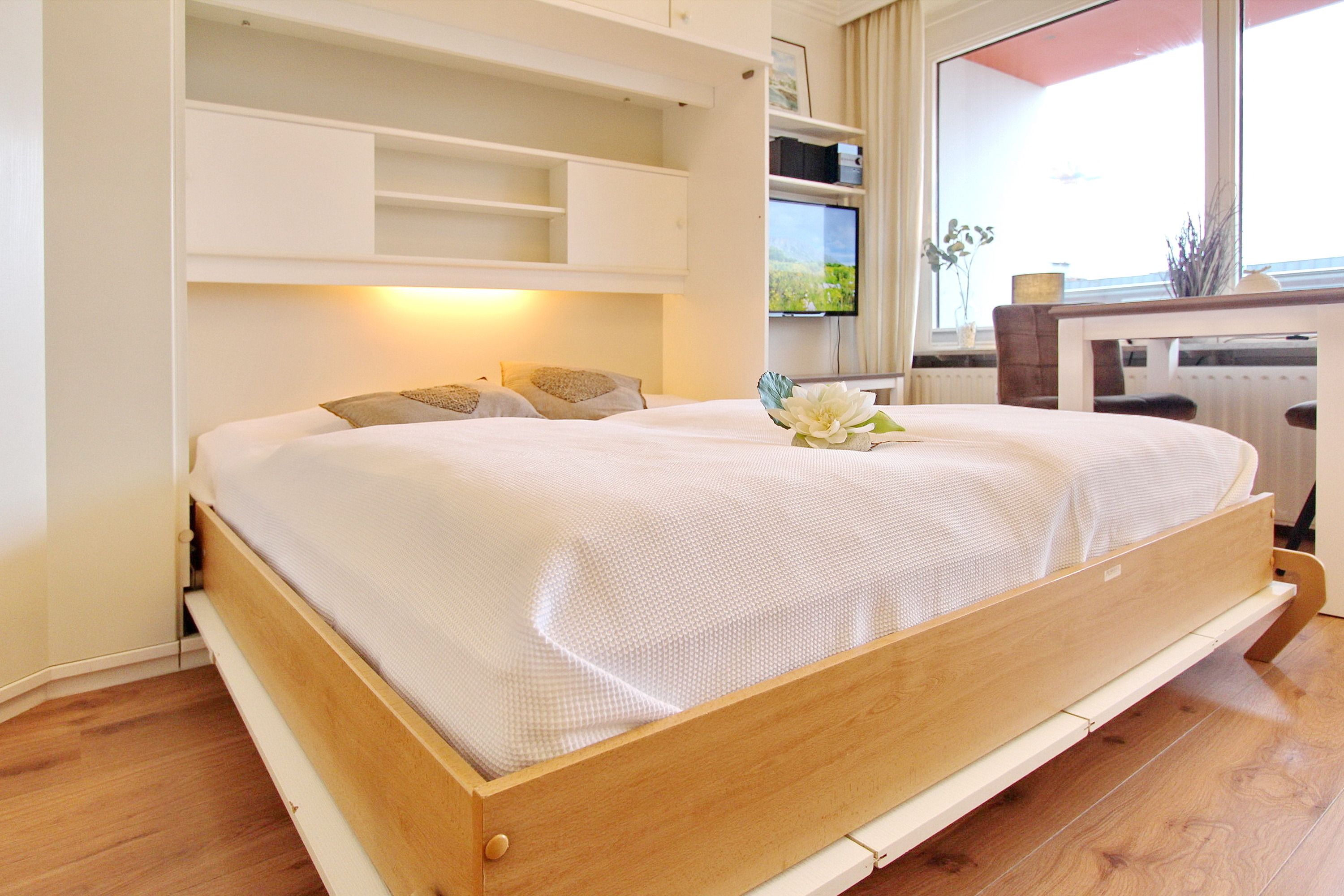 Hell und freundlich eingerichtete Einzimmerwohnung in der 2. Etage im Haus am Meer zur Landseite. Wenige Schritte trennen Sie vom Strand und dem Meer. Der kombinierte Wohn-Schlafraum ist ausgestattet mit einem Doppelschrankbett, einem Essplatz am Fenster mit 2 Stühlen, sowie einer Kunstledercouch. In der Wohnung wurde Laminatboden verlegt und auf Teppiche komplett verzichtet. In der Schrankwand gibt es einen großen Kleiderschrank mit ausreichend Stauraum für Ihre persönlichen Dinge. Vom Balkon aus können Sie das Treiben auf der Friedrichstraße beobachten. Balkonmöbel mit Auflagen sind vorhanden. Das Badezimmer hat eine Dusche, einen Fön und einen Handtuchtrockner. In der Küchenzeile im Flur mit Cerankochfeld (4 Herdplatten), Backofen und Mikrowelle können Sie sich selbst verpflegen. Zur technischen Ausstattung dieser Wohnung gehört: ein Flachbildfernseher und ein Radio mit CD Spieler. Ein kostenfreier WLAN Zugang (WEG Haus am Meer - Passwortfrei - ohne Gewähr) ist vorhanden. Wohnungsgröße: ca. 30 m².