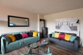 Kommen Sie vom Wind durchpustet zurück in die Barke 17, können Sie sich erst einmal am Gas-Kaminofen in der gemütlichen Couch-Ecke aufwärmen. Verbinden Sie dann noch die Bose-Soundanlage mit Ihrem Handy, können Sie gleich Ihre Entspannungs- oder Gute-Laune-Musik anstellen. Urlaub pur! Oder lassen Sie sich von einem Krimi auf dem großen Fernseher fesseln. Bei gutem Wetter können Sie sich an ihrer eigenen Terrasse und dem dazugehörigen ( komplett eingezäuntem ) Garten erfreuen. Im Erdgeschoss finden Sie außerdem noch ein Gäste-WC.