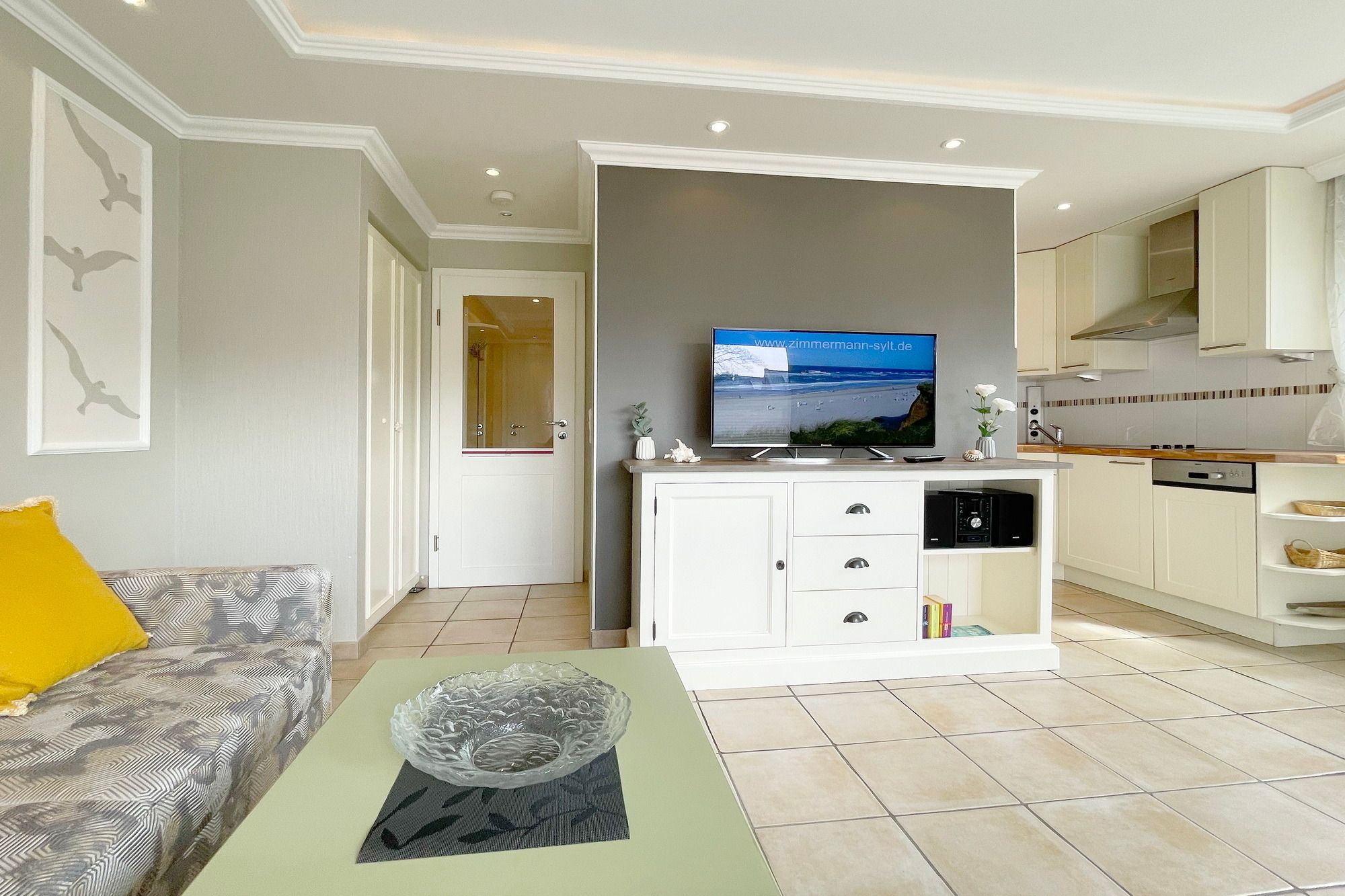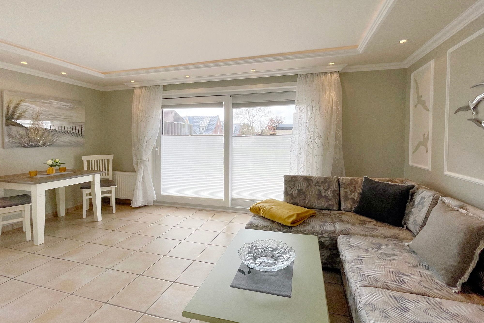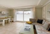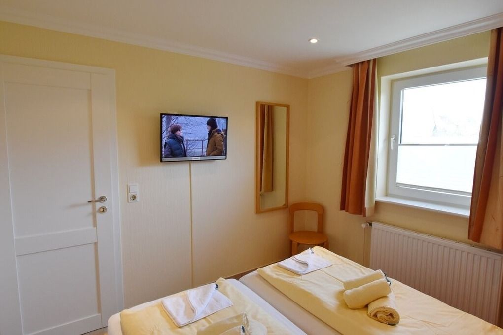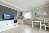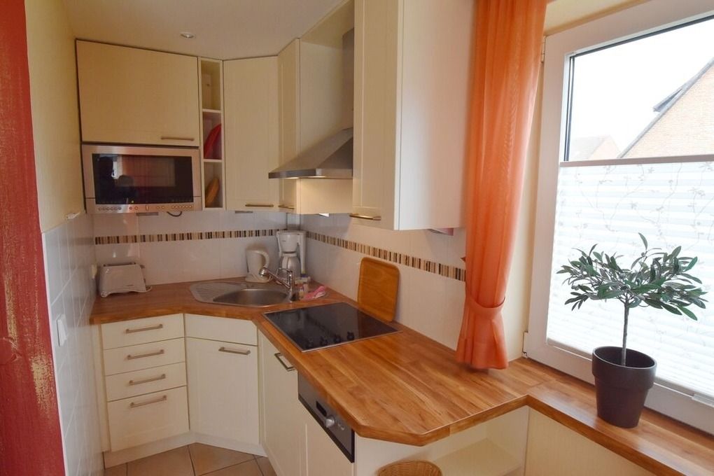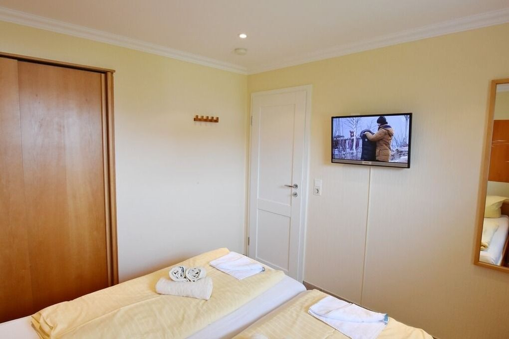 Moderne Ferienwohnung im Erdgeschoss mit Terrasse in südlicher Ausrichtung. Wohnzimmer mit gemütlicher Couch, Essecke für 2 Personen und offener Küchenzeile mit Geschirrspüler und Mikrowelle. Smart-TV und WLAN gehören hier zur Ausstattung. Schlafzimmer mit Doppelbett und zweitem TV. Duschbad mit WC und Waschbecken. Zur Ferienwohnung gehört ein PKW-Stellplatz ( Nr. 4 ) auf dem Grundstück. Im UG befinden sich für die Gäste des Hauses Waschmaschine und Trockner, Nutzung gegen geringe Gebühr. Gerne dürfen Sie hier ein gut erzogenes Haustier mitbringen. Dafür wird dann eine einmalige Haustiergebühr berechnet.