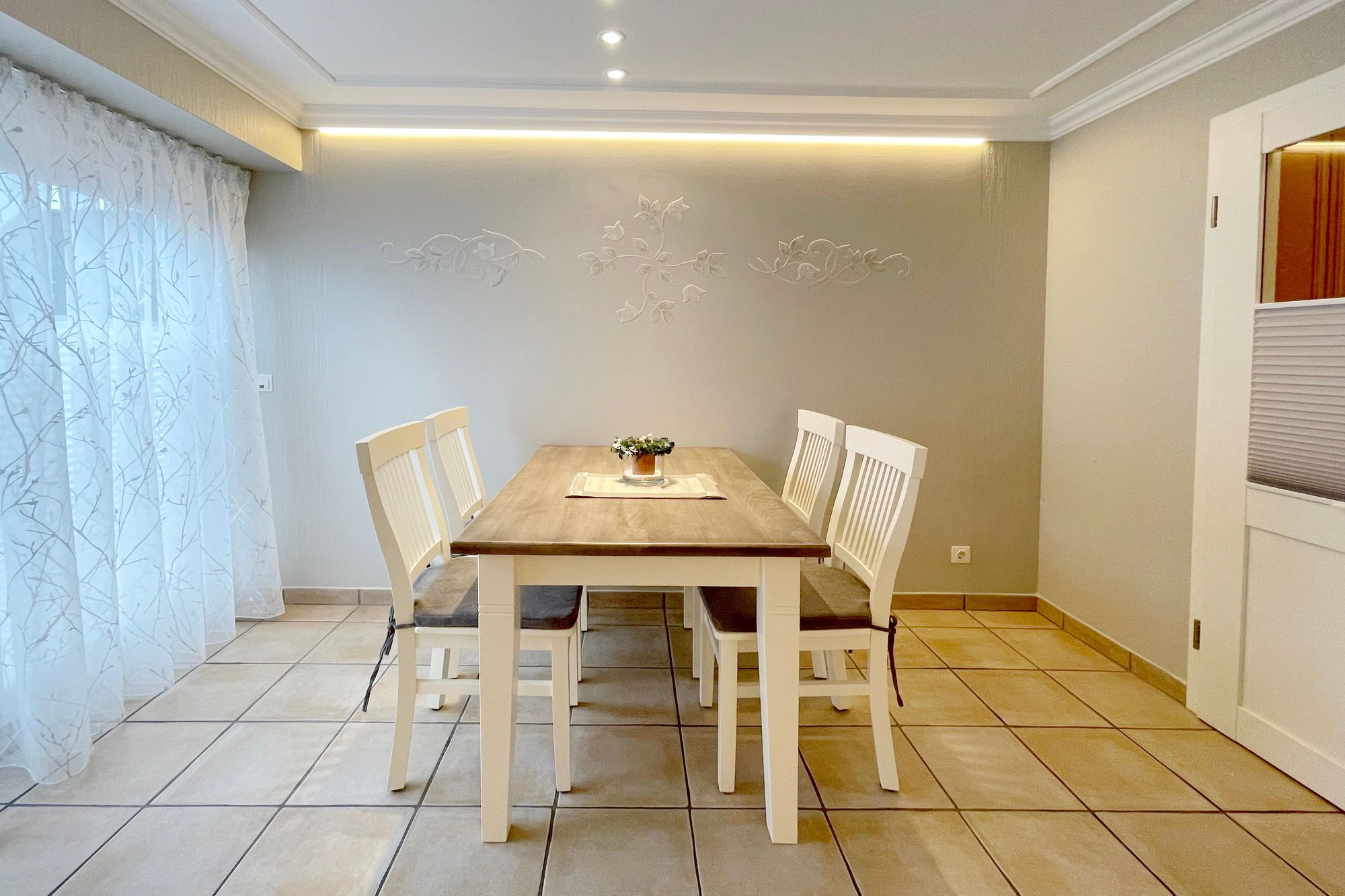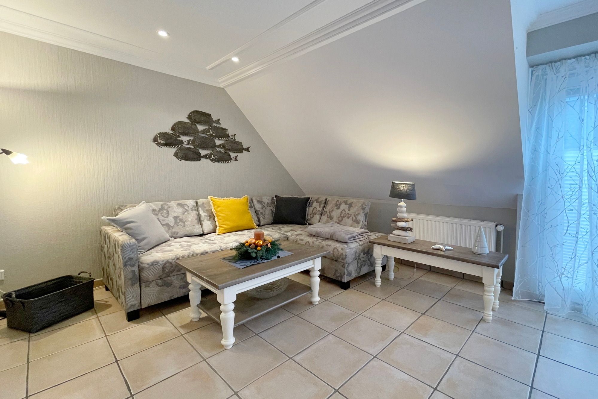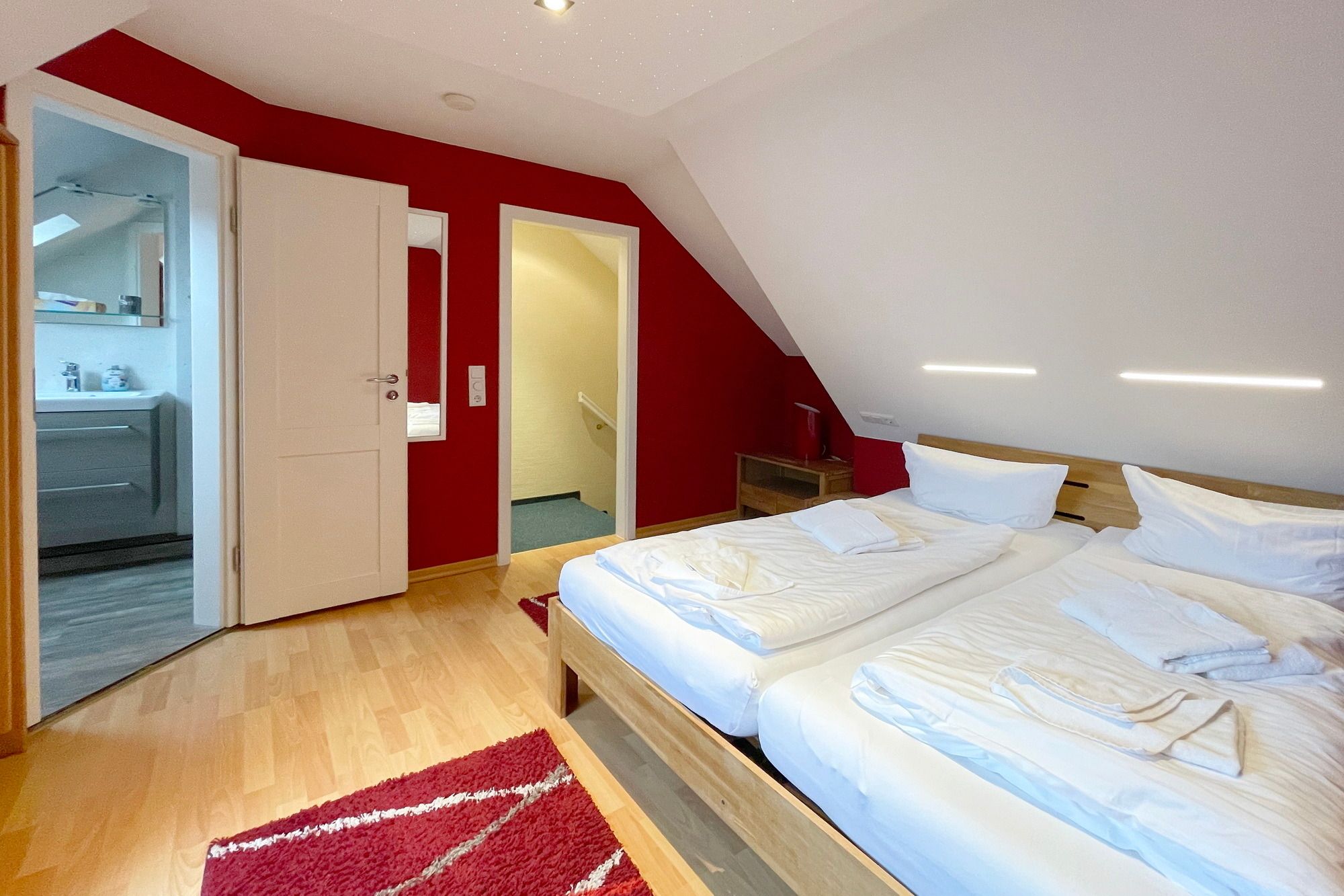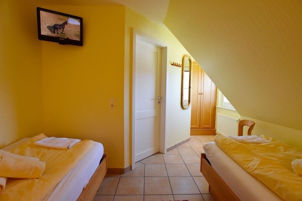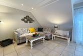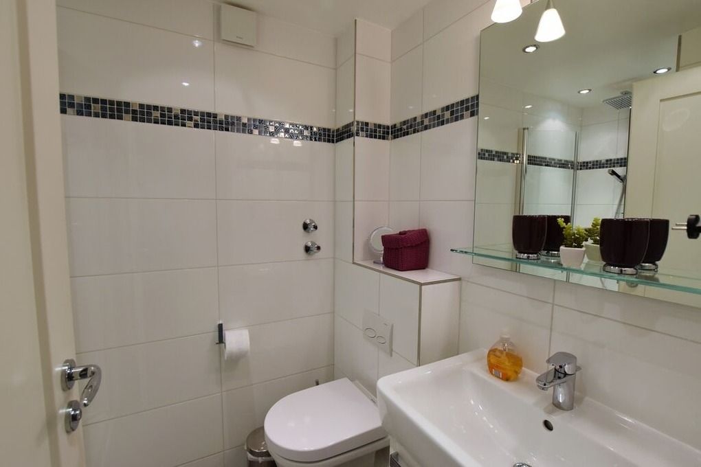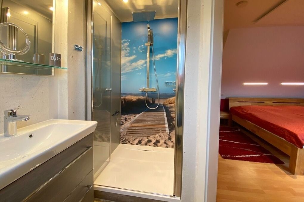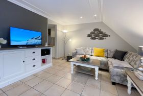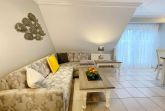 3 Zimmerwohnung mit Balkon (OG und DG), Wohnzimmer mit gemütlicher Sitzgruppe und Eßecke, offene Küche mit Cerankochfeld, und Geschirrspüler, Flatscreen-TV, 2 Schlafzimmer für je 2 Personen mit jeweils eigenem Badezimmer mit Dusche WC und Waschbecken, im UG befinden sich für die Gäste des Hauses Waschmaschine und Trockner gegen Gebühr. 1 PKW-Stellpaltz. Gerne dürfen Sie hier ein gut erzogenes Haustier mitbringen. Dafür wird dann eine einmalige Haustiergebühr berechnet.