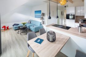 Im Haus gibt es insgesamt 7 Wohneinheiten. Die Meersuite N°7 liegt im 02. OG (Fahrstuhl) und verfügt über ein Schlafzimmer mit Boxspringbett, ein Badezimmer (ebenerdige Dusche) und einen gemütlichen Wohnraum mit Eckcouch, Esstisch, offener Küche und Zugang zum Balkon. Im Wohnraum steht Ihnen der Schlafgiebel mit zwei Einzelbetten als alternative bzw. zweite Schlafgelegenheit zur Verfügung. Hunde sind in dieser Wohnung herzlich willkommen.