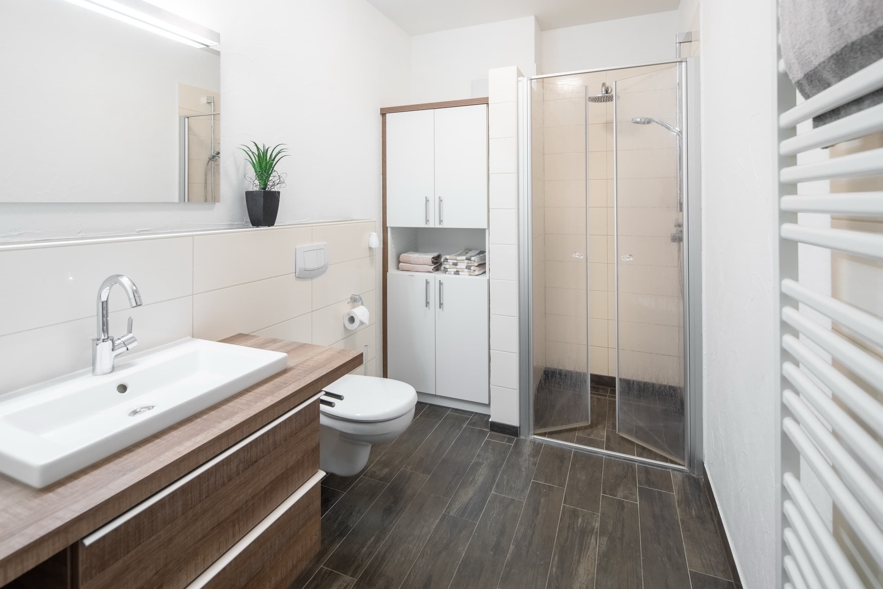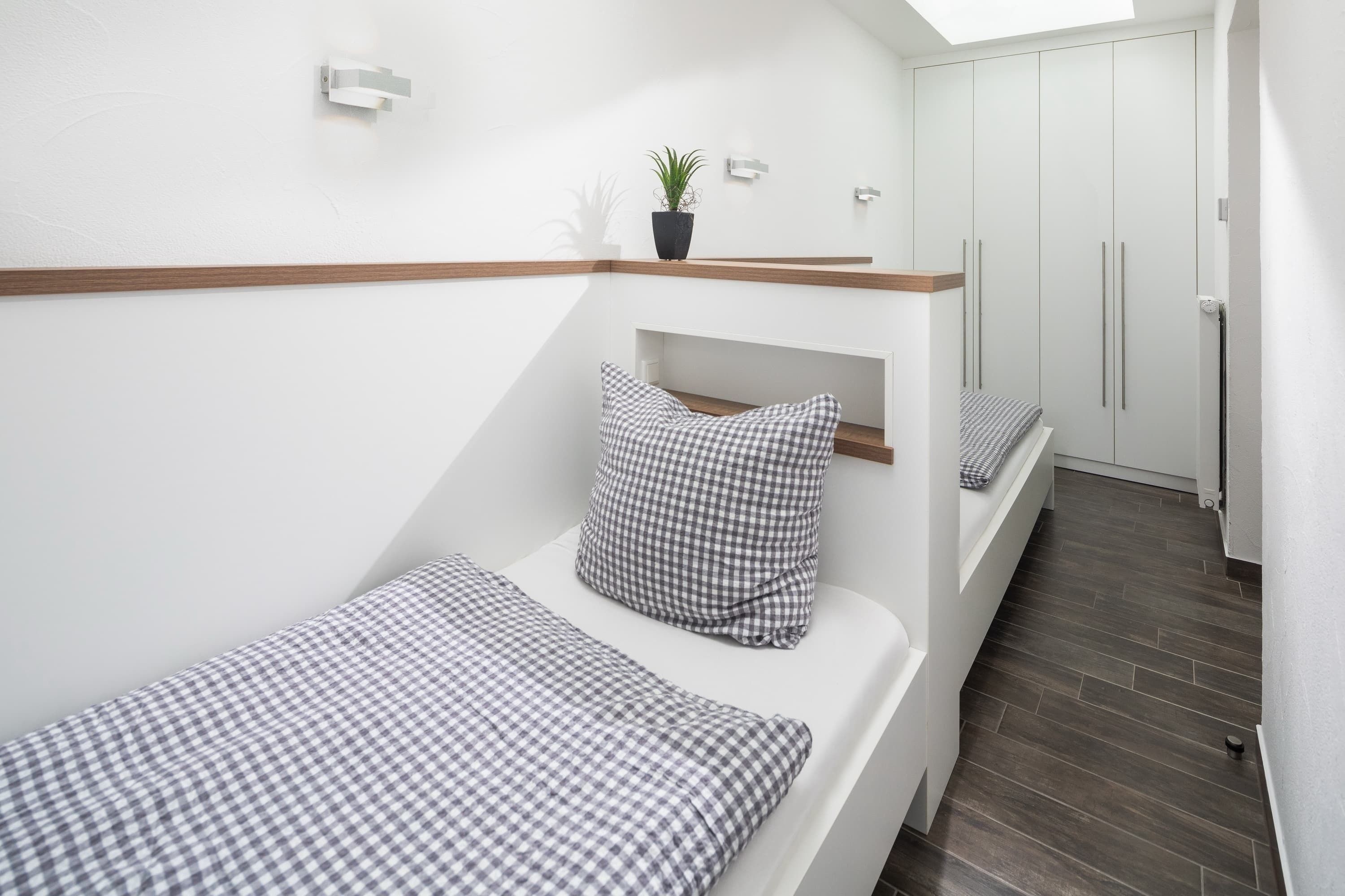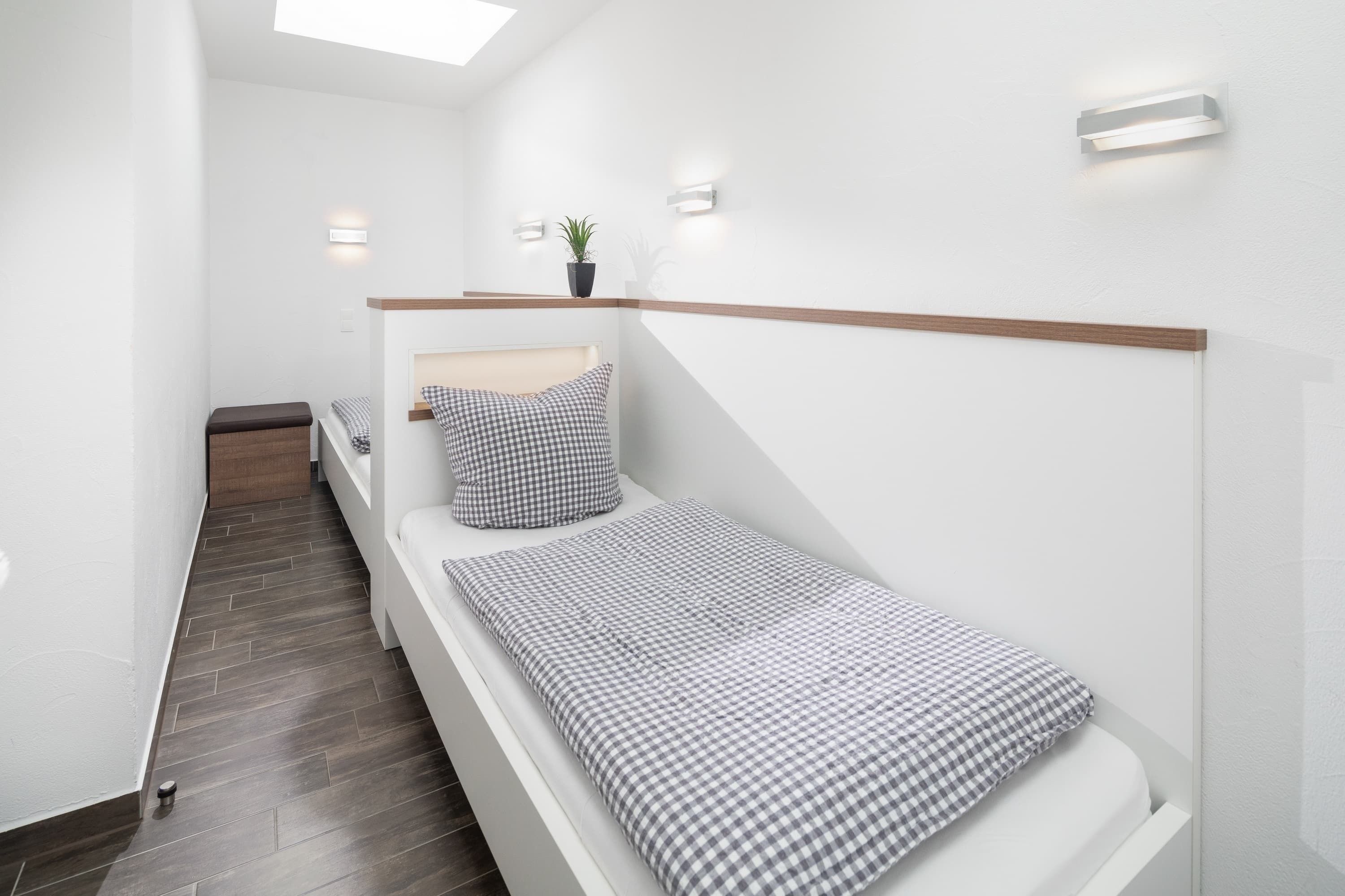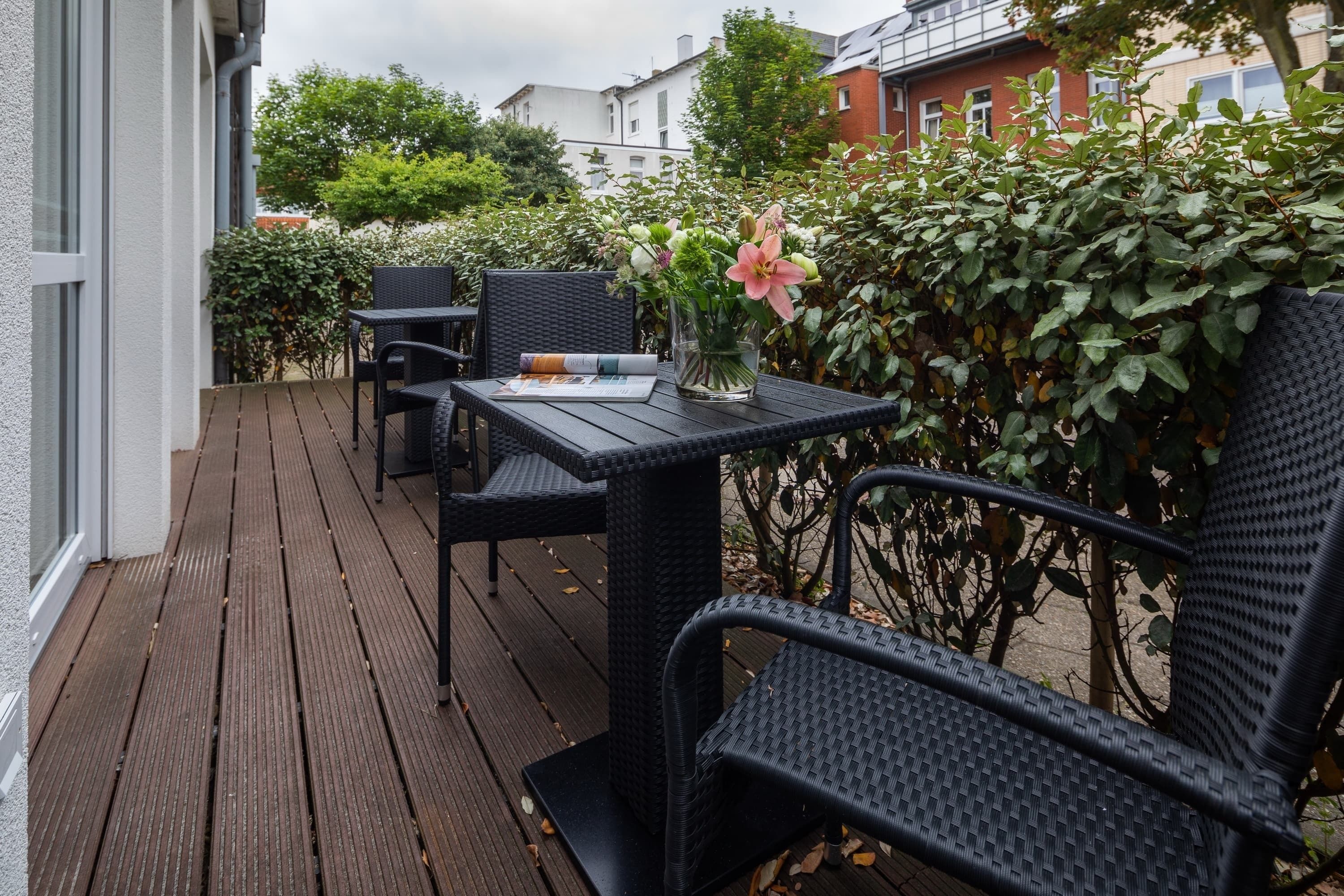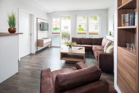 Die „Villa Rossini“ Whg. 3 befindet sich im Erdgeschoss und verfügt über einen großzügigen, modern eingerichteten Wohn-Essbereich mit 2 Flachbildschirmen, eine hochwertig eingerichtete Einbauküche (Spülmaschine, Backofen, etc.), 1 Schlafzimmer mit Doppelbett (1,80m x 2,00m) und 1 Schlafzimmer mit 2 Einzelbetten, Bad und eine Terrasse.