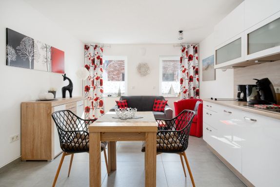 Verbringen Sie entspannte Tage in unserer charmanten Ferienwohnung „Krabbenkutter“. Sie befindet sich im Obergeschoss eines Hauses mit insgesamt fünf Wohneinheiten und bietet auf 45qm Platz für zwei Personen. Der offene Wohn- und Essbereich bietet eine voll ausgestattete, moderne Einbauküche sowie einen Esstisch und eine gemütliche Sitzecke. Im separaten Schlafzimmer schlafen Sie bequem in einem hochwertigen Boxspringbett, ein zweiter Fernseher sorgt für zusätzlichen Komfort. Das helle Tageslichtbad ist großzügig geschnitten und mit einer ebenerdigen Dusche ausgestattet – ideal für einen frischen Start in den Tag. Zur Wohnung gehören außerdem ein eigener Parkplatz sowie ein Abstellraum für Fahrräder, in dem Sie auch E-Bikes laden können. Genießen Sie Greetsiel mit seinem historischen Ortskern, dem romantischen Hafen und der frischen Nordseeluft - die Wohnung „Krabbenkutter“ ist der ideale Ausgangspunkt dafür.