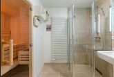 Von dort gelangen Sie über die zu gemütlichen Sonnenstunden einladende Terrasse in den Garten, wo Ihnen ein eigener Strandkorb zur Verfügung steht. Im Untergeschoss schaffen ein individuell von einer örtlichen Tischlerei eingerichtetes Doppelschlafzimmer sowie ein Bad mit bodentiefer Dusche und eine Sauna eine wohlige Atmosphäre. Der zweite ebenso hochwertig ausgestattete Doppelschlafraum befindet sich im Obergeschoss. Auch hier steht ein separates Bad mit bodentiefer Natursteindusche zur Verfügung.