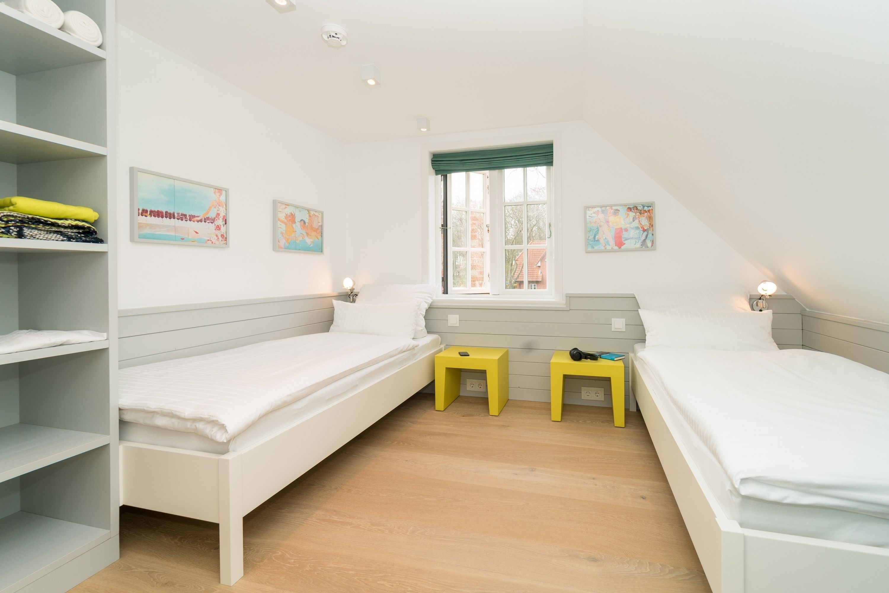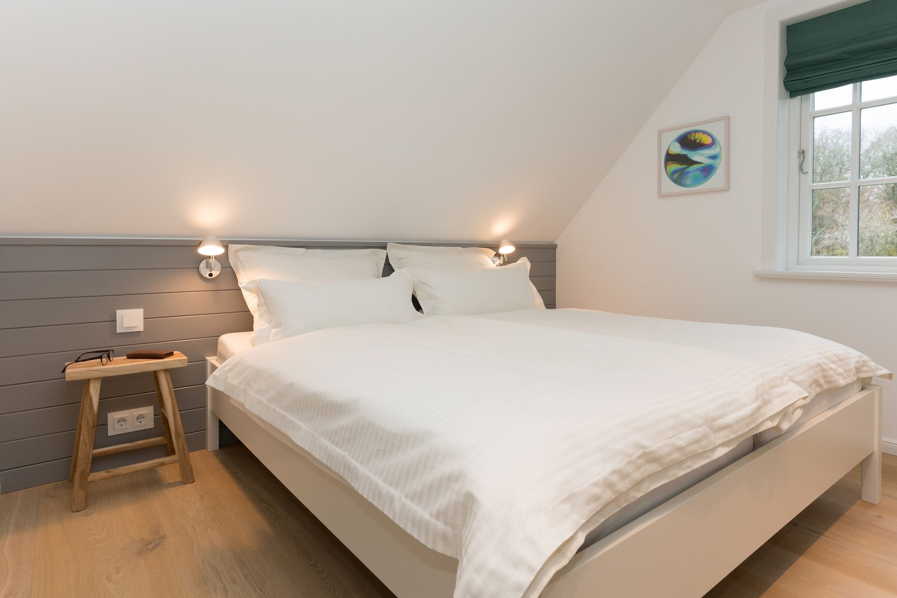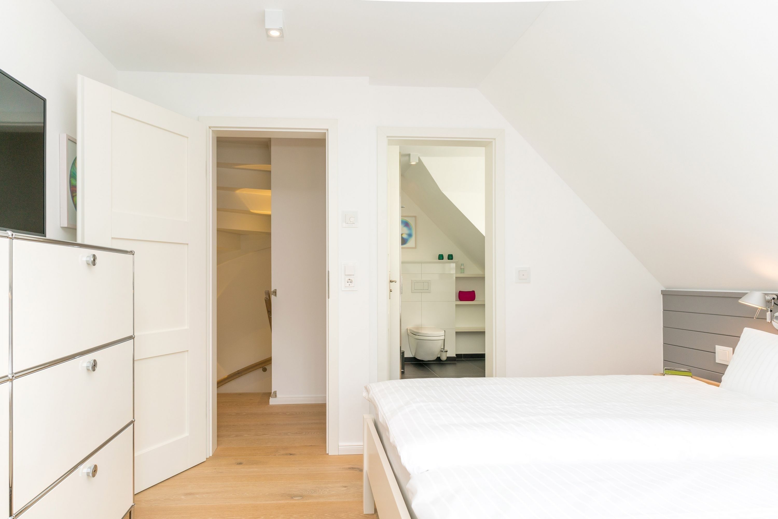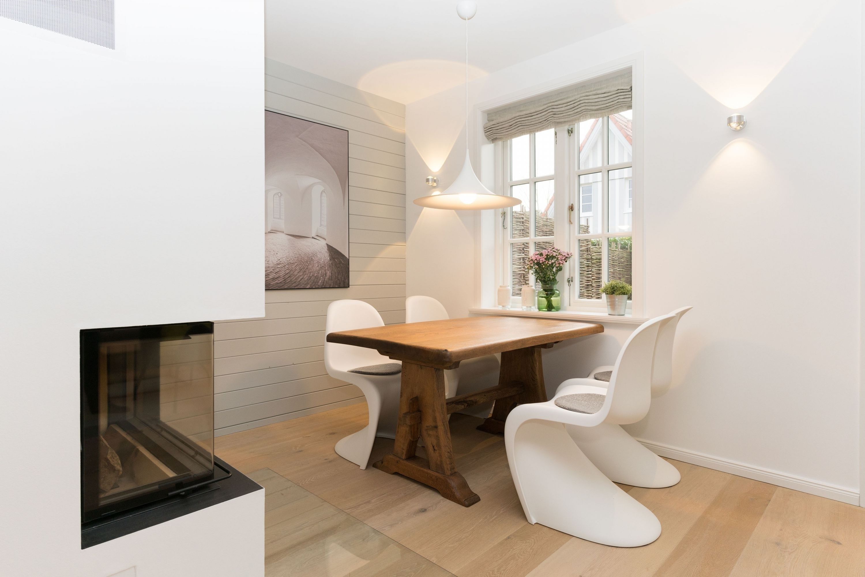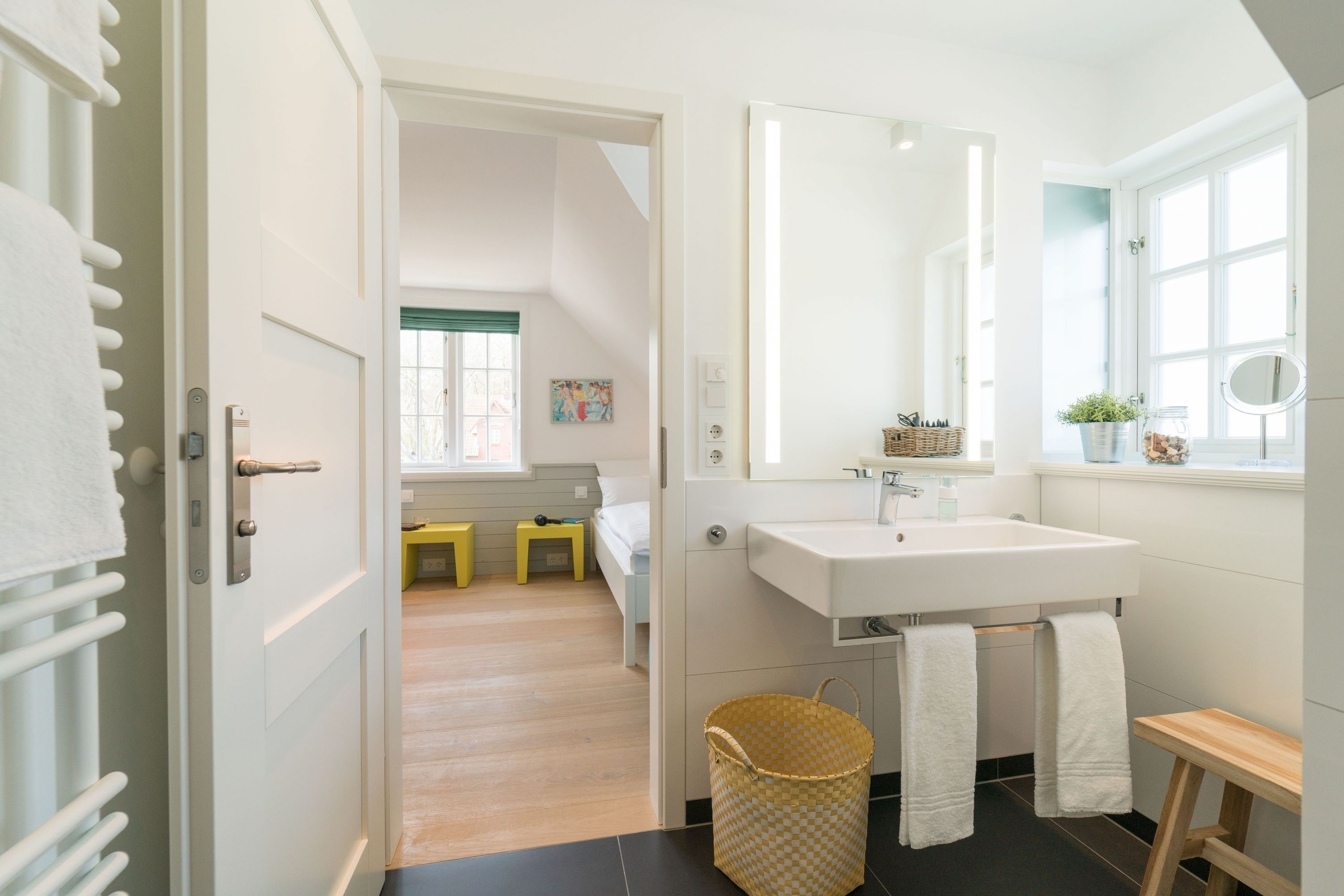 Ferienhaus Leichte Brise Meer, Sonne und immer eine leichte Brise - das ist Föhr und das ist die ruhig und zentral gelegene Leichte Brise“ in Wyk. Moderne, klare Linien, nordische Leichtigkeit, massive Eichendielen und Designklassiker auf 105 qm über 3 Etagen als perfekte Urlaubsbasis für 4 Erwachsene und 1 Kleinkind (bis 3J.). Große Fensterflächen, Artemide und Gubi Leuchten schaffen lichtdurchflutete Räume. Im Erdgeschoss treffen USM Haller und Panton Stühle auf einen alten Eichentisch und eine Küche mit kompletter Ausstattung. Zwei gemütliche Sofas und ein moderner Ohrensessel sind die Relaxgrundlage für Fernsehabende, Lesestunden oder ein gutes Glas Wein am knisternden Kamin. Die Schlafzimmer jeweils mit Bettwäsche in Komfortgröße (155x220) und En-suite Bäder mit großer Dusche, versprechen Erholung im Schlaf. Und falls es im Urlaub doch mal eine E-Mail zu schreiben gibt, finden Sie einen kleinen Arbeitsplatz im Dachgeschoß. Die nach Süden ausgerichtete Terrasse mit großem Tisch und Standkorb schließt die Hausführung ab.