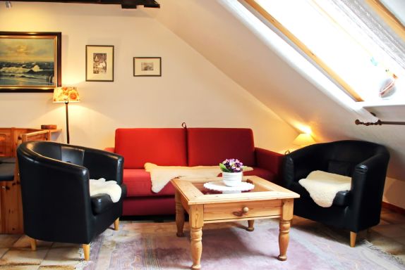gepflegtes 2 Zimmer DG Appartement im Ortskern von Hörnum mit ca. 35m² für bis zu 4 Personen; Ein Wohn-/Schlafraum mit neuer Doppelschlafcouch, zwei Sessel, Tisch, gemütliche Eckbank mit Esstisch und zwei Stühle, kleine offene Einbauküche mit Ceranfeld (2 Platten), Kühlschrank und Mikrowelle, Fernsehtisch mit Sat-Flat-TV, Kommode und Kleiderschrank, separater Schlafraum mit zwei Einzelbetten (zusammenschiebbar); Flur mir Garderobe, neues Duschbad/WC. Das Appartement ist komplett gefliest. Das Rauchen ist nicht gestattet! Die Tierhaltung ist gestattet! Ein PKW-Stellplatz gehört zum Appartement. Kostenloses WLAN!