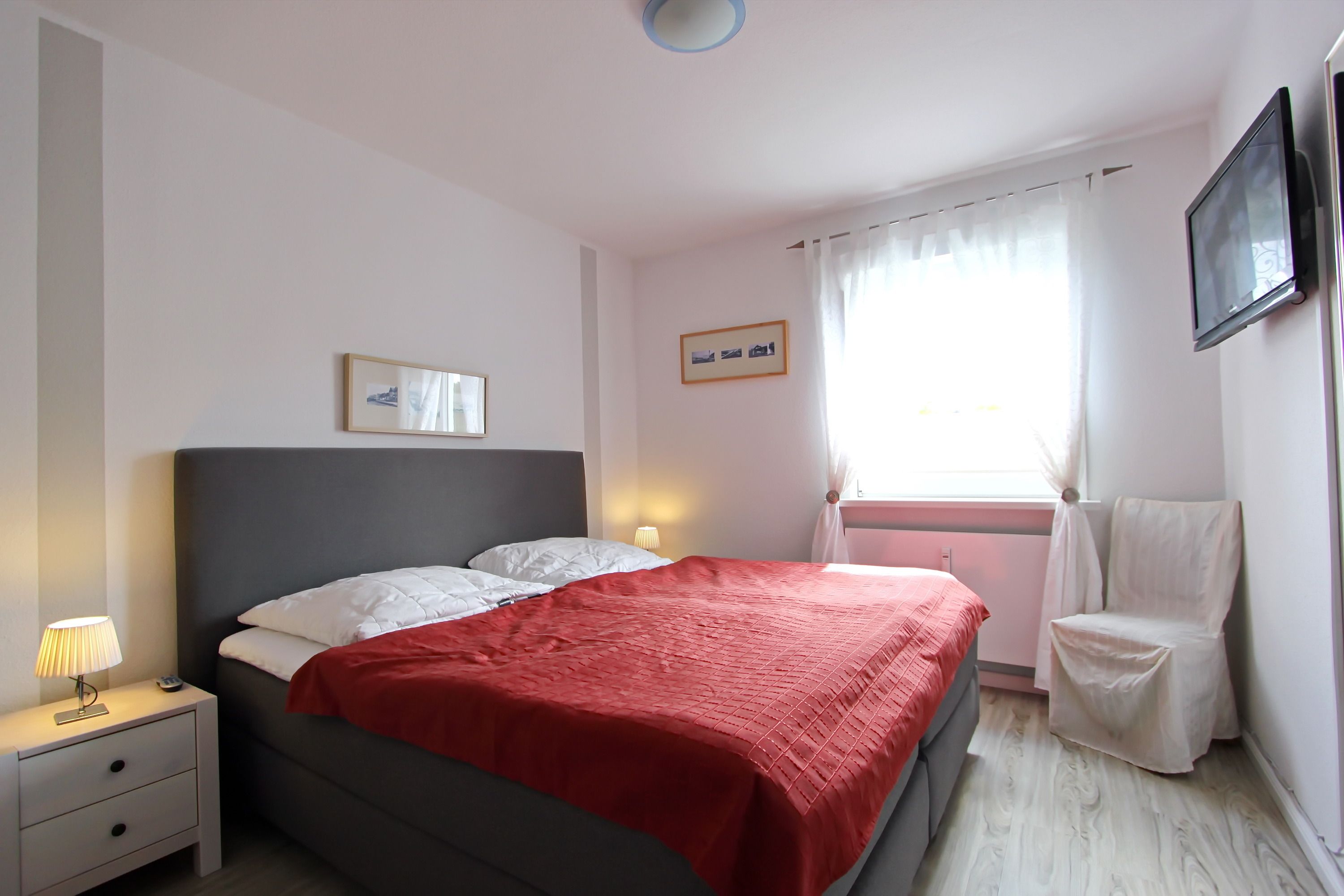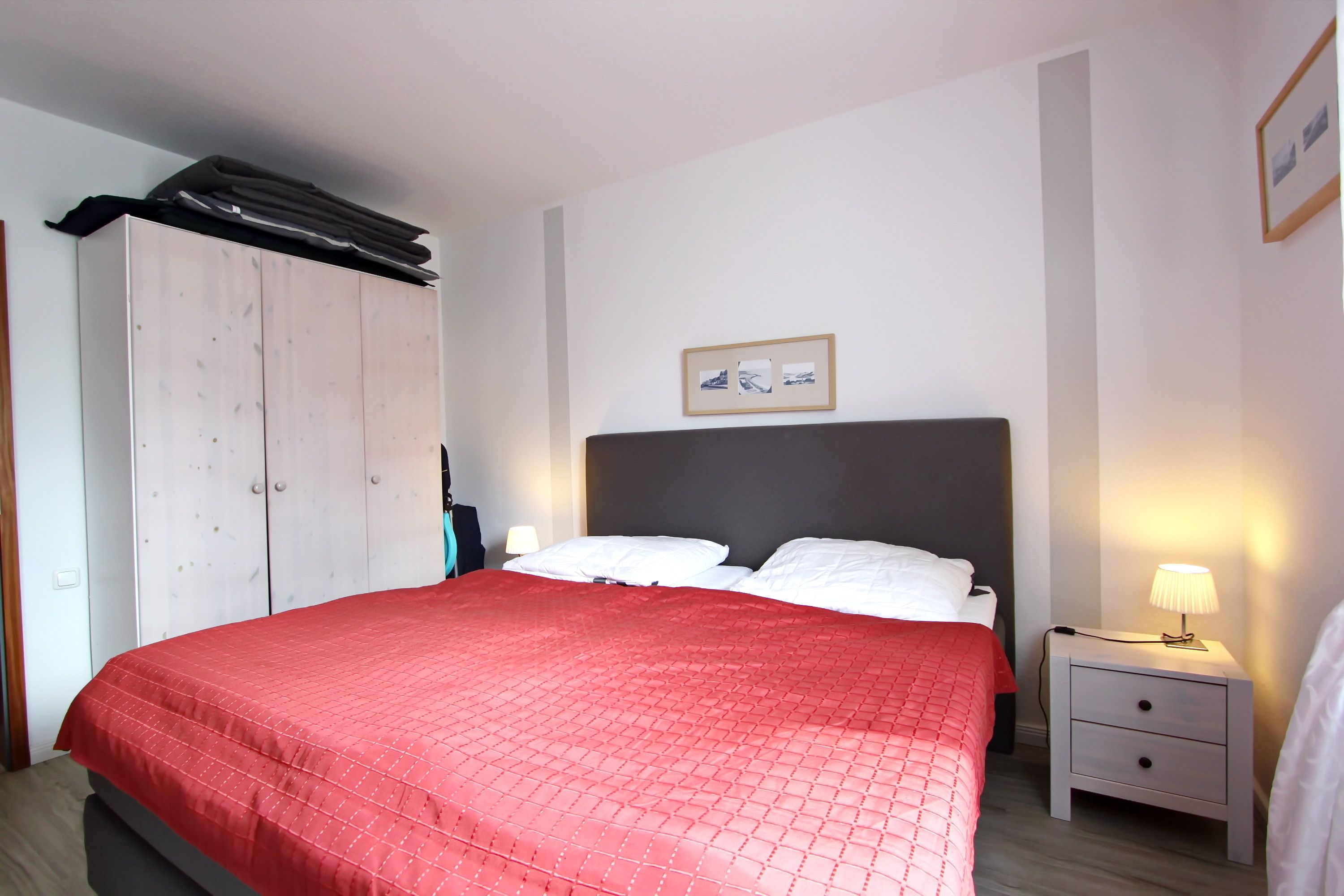 Im kleinen Schlafzimmer befindet sich ein Einzelbett (90 x 200 cm), ein kleiner Nachttisch sowie ein Kindersofa. Im großen Schlafzimmer befindet sich ein Doppelbett (180 x 200 cm) mit zwei Matratzen, Nachtschränke, ein Stuhl sowie ebenfalls ein Flatscreen-TV. Ein 3-türiger Kleiderschrank bietet ausreichend Stauraum. Das Bad verfügt über ein Wannenbad mit Duschtrennwand sowie ein Waschtisch und das WC.