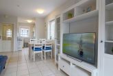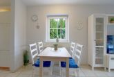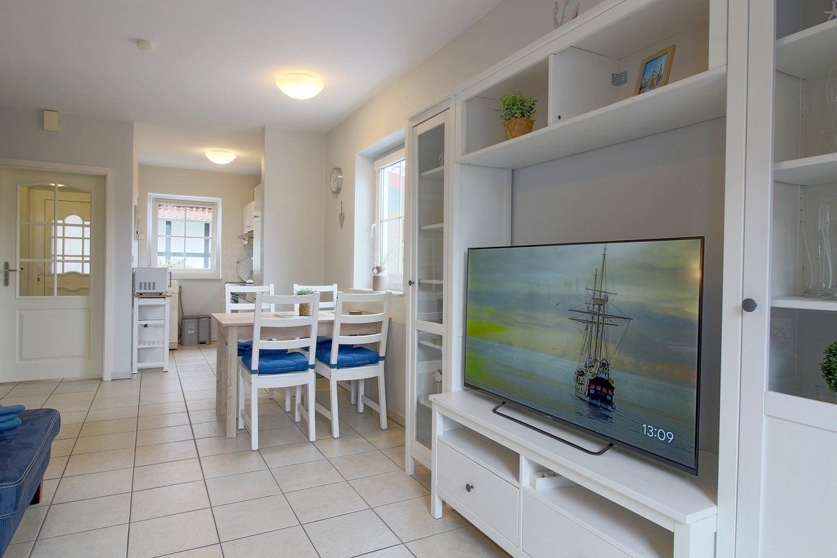 Das Haus verfügt über einen gefliesten Wohn- und Essbereich mit Smart TV im EG mit Ausgang zur Terrasse. Eine kleine voll ausgestattete Arbeitsküche mit Geschirrspüler und Waschmaschine, Gäste WC und Abstellraum.