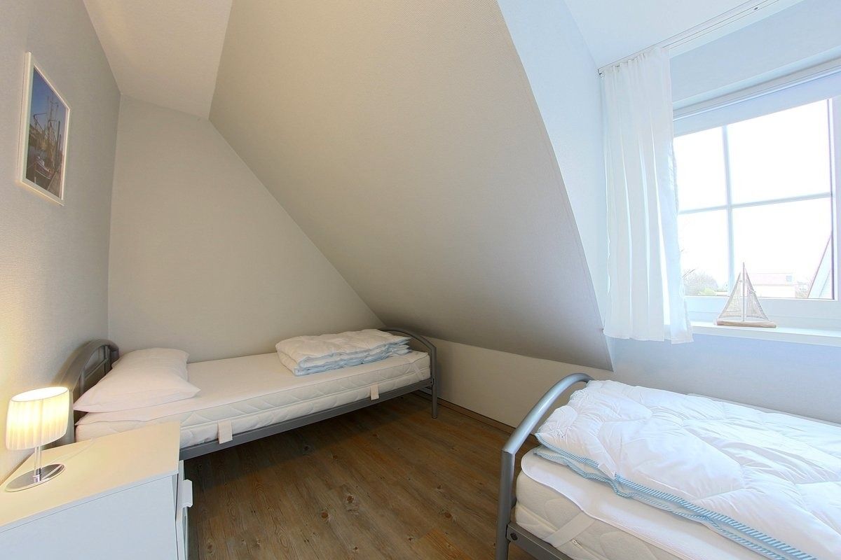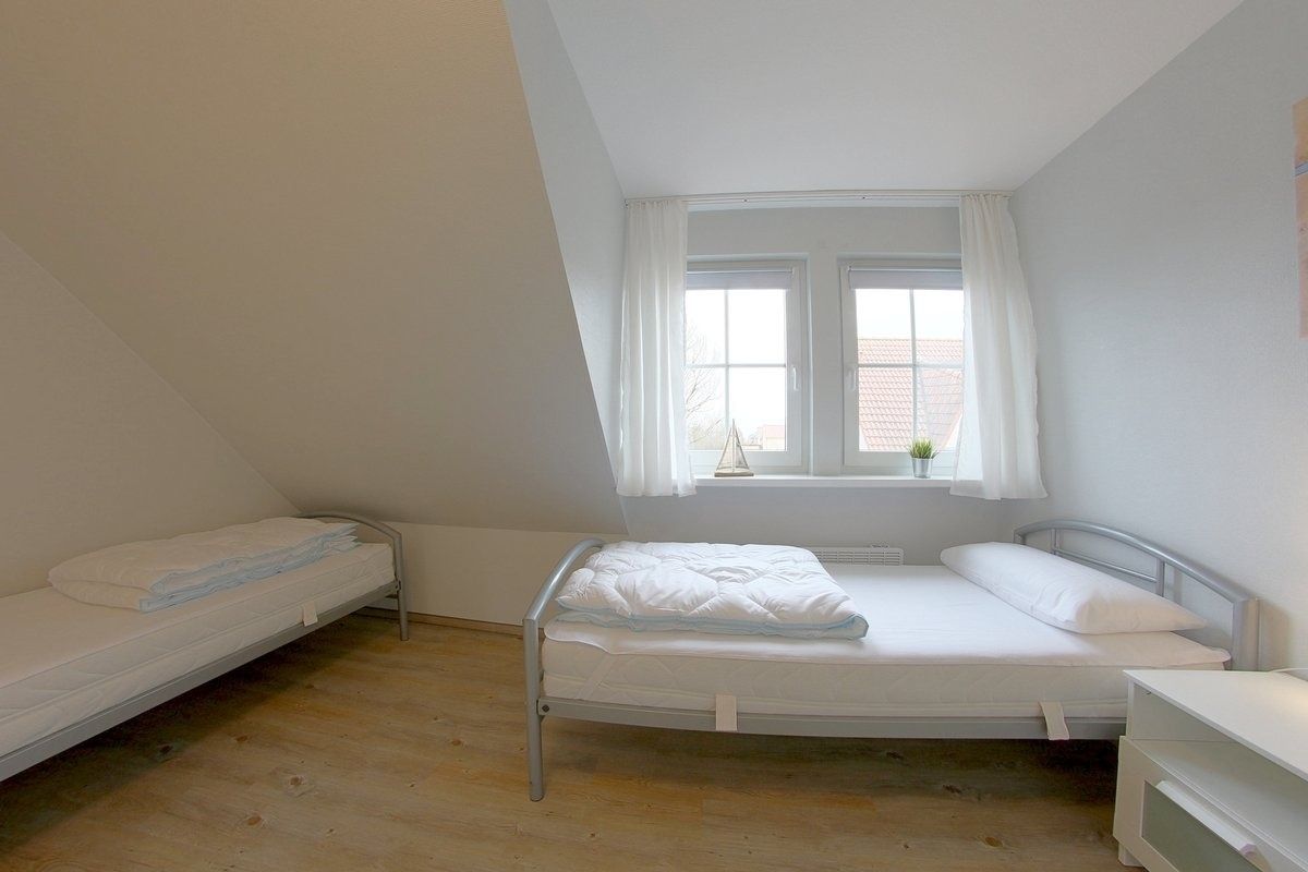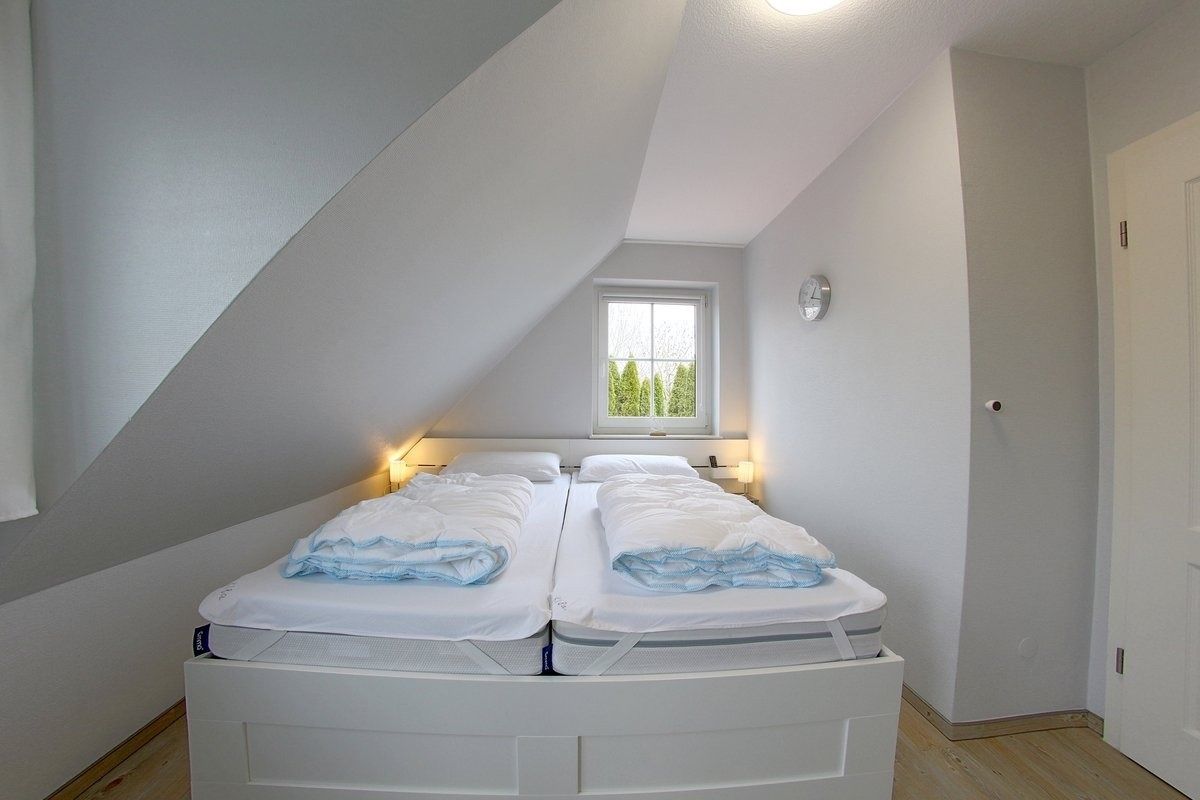 Im Obergeschoss befinden sich zwei Schlafzimmer, eins mit Doppelbett mit Smart TV und eins mit 2 Einzelbetten, sowie ein hell gefliestes Duschbad mit Regendusche, Fußbodenheizung und Fenster. Vinylbelag befindet sich in den oberen Räumen.