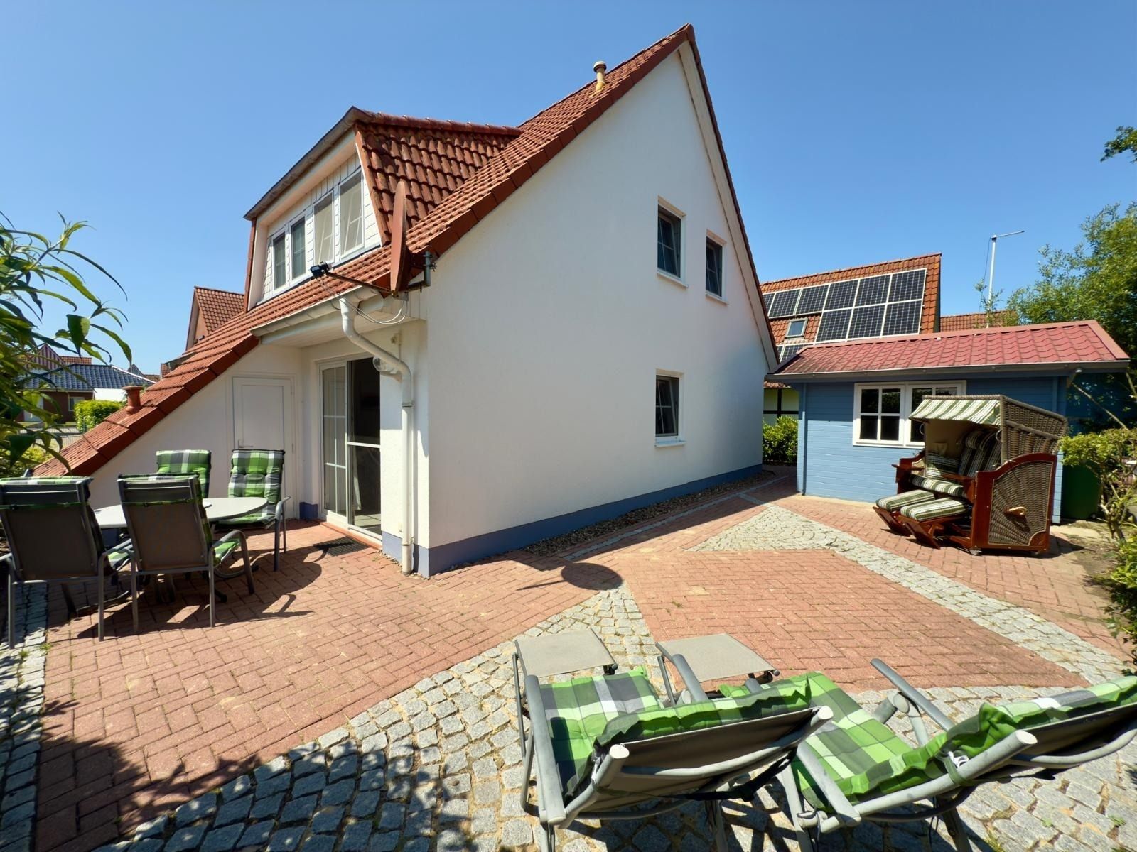 Auf der sonnigen Terrasse mit Gartenmöbeln, Strandkorb und Gartenhaus können Sie relaxen und die Sonne genießen. Bis zum Deich mit Kutterhafen , Wellenfreibad und Grünstrand sind es nur wenige Gehminuten.