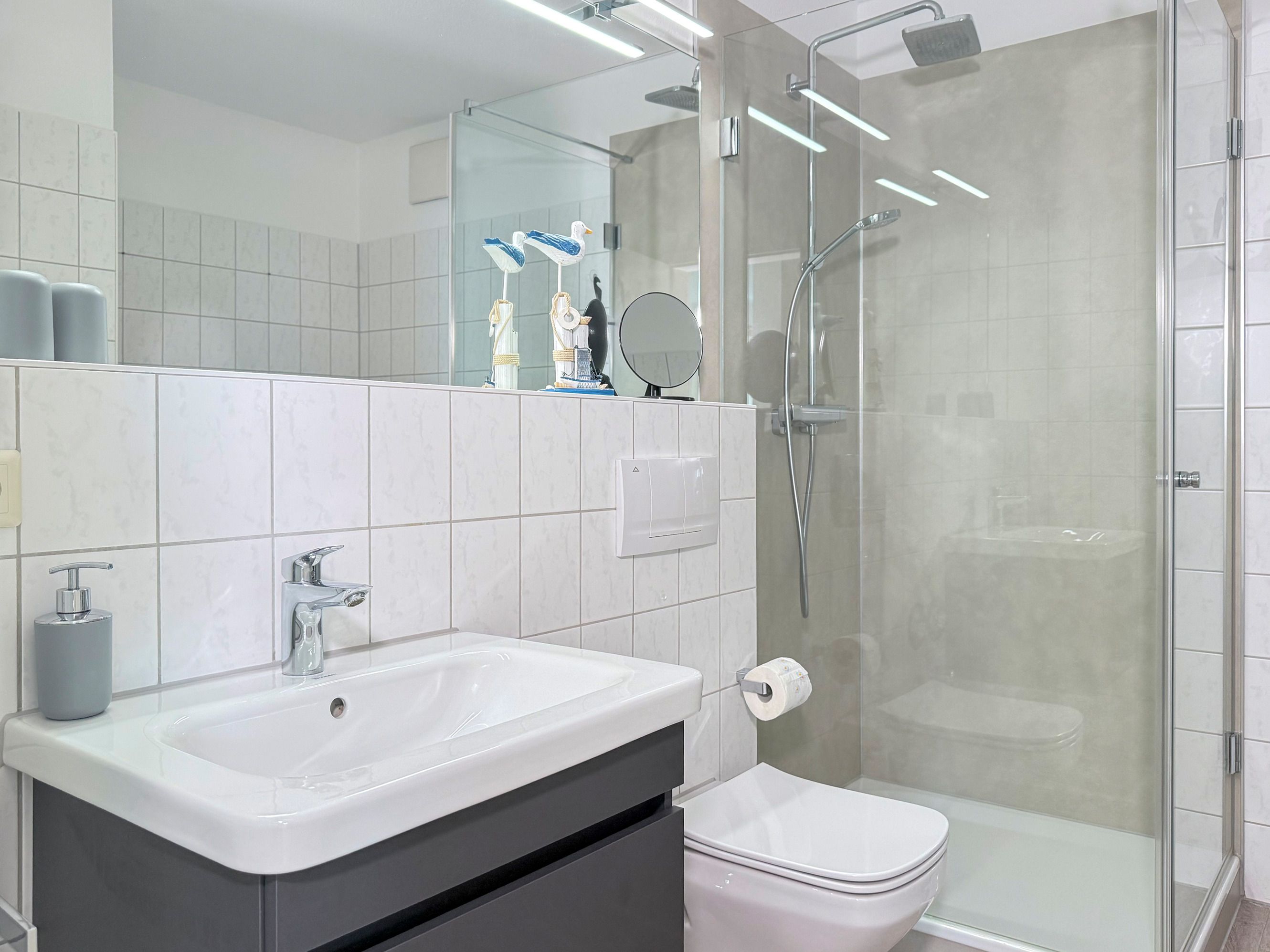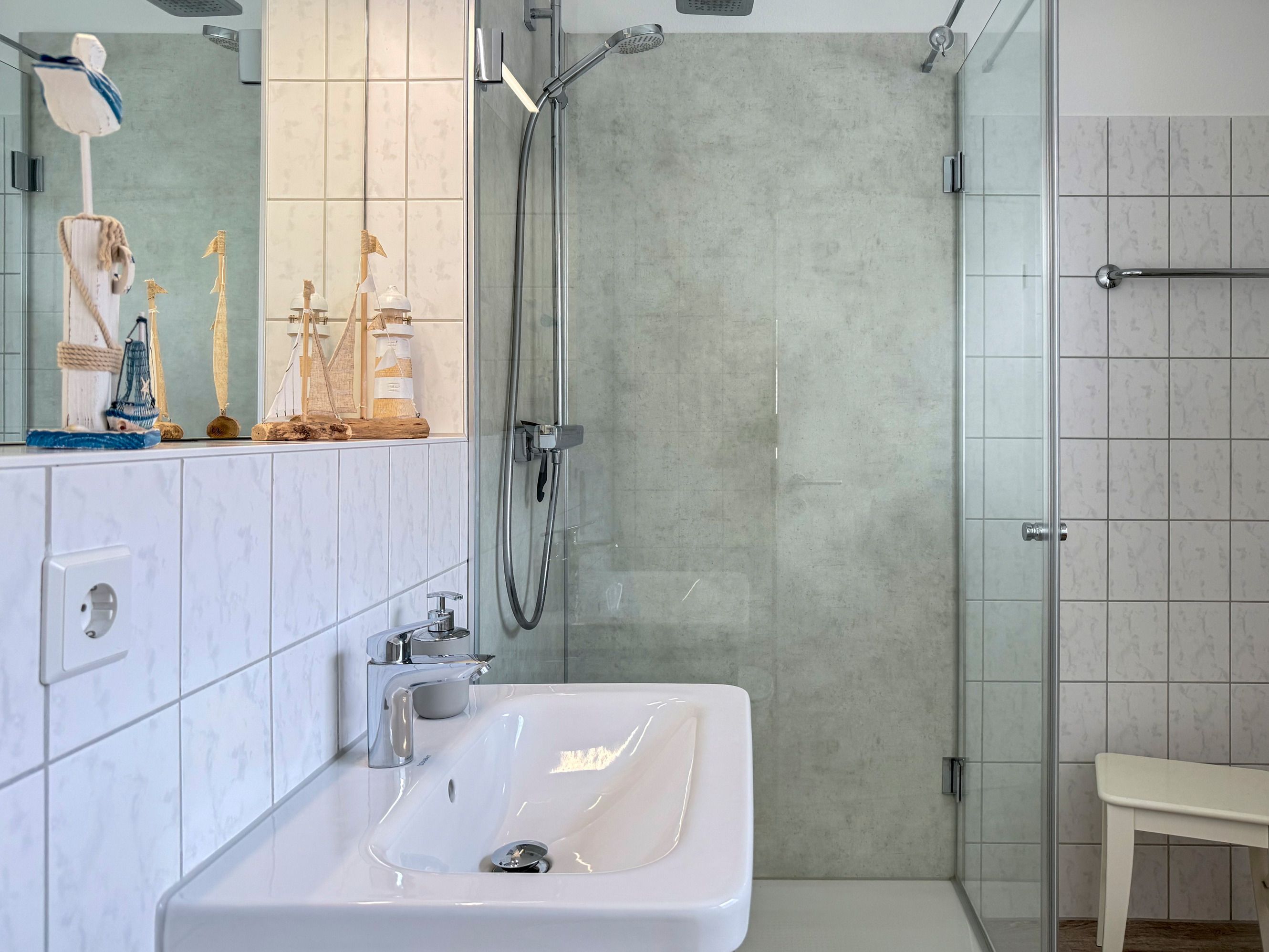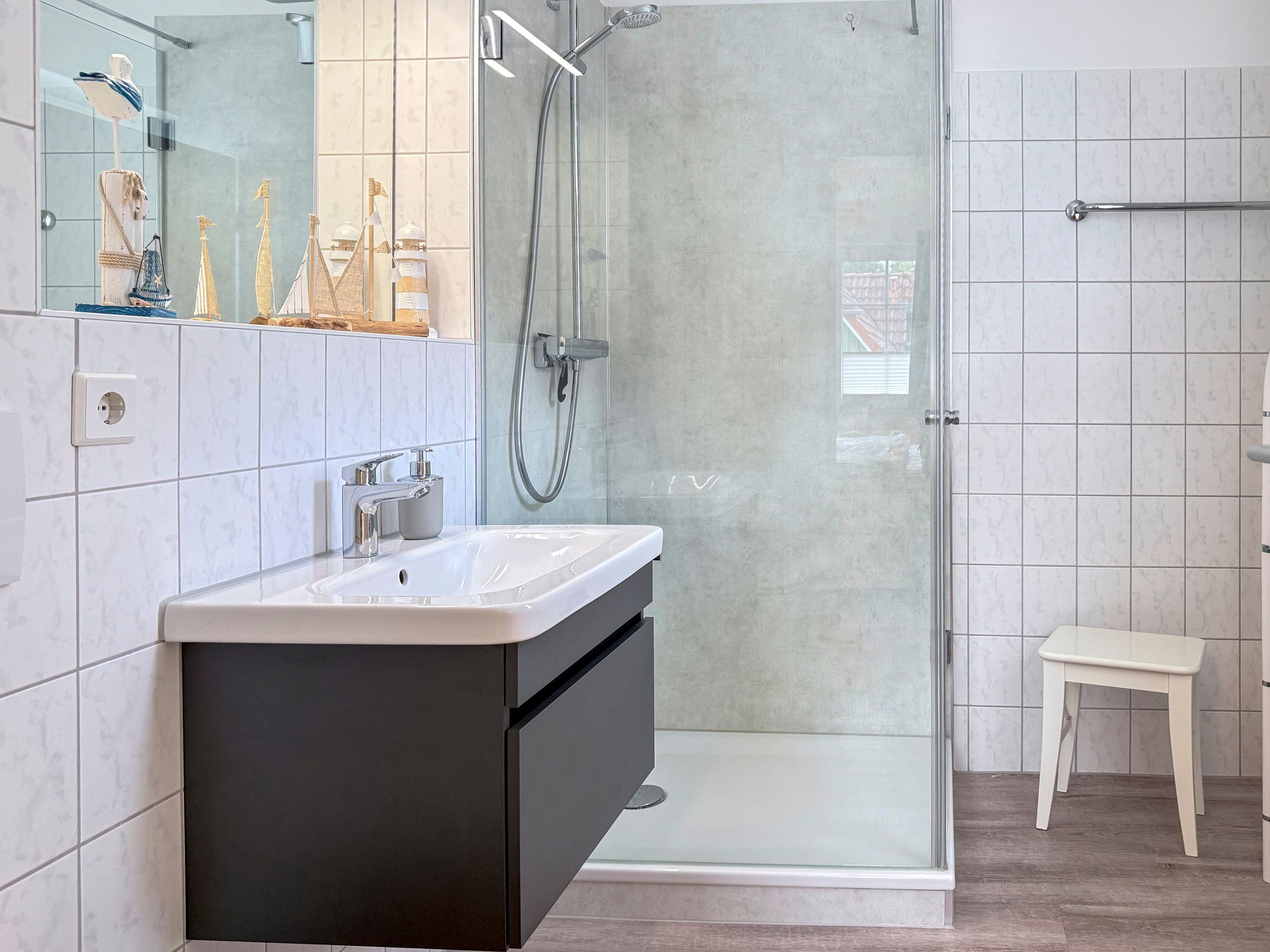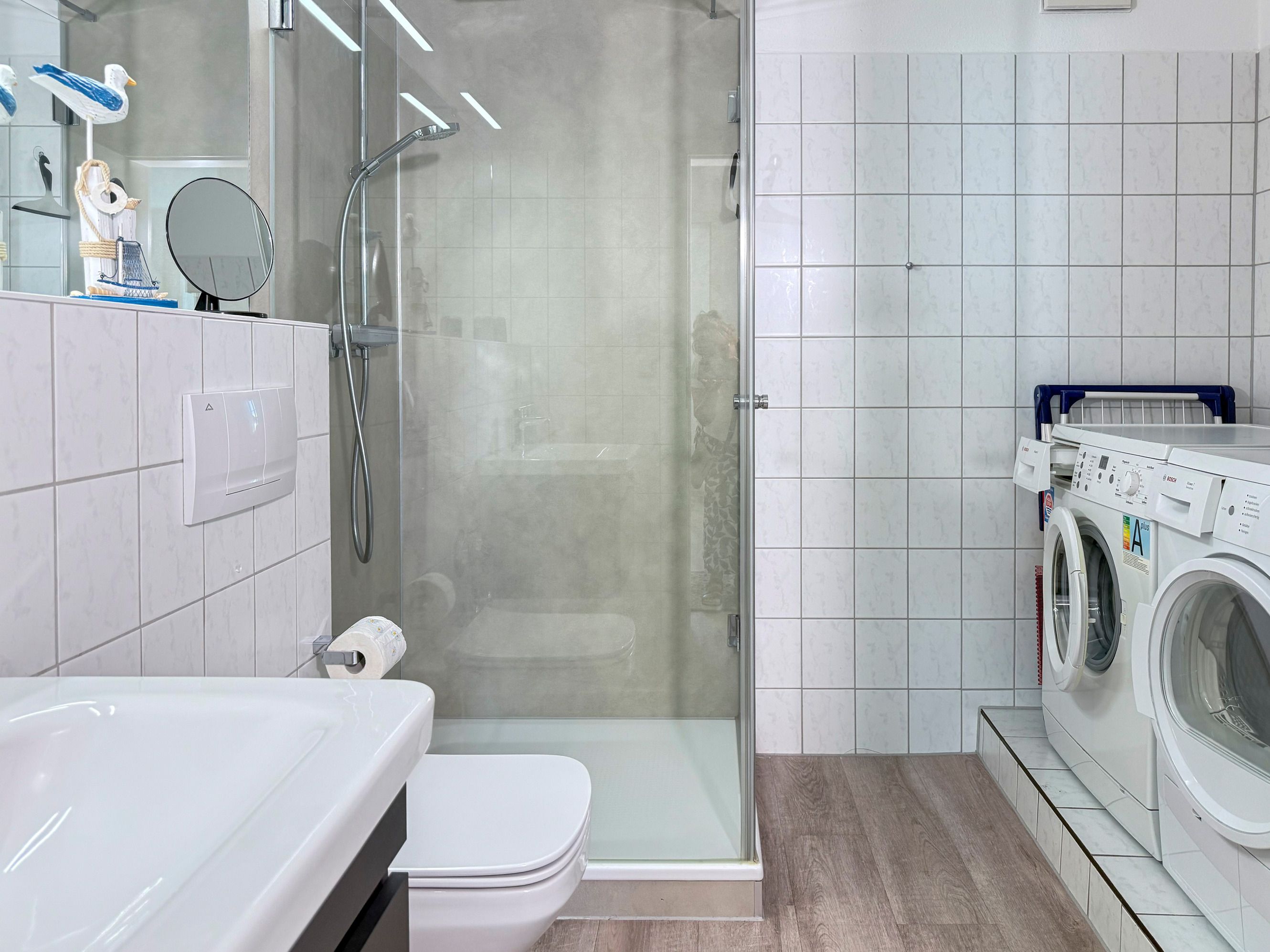 Badezimmer: Mit ebenerdiger Dusche und Waschmaschine.