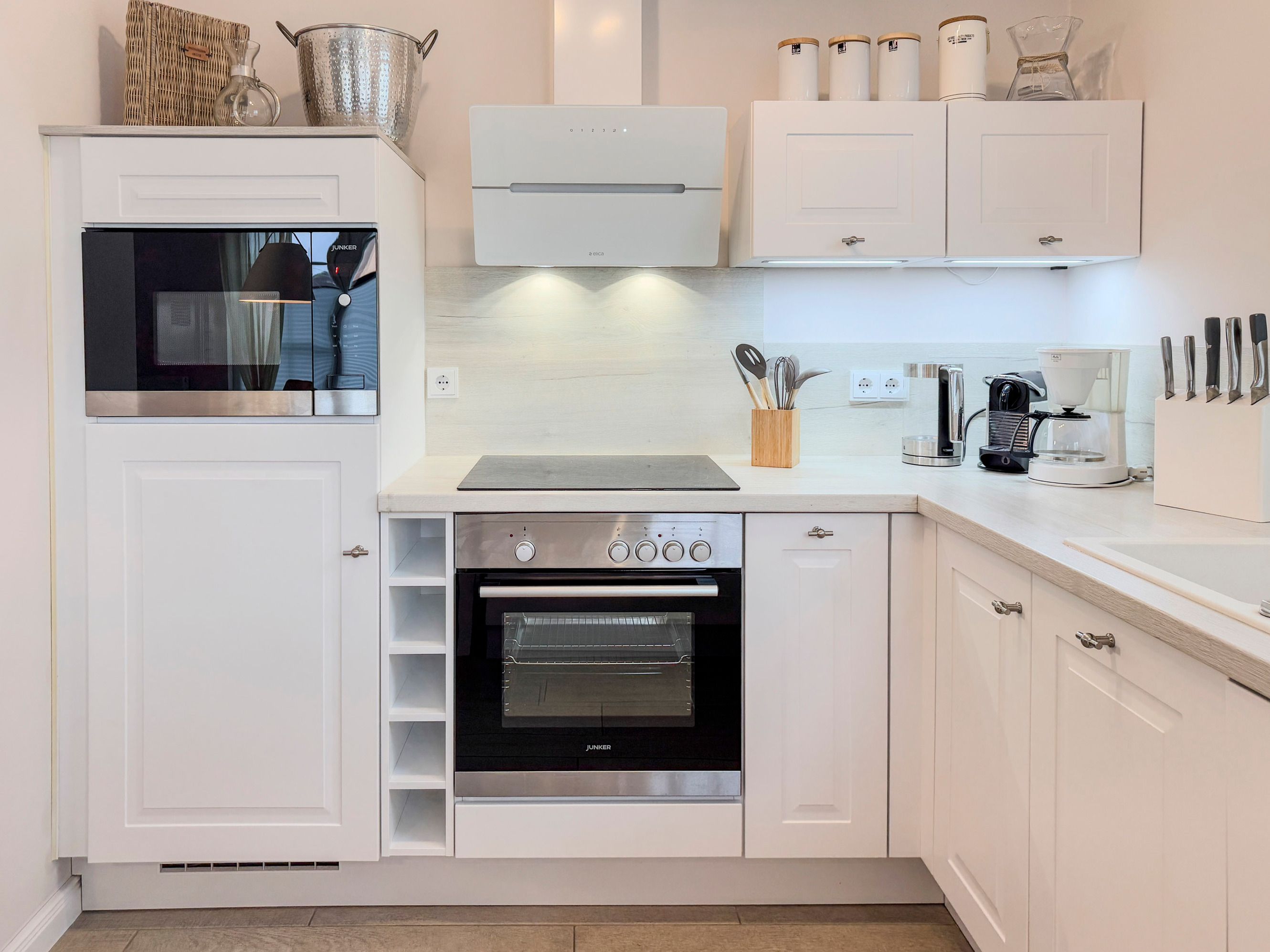 Moderne Küche ausgestattet mit Geschirrspüler, Kaffeevollautomat, Backofen und Mikrowelle