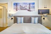 Maritimes Schlafzimmer mit hochwertigem Boxspringbett und zusätzlichem TV