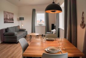 Hier stehen unseren Feriengästen 4 neue hochmoderne Ferienappartements mit einer Wohnfläche von 46 m² mit Platz für 2-4 Personen jeglichen Alters zur Verfügung. Besonders der hohe Wohnkomfort und die gemütliche Einrichtung sorgen für einen herausragenden Wohlfühlfaktor. Die hellen, freundlichen Räume sorgen für ein angenehmes Raumklima und sind thematisch an das maritime Flair der Hansestadt Wismar angelehnt. Zu jedem Appartement gehört ein kostenfreier PKW-Stellplatz direkt am Haus. Eine W-LAN Flatrate steht Ihnen ebenfalls kostenlos zur Verfügung.