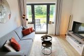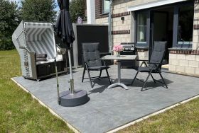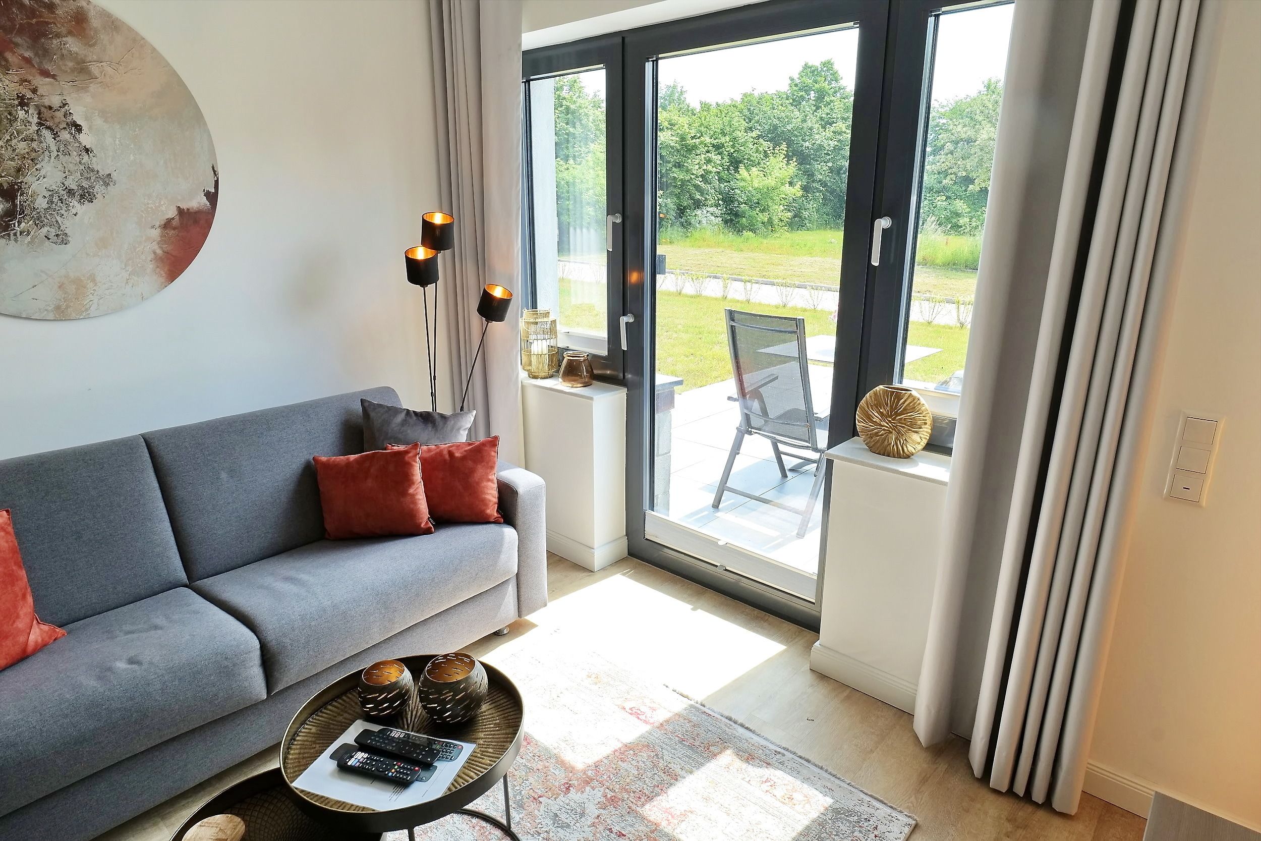Das 2-Zimmer-Komfort-Ferienappartement RuheOase No. 12 ist ideal für unser Gäste, die gemeinsam mit ihrem Hund den Urlaub verbringen möchten. Das Appartement besitzt eine saisonal möblierte Südterrasse. Genießen Sie von der Terrasse im Strandkorb sitzend den Blick auf den Golfplatz und sehen Sie in der Ferne die Ostsee.