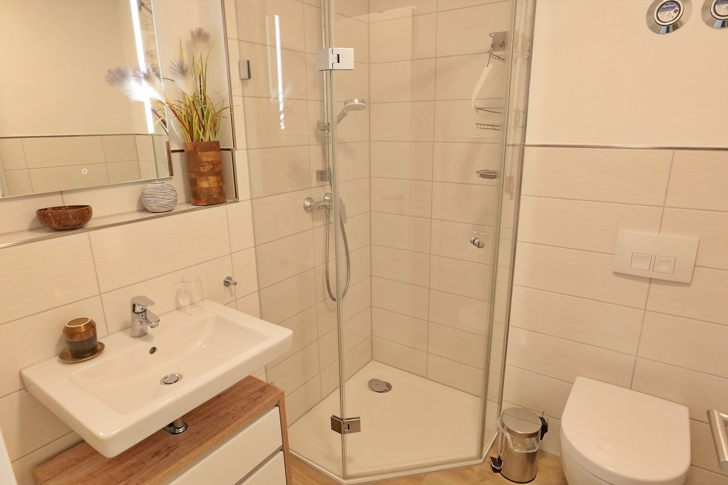 Das Ferienappartement verfügt zudem über ein Duschbad mit Waschtisch, WC und Handtuchheizung. Es handelt sich um eine Wohneinheit in der nicht geraucht werden darf. Hunde sind willkommen. Für mitgebrachte Fahrräder oder für Ihr Golfgepäck stehen abschließbare Fahrradboxen bereit. Ihren PKW parken Sie kostenfrei auf einem reservierten Außenstellplatz. E-Ladesäulen in 100 Meter Entfernung.