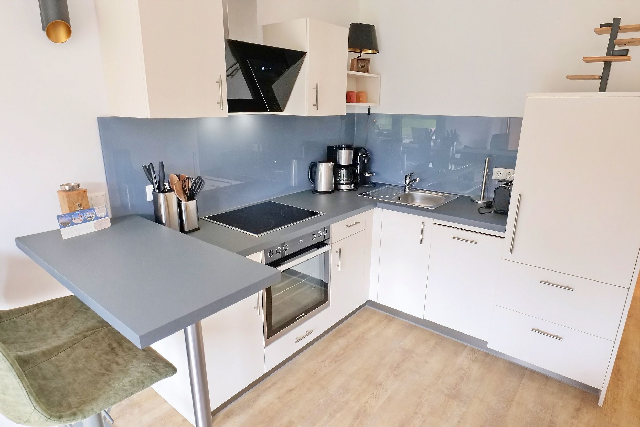 Eine in den Wohnraum integrierte, voll ausgestattete Wohnküche ermöglicht Ihnen bei Bedarf die Selbstversorgung, wodurch Sie Ihren Aufenthalt völlig unabhängig gestalten können. Ihren steht eine Filterkaffeemaschine und eine Nespresso Maschine (Kapsel - Selbstversorgung) zur Verfügung. Erholsam nächtigen Sie in dem separaten Schlafzimmer mit Außenfenster, welches mit einem behaglichem Doppelbett und Fernseher sowie einem Safe ausgestattet ist.