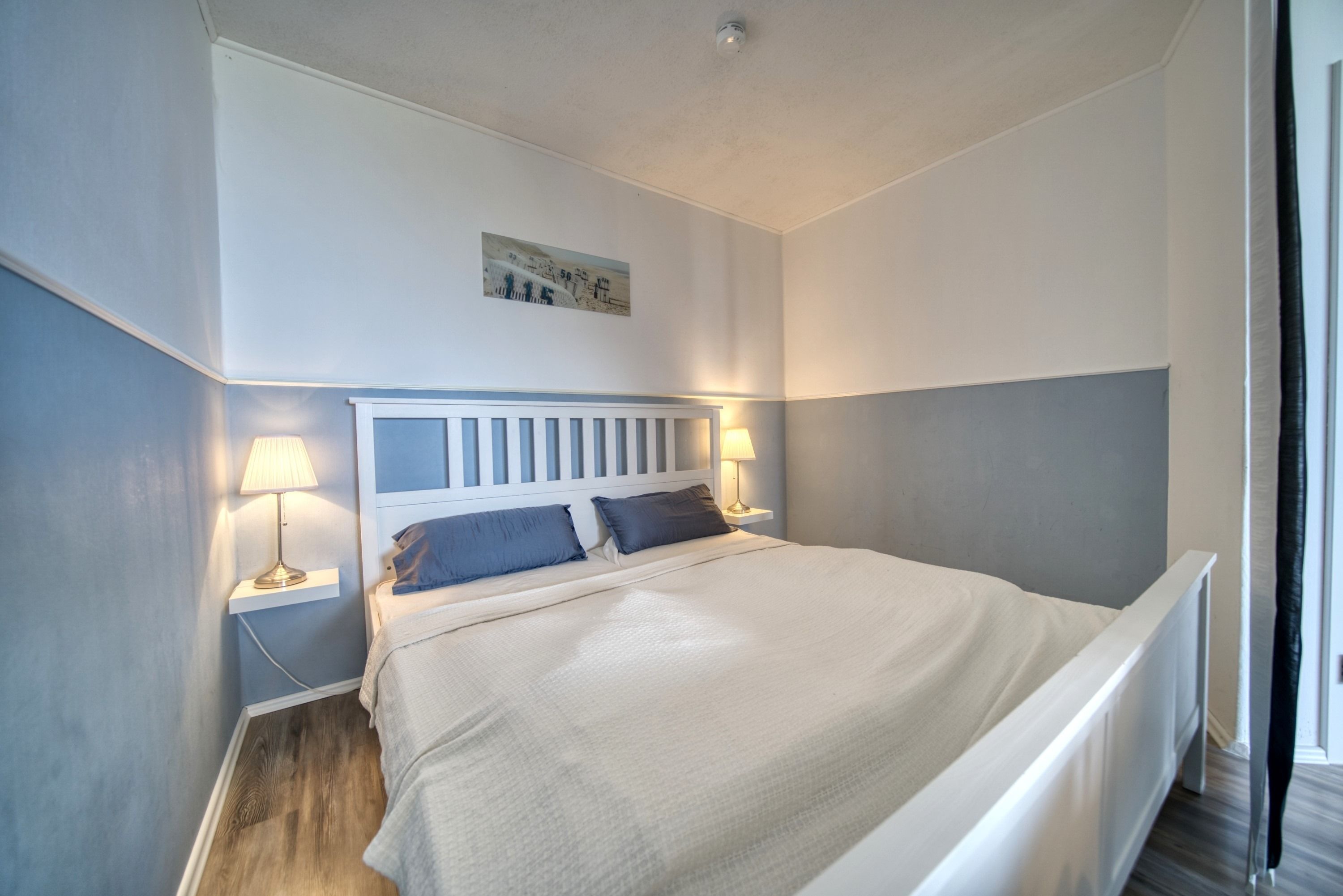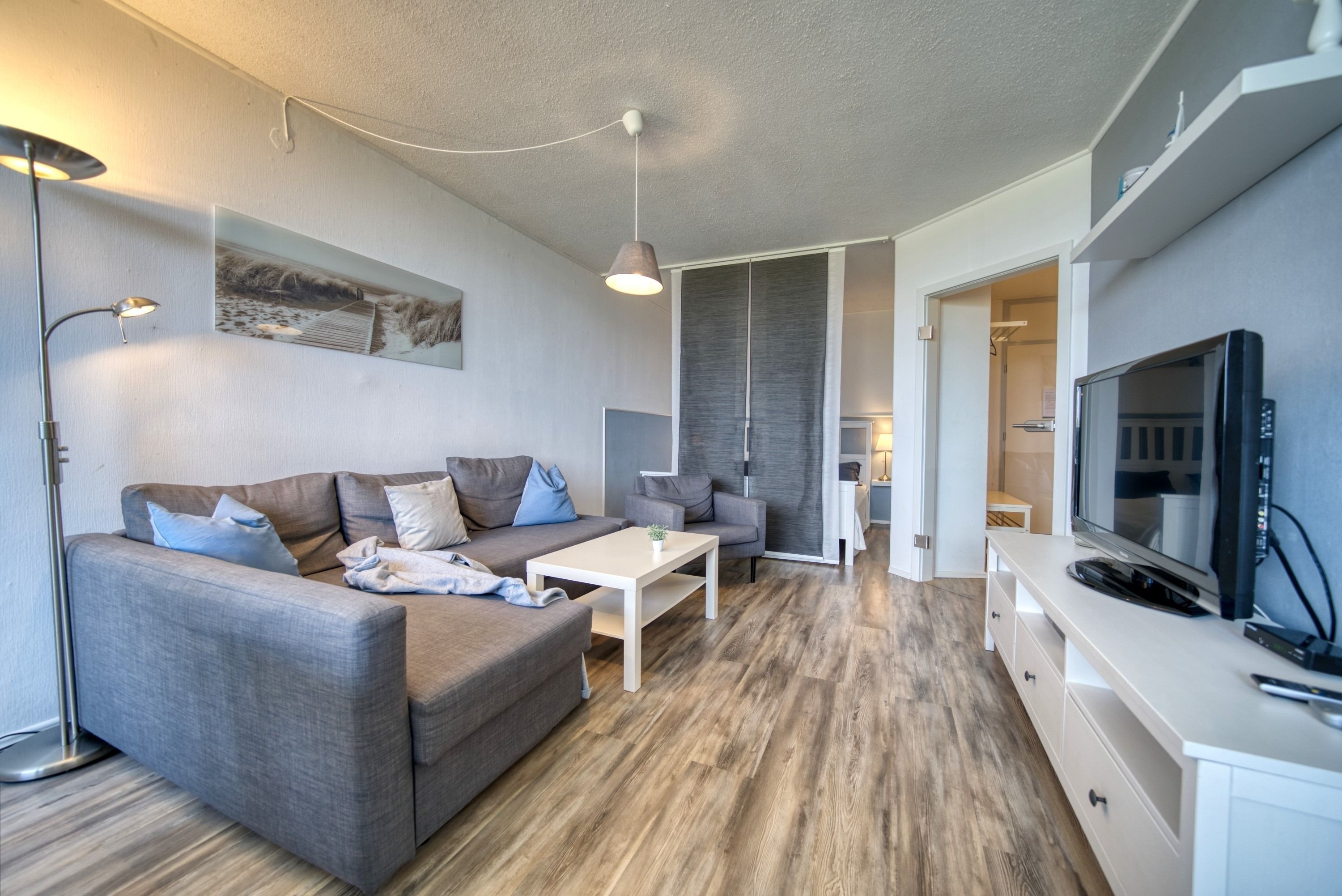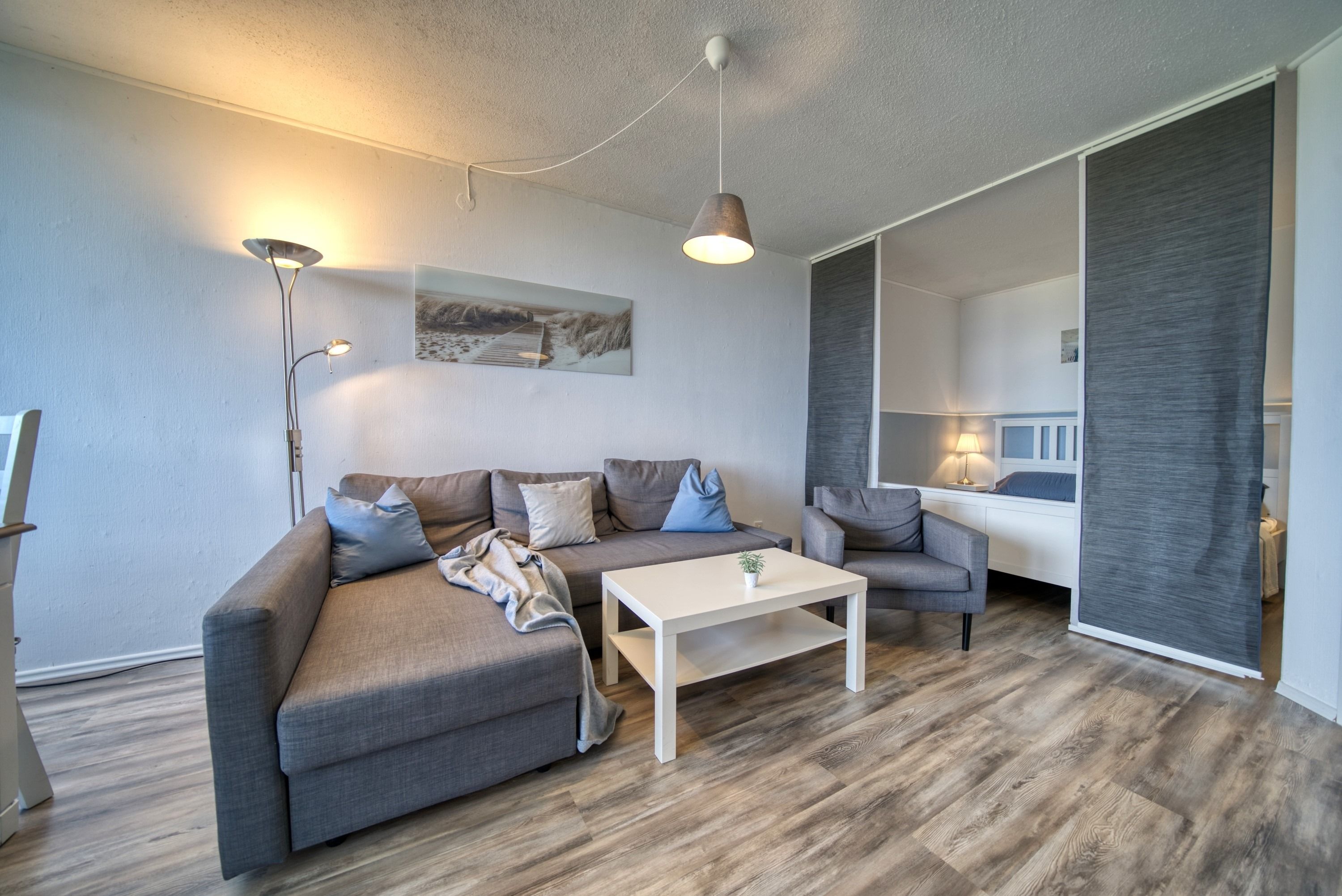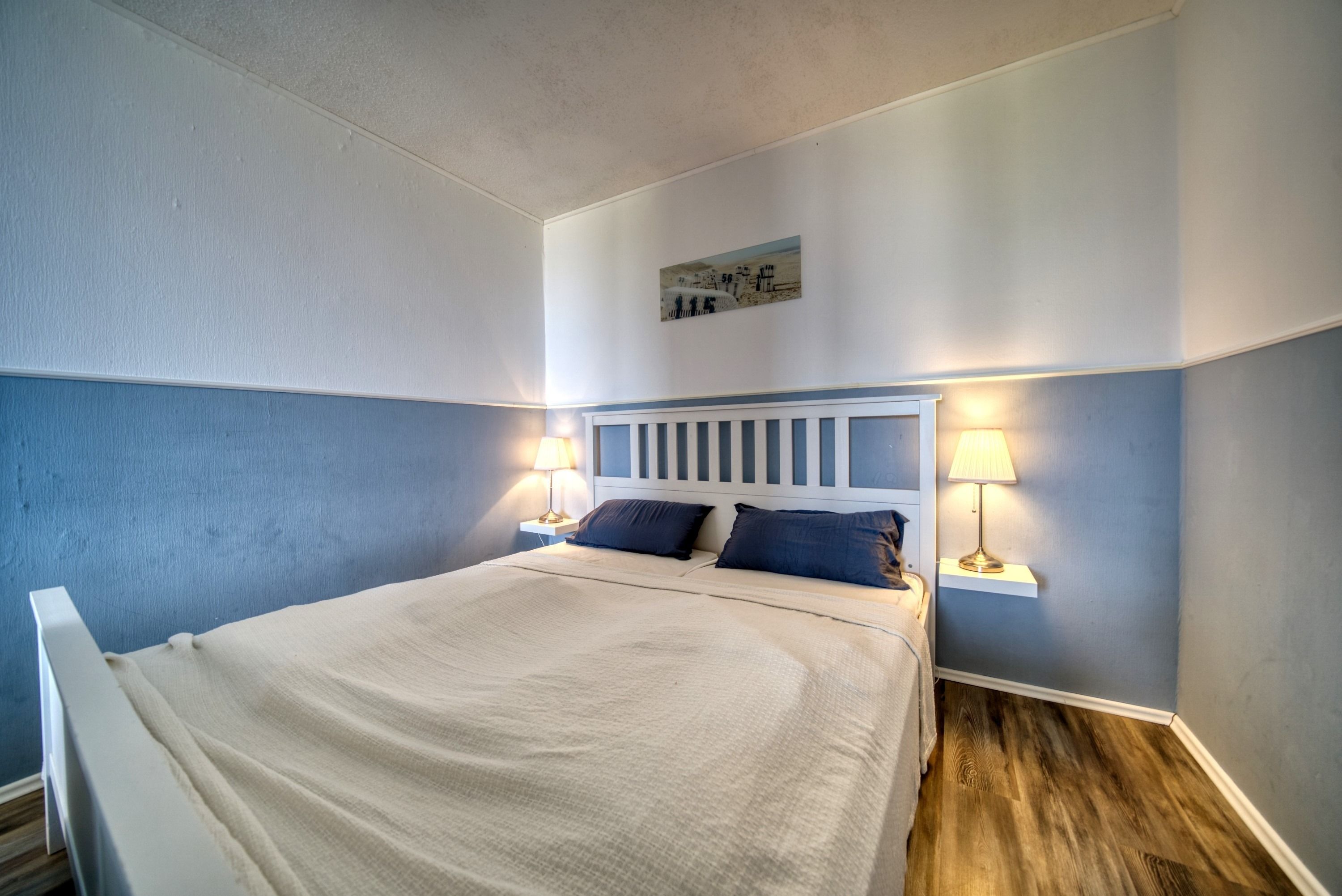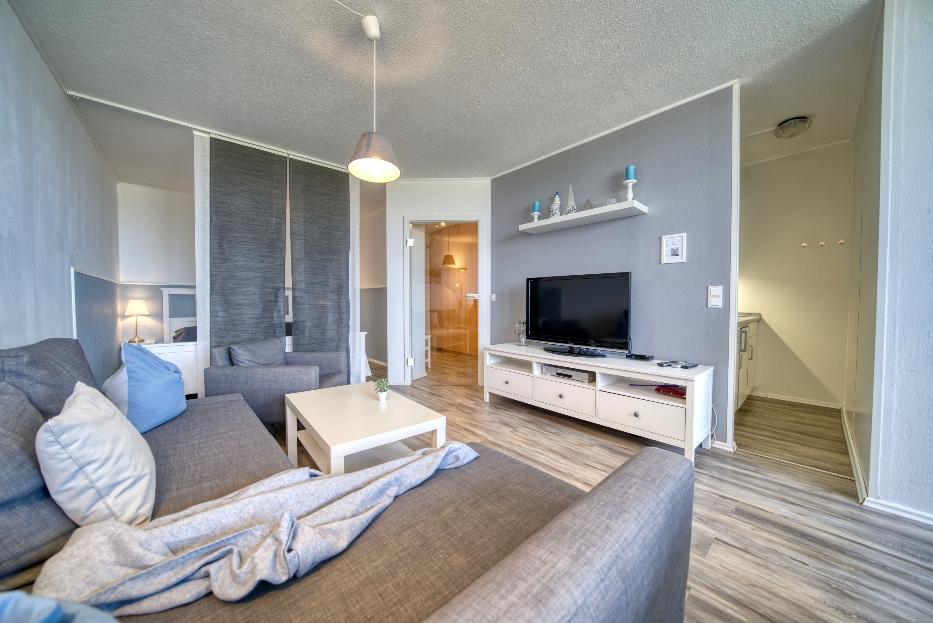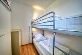 Der kombinierte Wohn-/Schlafbereich ist mit einem Doppelbett (Einzelmatratzen), einer Schlafcouch, Laminatboden, WLAN und Smart-TV ausgestattet. Zusätzlich steht ein separates Schlafzimmer mit Etagenbett zur Verfügung – ideal für Kinder.