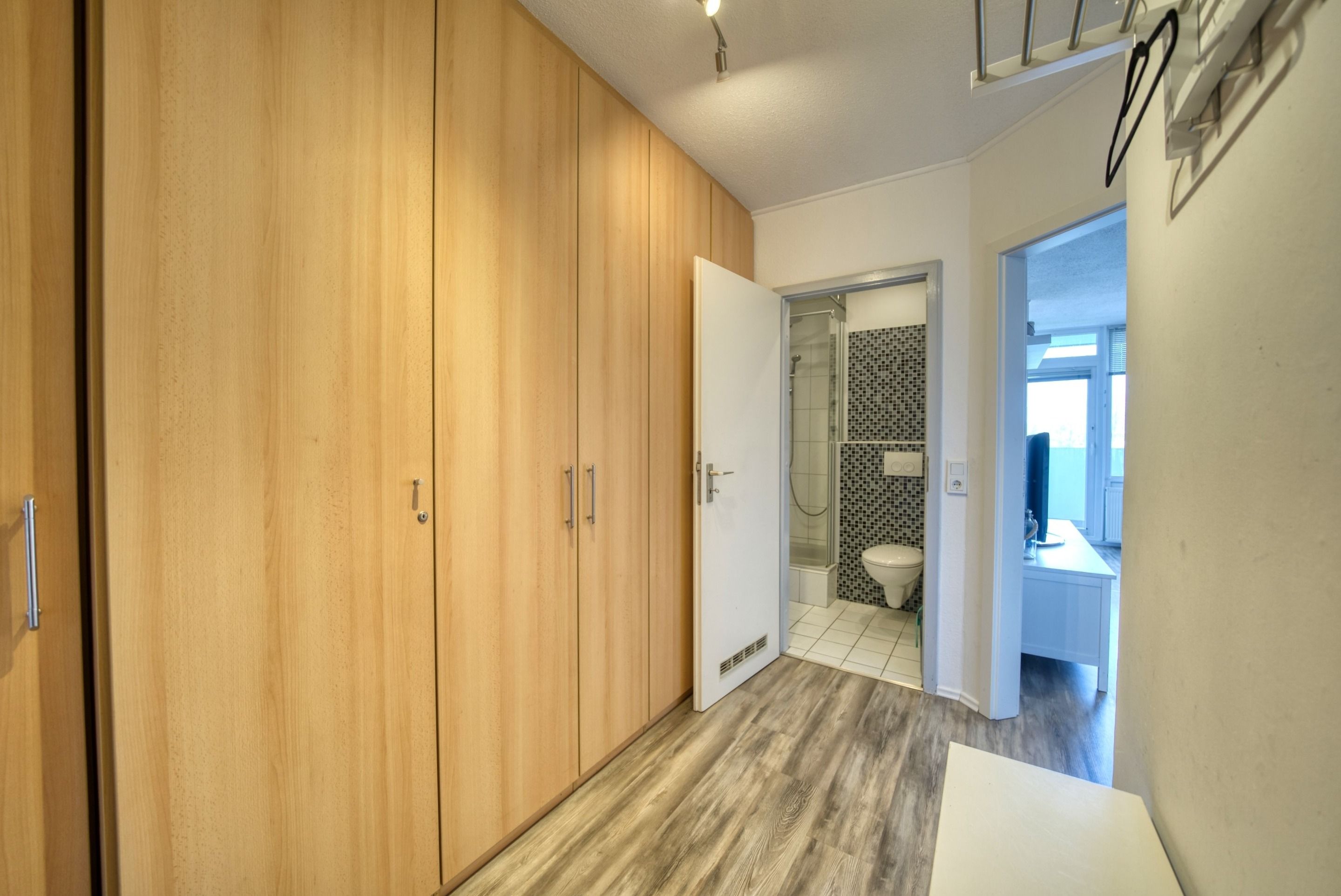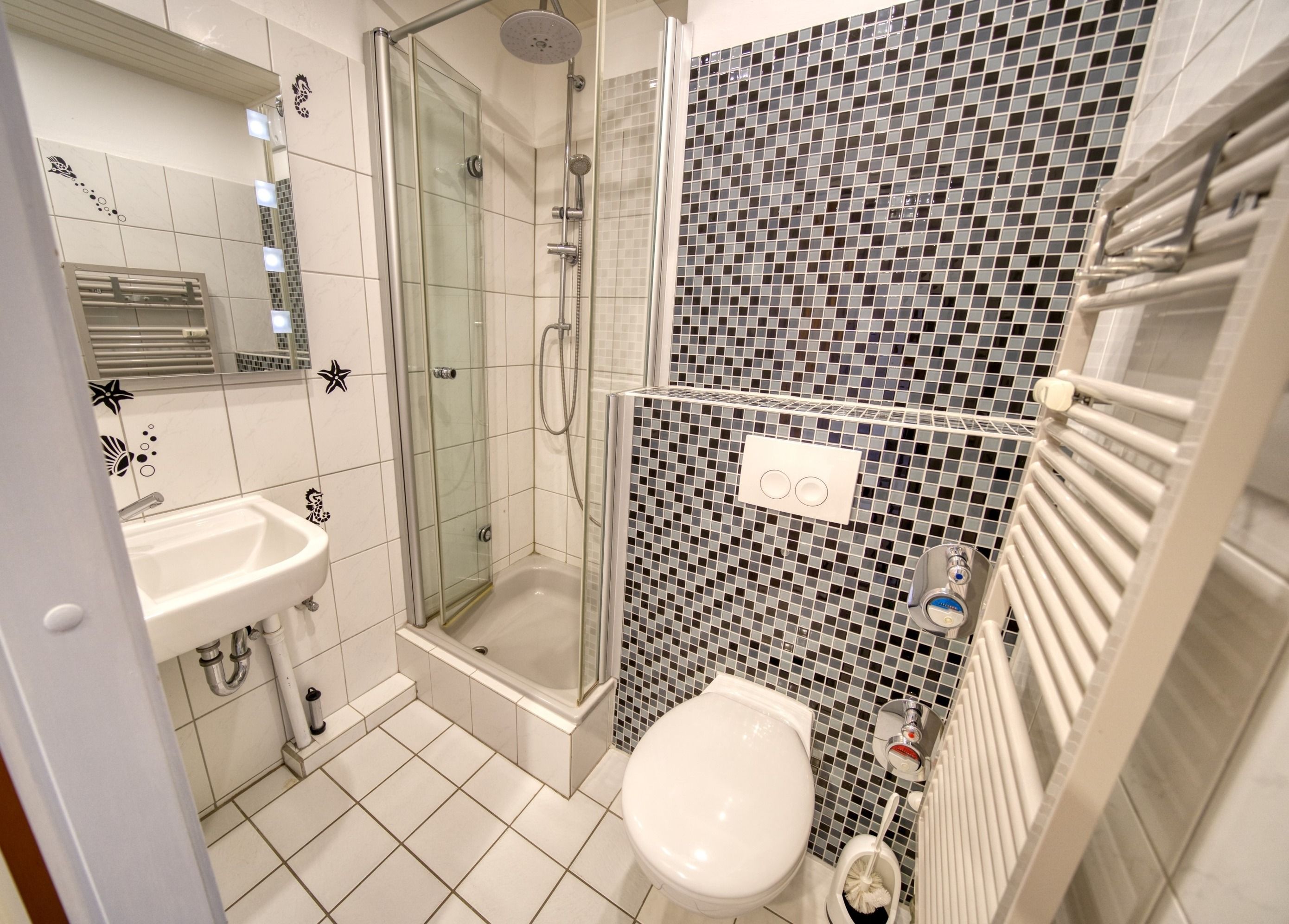 Die voll ausgestattete Küche verfügt über Ceranherd, Kühlschrank mit Gefrierfach, Mikrowelle, Wasserkocher, Toaster und Filterkaffeemaschine. Das Badezimmer ist mit einer Duschkabine und Handtuchtrockner ausgestattet.
