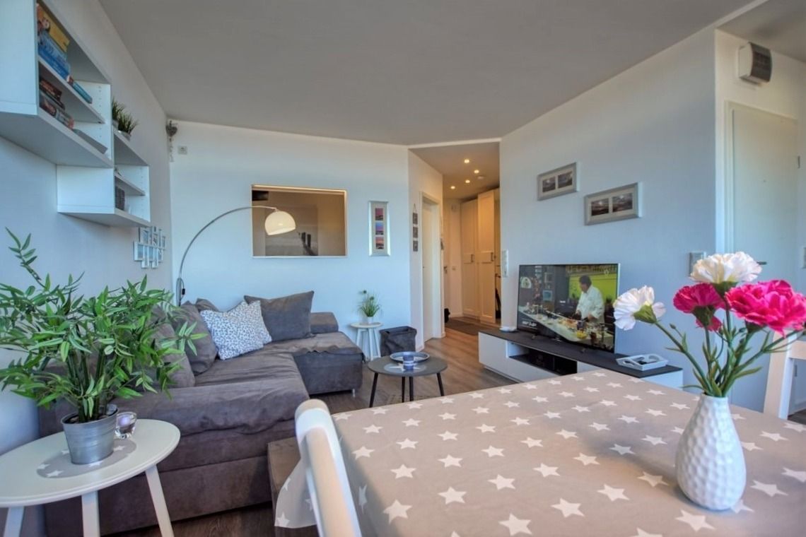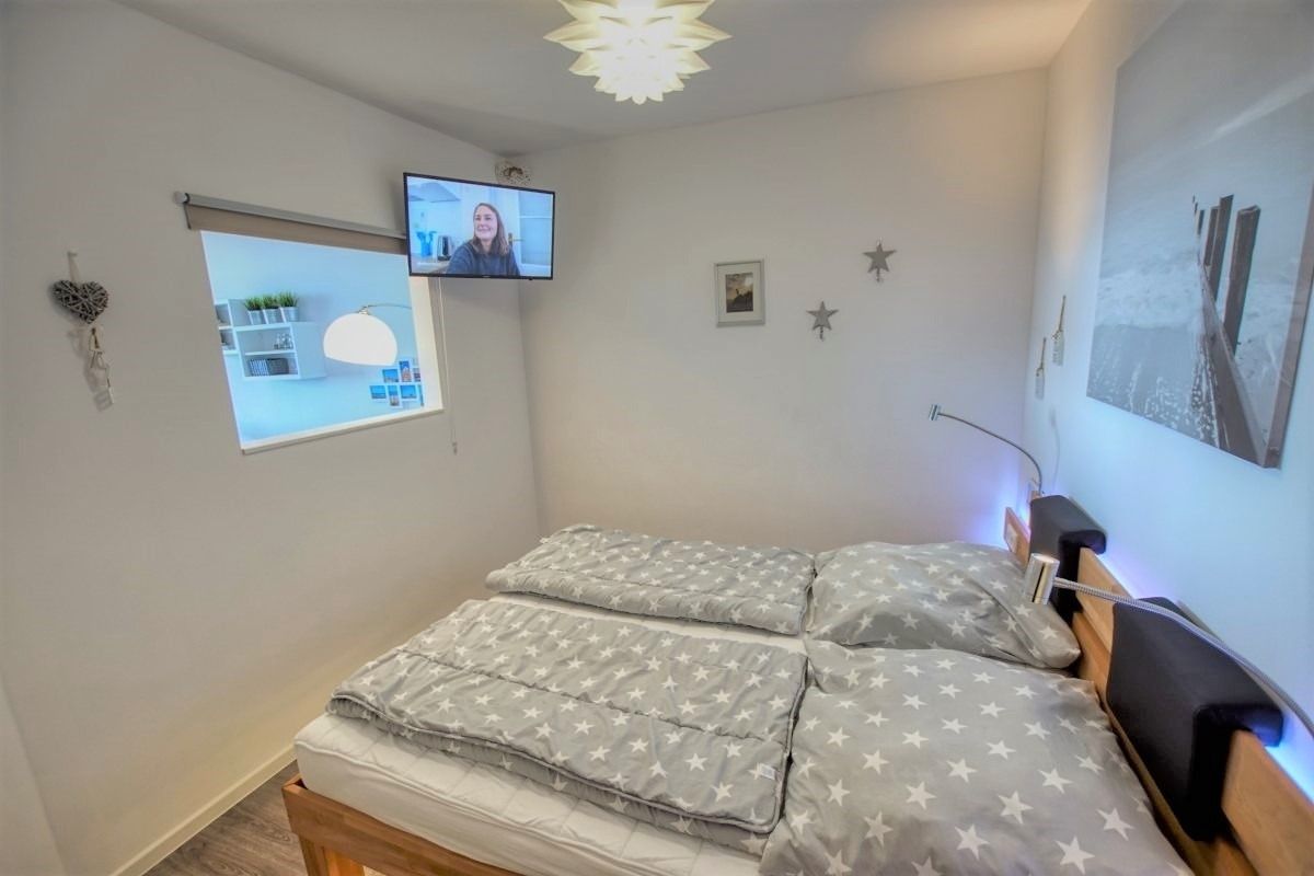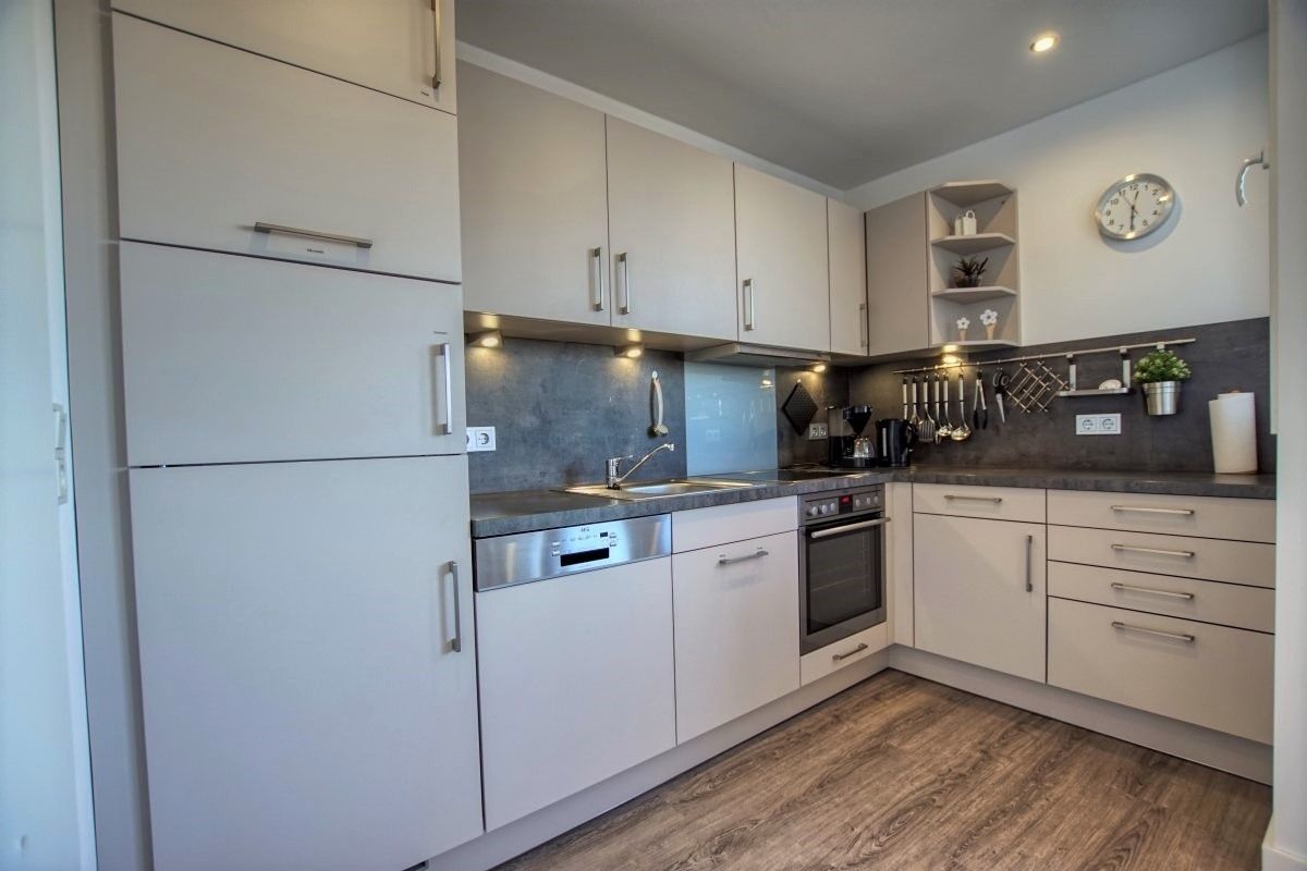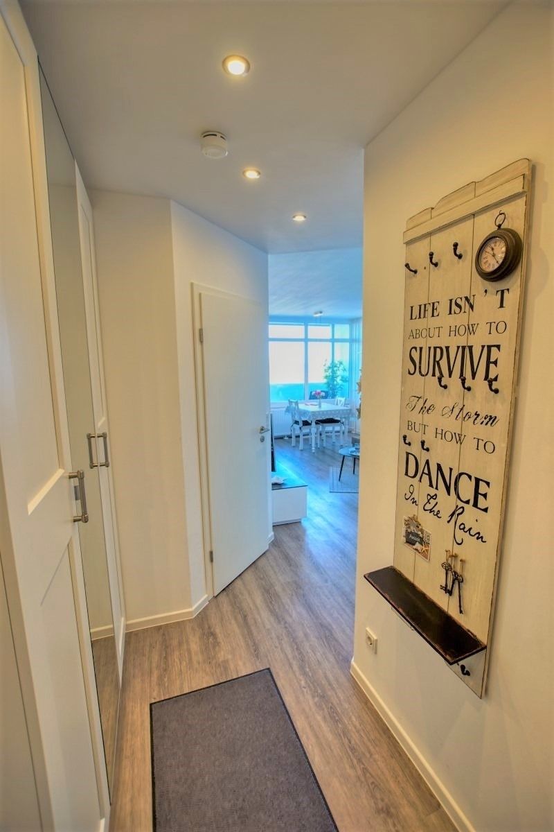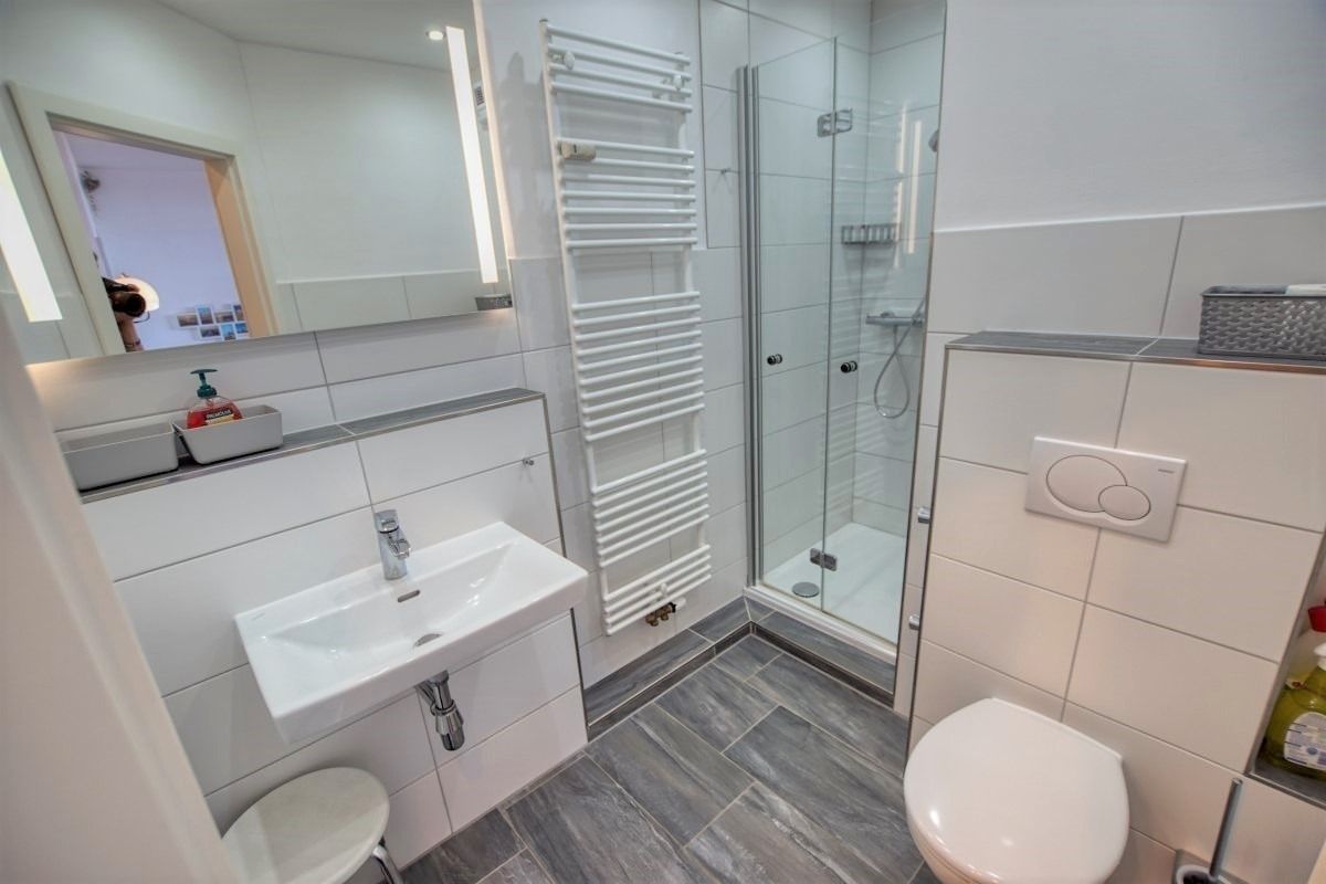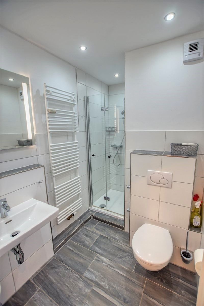 Das Bad ist modern eingerichtet mit flachem Duscheinstieg und Handtuchtrockner. Inklusive ist ein Saisonstrandkorb am Strand (Mai–September), kostenloser Parkplatz, abschließbare Fahrradräume und Fahrstuhl bis zur Wohnung.