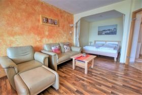 Balkon mit Blick auf die Ostsee, Wohn-Schlafbereich mit Doppelbett, separates Schlafzimmer mit Etagenbett, Laminatboden, Flachbild-TV. Küche mit Ceranherd, Kühlschrank mit Gefrierfach, Mikrowelle, Geschirrspüler, Kaffeemaschine, Toaster und Wasserkocher. Bad mit niedrigen Duscheinstieg und Handtuchtrockner. WLAN inklusive, Freikarte für die Kinderspielwelt „Schatzinsel“ im Aktiv-Hus. Nichtraucherwohnung, keine Haustiere. Ca. 300 m zum Strand, Fahrstuhl, Fahrradräume und Parkplatz vorhanden. Ideal für Familien mit Kindern, die Komfort und Ostseeblick genießen möchten.