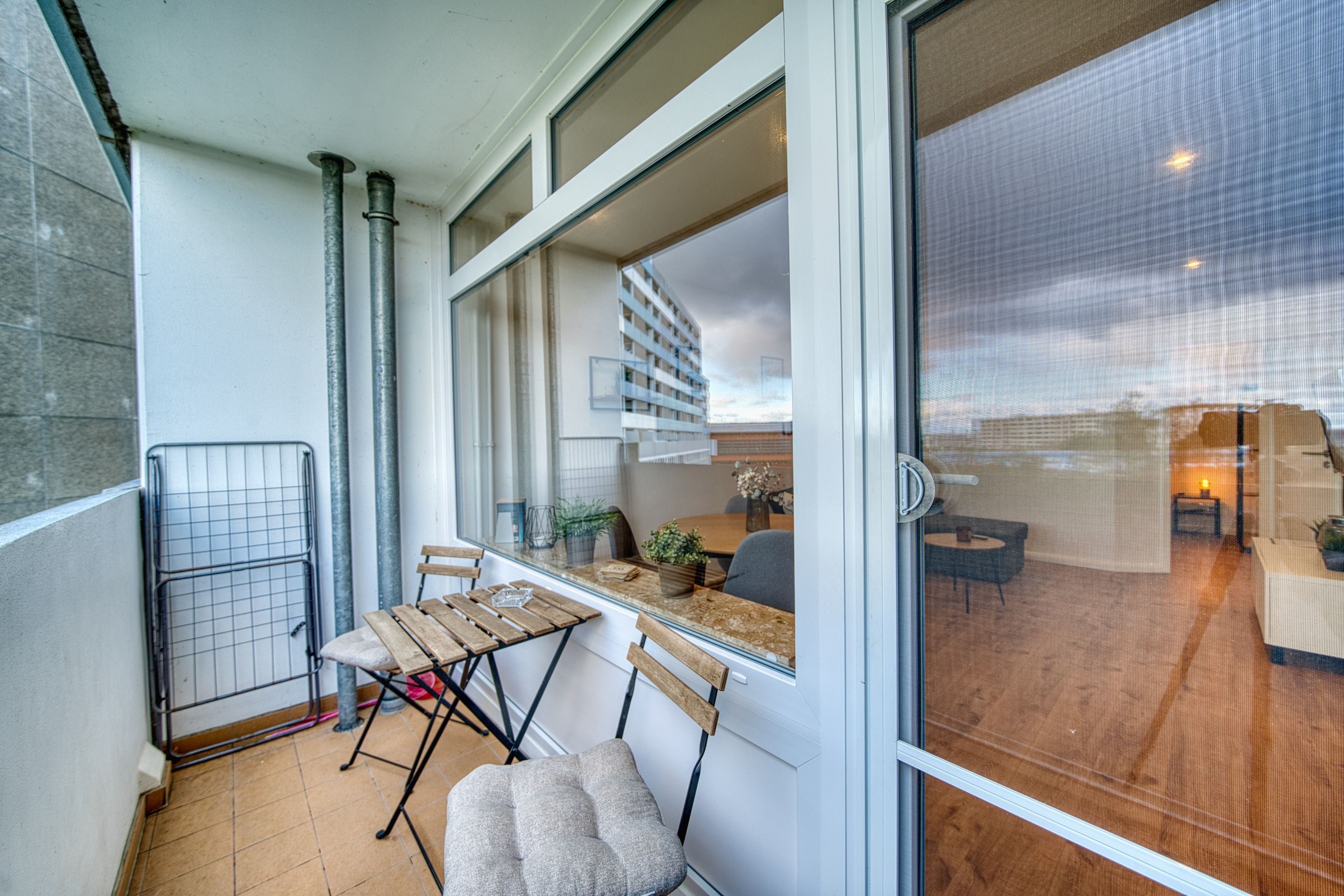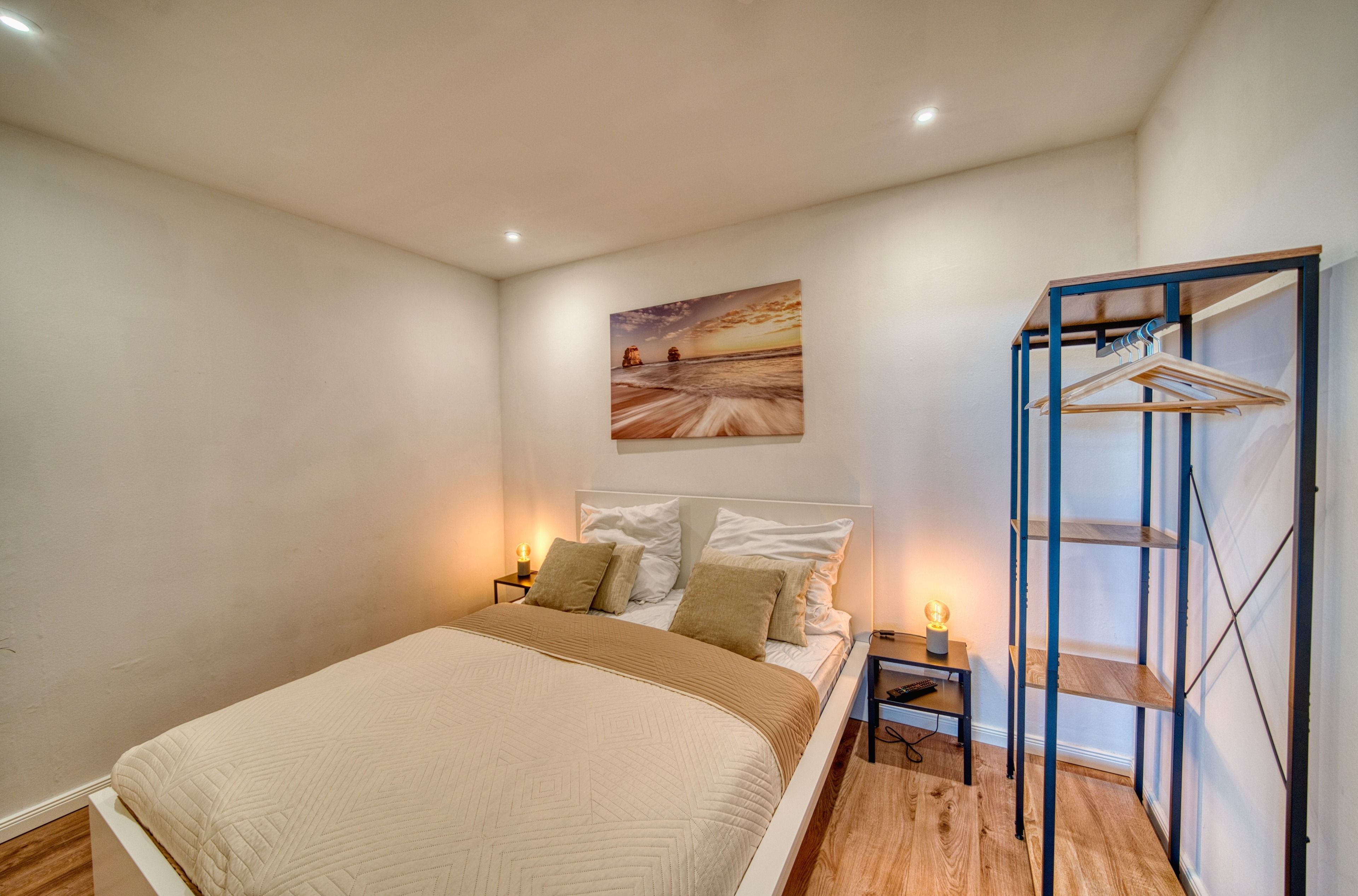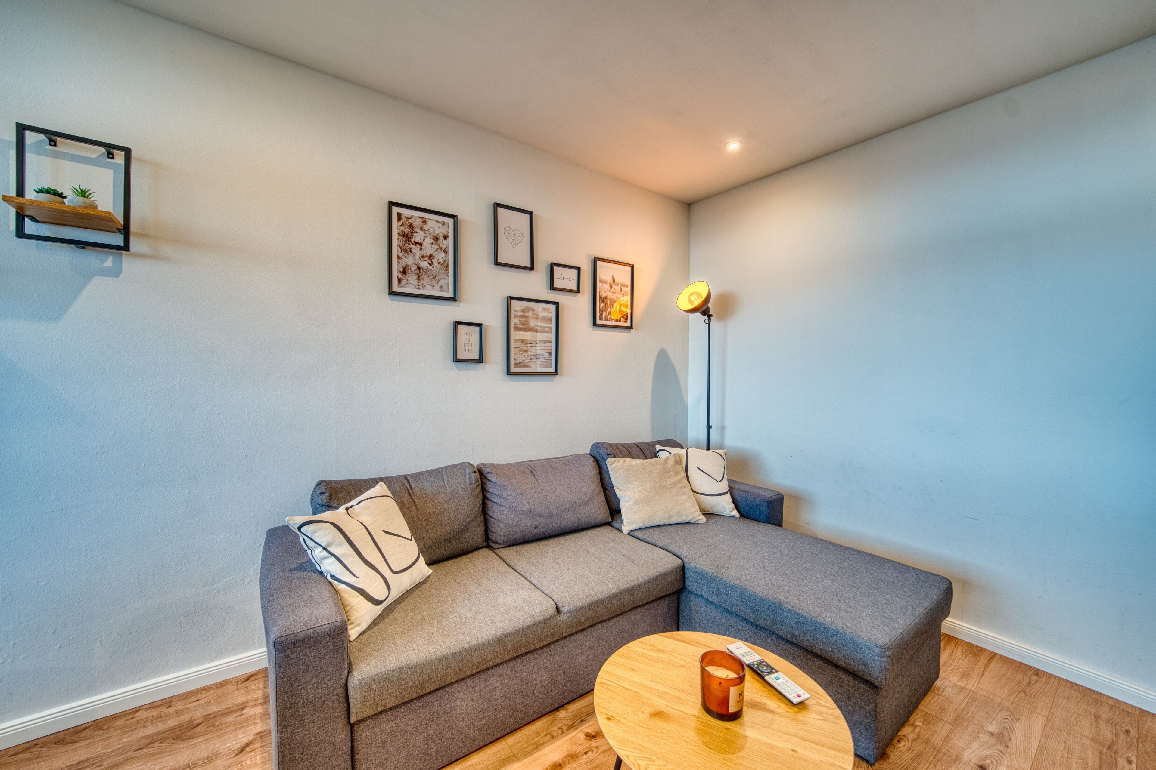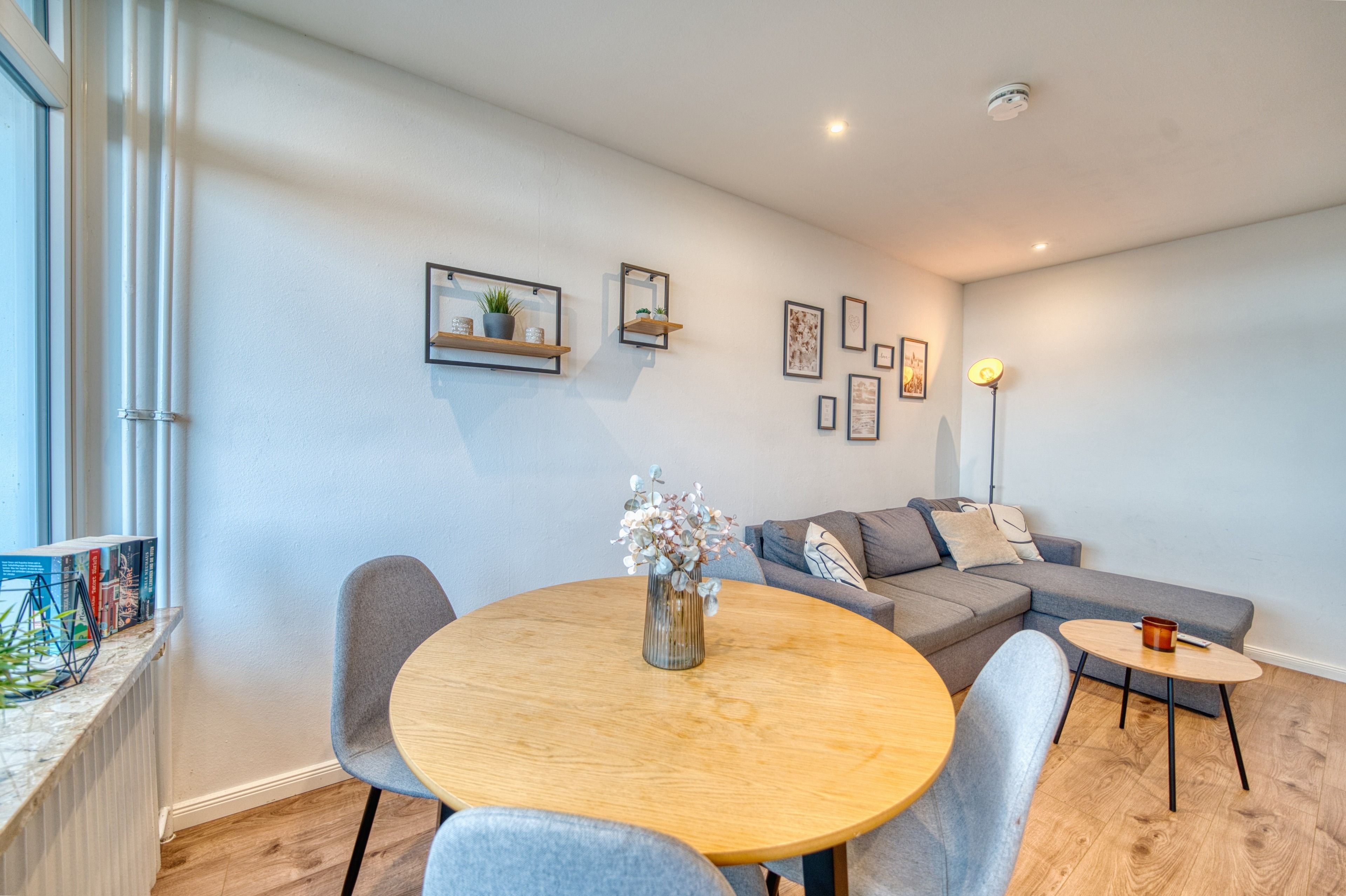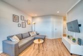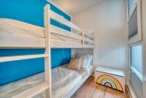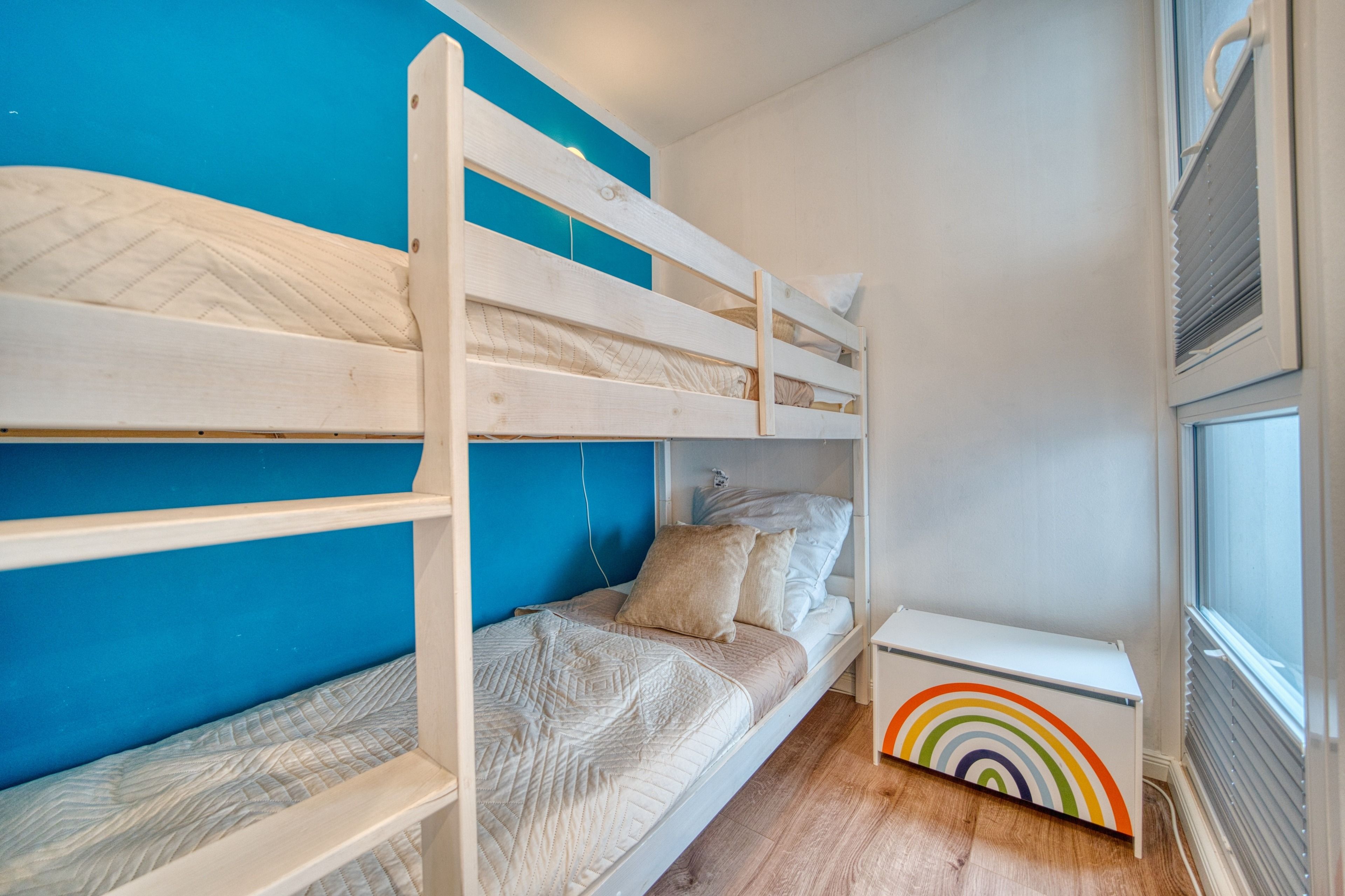 Zur Ausstattung gehören ein gemütliches Wohnzimmer mit Ecksofa, Smart-TV und Essbereich, ein separates Schlafzimmer mit Doppelbett und TV sowie ein Kinderzimmer mit Etagenbett. Die voll ausgestattete Küche bietet u. a. Backofen, Ceranherd, Geschirrspüler und Kaffeemaschine. Das Badezimmer ist mit Dusche, WC und Handtuchtrockner ausgestattet.
