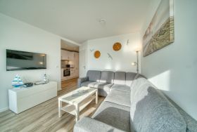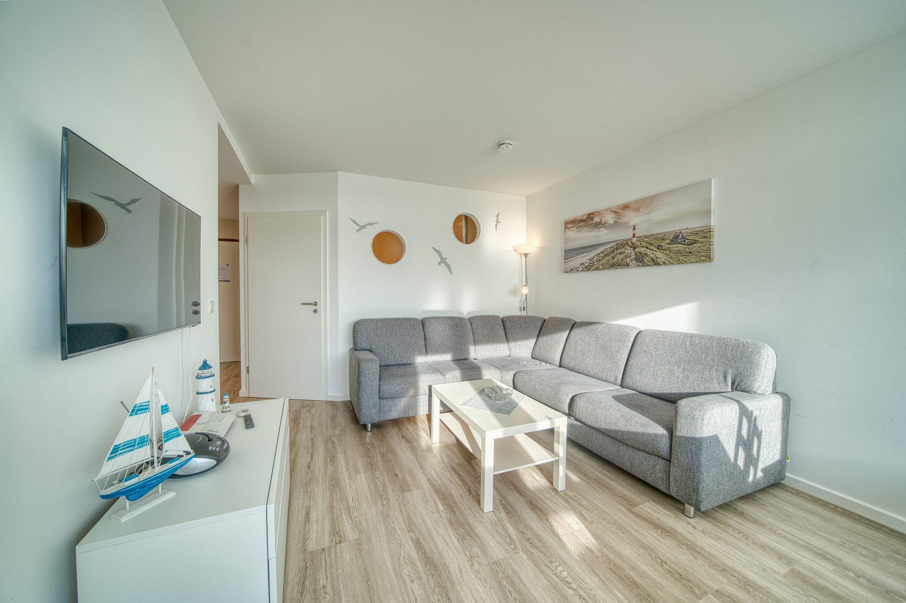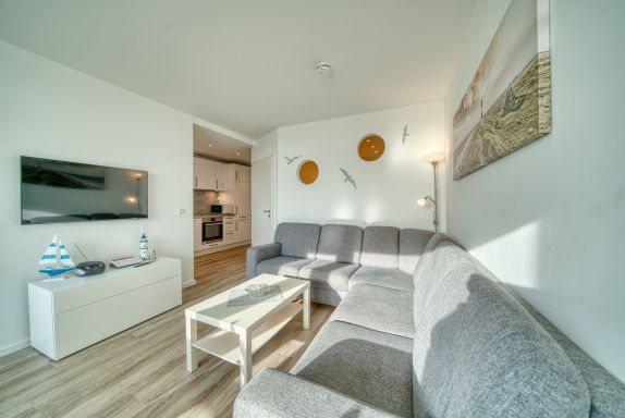 Der Wohn-/Essbereich verfügt über Sofa, Flachbild-TV und Essbereich für 4 Personen. Separater Elternschlafbereich mit Doppelbett und TV sowie Kinderzimmer mit Hochbett für 2 Personen und TV. Die Küche ist komplett ausgestattet mit Ceranfeld, Backofen, Geschirrspüler, Kühlschrank mit Gefrierfach, Kaffeemaschine, Wasserkocher und Geschirr. Das Bad bietet großzügige Dusche und moderne Ausstattung. Kostenloses WLAN vorhanden. Nichtraucherwohnung, keine Haustiere, Parkplatz vorhanden. Der Strand liegt ca. 300 m entfernt, das Aktiv-Hus mit Schwimmbad, Sauna und Wellness ist fußläufig erreichbar.