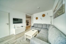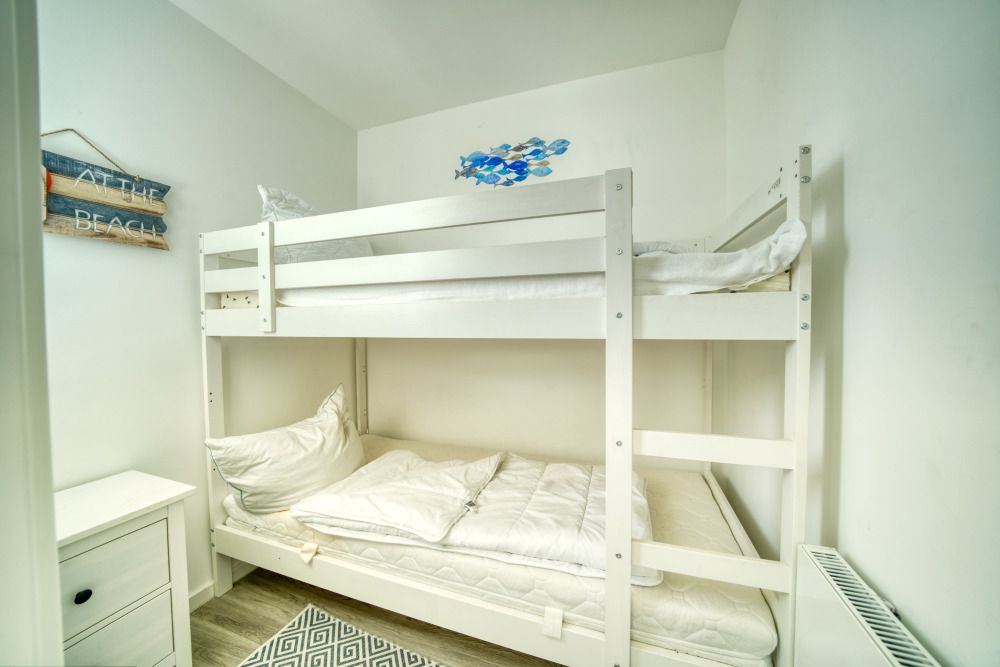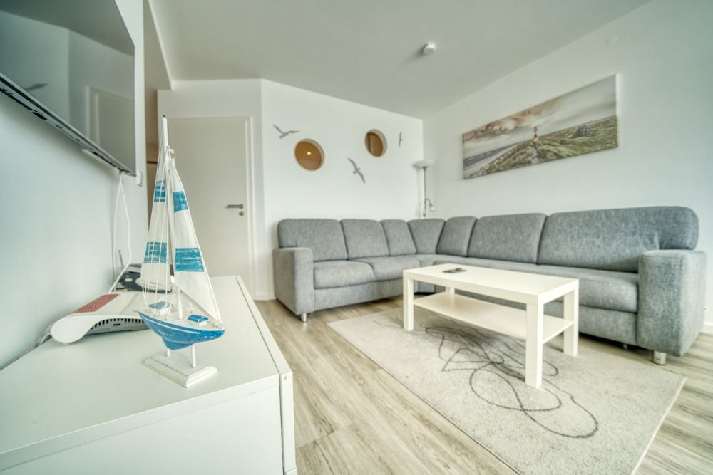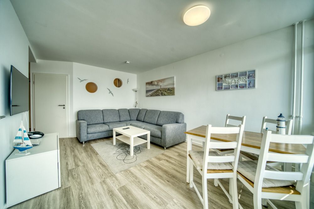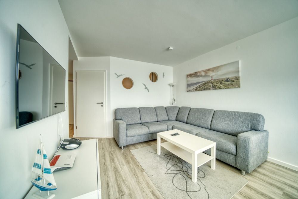 Der Wohn-/Essbereich verfügt über Sofa, Flachbild-TV und Essbereich für 4 Personen. Separater Elternschlafbereich mit Doppelbett und TV sowie Kinderzimmer mit Hochbett für 2 Personen und TV. Die Küche ist komplett ausgestattet mit Ceranfeld, Backofen, Geschirrspüler, Kühlschrank mit Gefrierfach, Kaffeemaschine, Wasserkocher und Geschirr. Das Bad bietet großzügige Dusche und moderne Ausstattung. Kostenloses WLAN vorhanden. Nichtraucherwohnung, keine Haustiere, Parkplatz vorhanden. Der Strand liegt ca. 300 m entfernt, das Aktiv-Hus mit Schwimmbad, Sauna und Wellness ist fußläufig erreichbar.