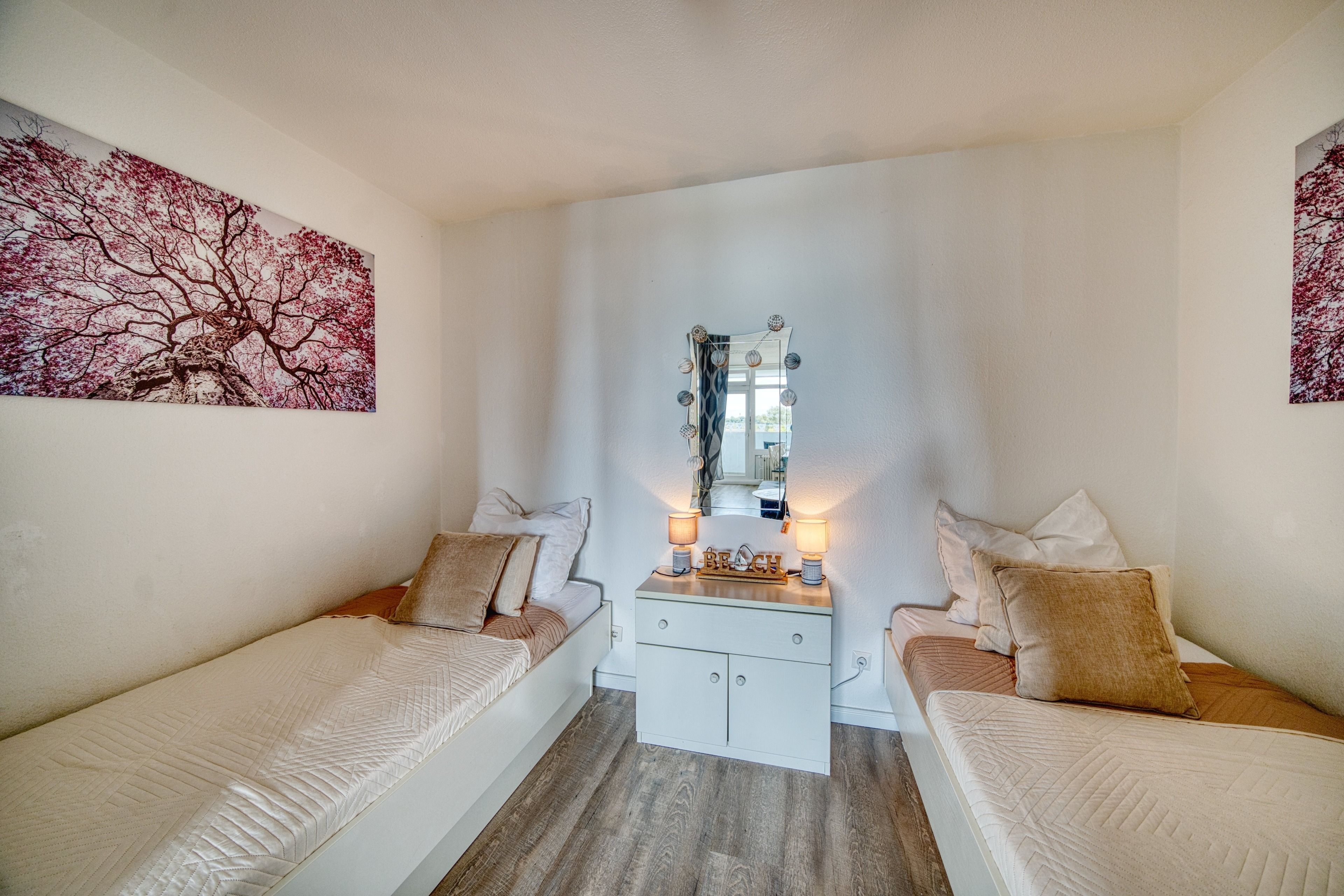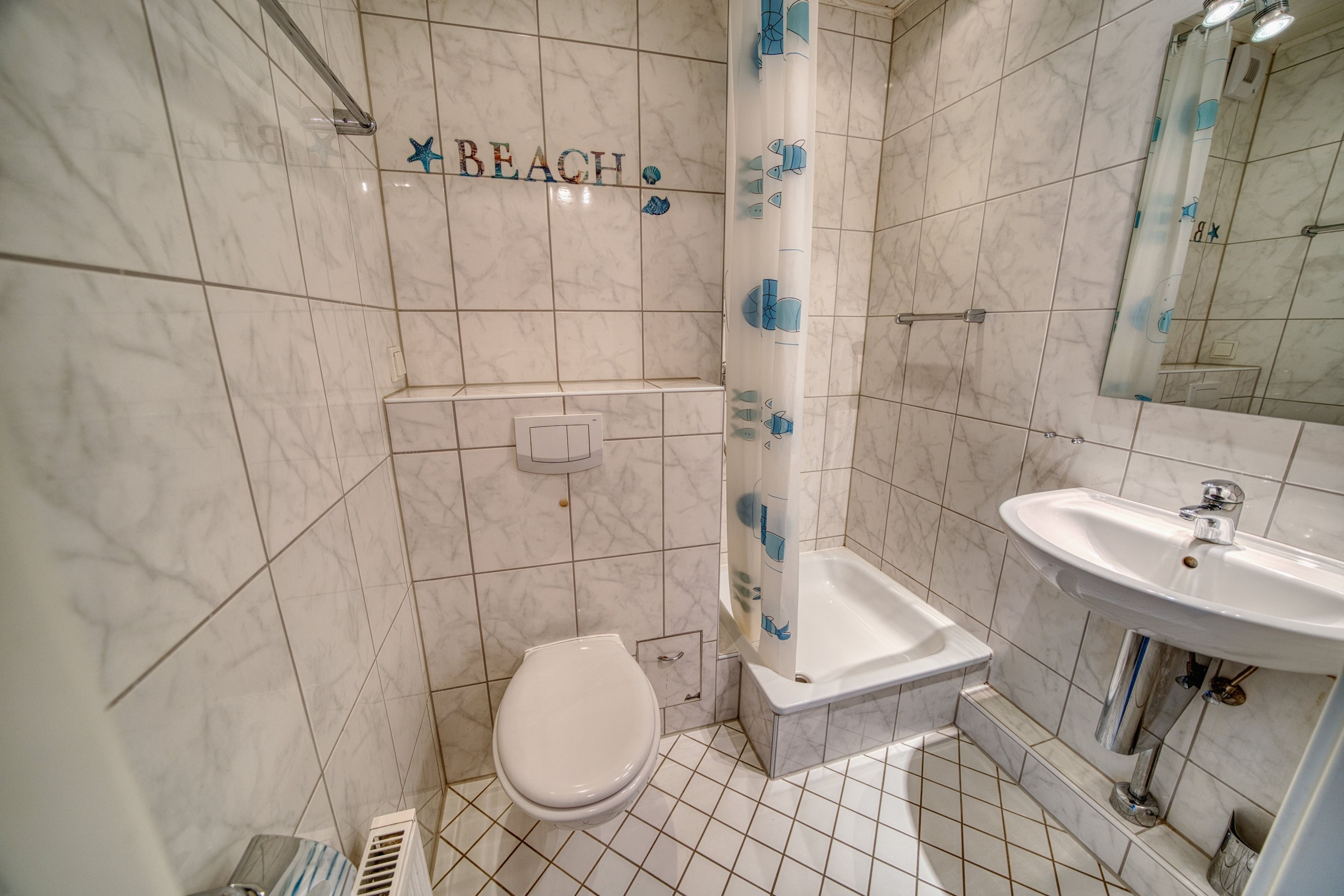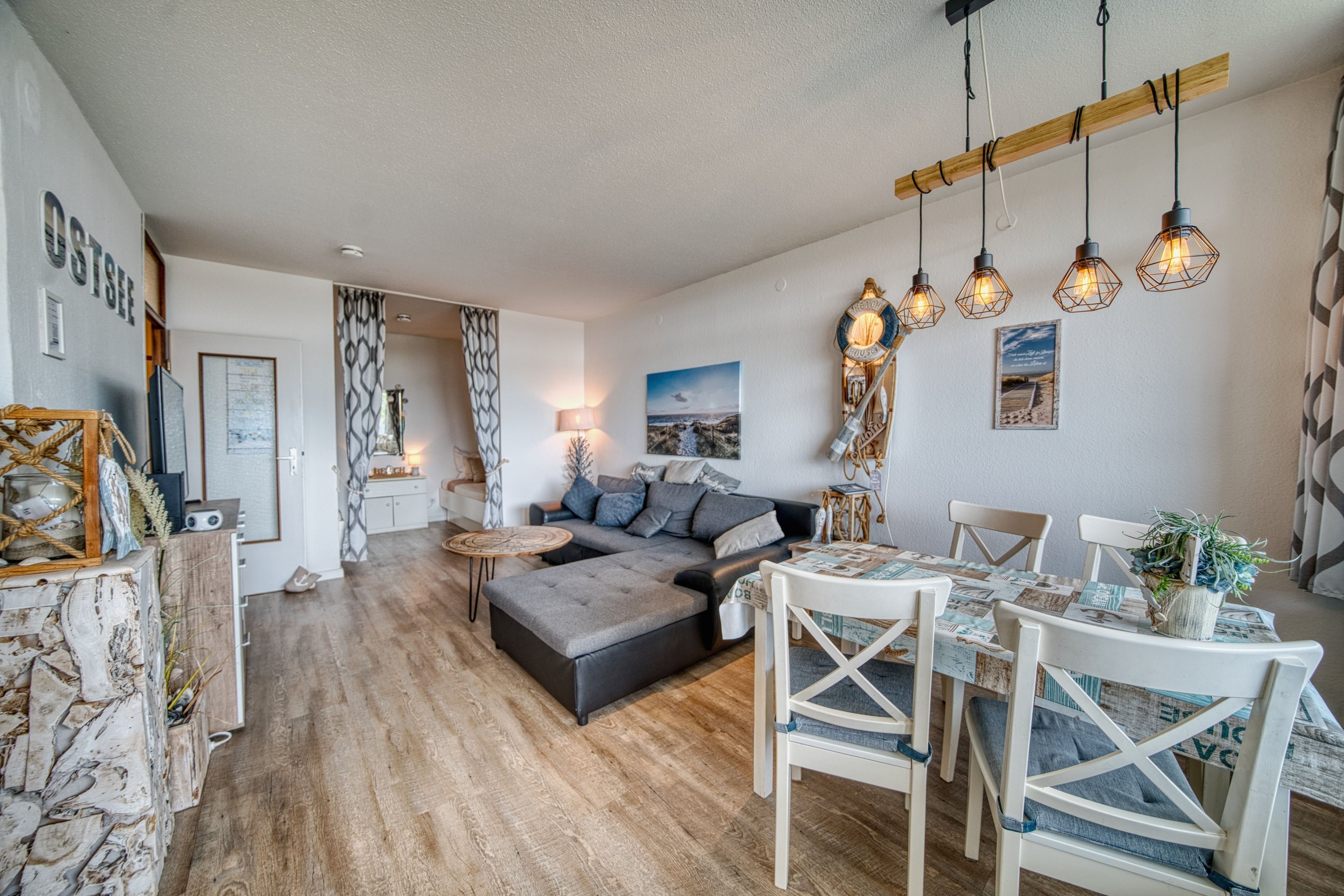 Wohnfläche 45 m², Wohn-Esszimmer mit Flachbild-TV, Elternschlafraum mit Einzelbetten, Kinderzimmer mit Etagenbett. Küche mit Kühlschrank und 4-Plattenherd, Bad mit WC und Dusche. WLAN inklusive. Nichtraucherwohnung, keine Haustiere, maximal 4 Personen. Fahrstuhl, Fahrradräume und kostenfreier Parkplatz vorhanden. Strand ca. 300 m entfernt, Aktiv-Hus mit Schwimmbad, Sauna und Wellness fußläufig erreichbar.
