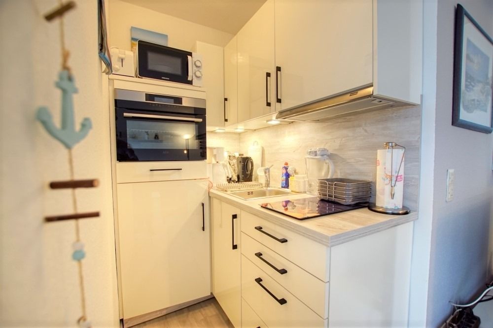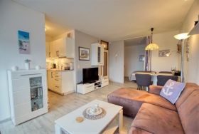Wohn-/Esszimmer mit Sofa, Flachbild-TV und Radio, Schlafbereich mit Doppelbett, separates Kinderzimmer mit Etagenbett. Küche komplett ausgestattet (Kühlschrank mit Gefrierfach, Backofen, 2-Platten-Herd). Bad mit WC und Dusche. Balkon mit schöner Aussicht. Kostenloses WLAN. Nichtraucher, keine Haustiere, max. 4 Personen. Fahrstuhl, Fahrradräume, Strand ca. 300 m, Parkplatz vorhanden.