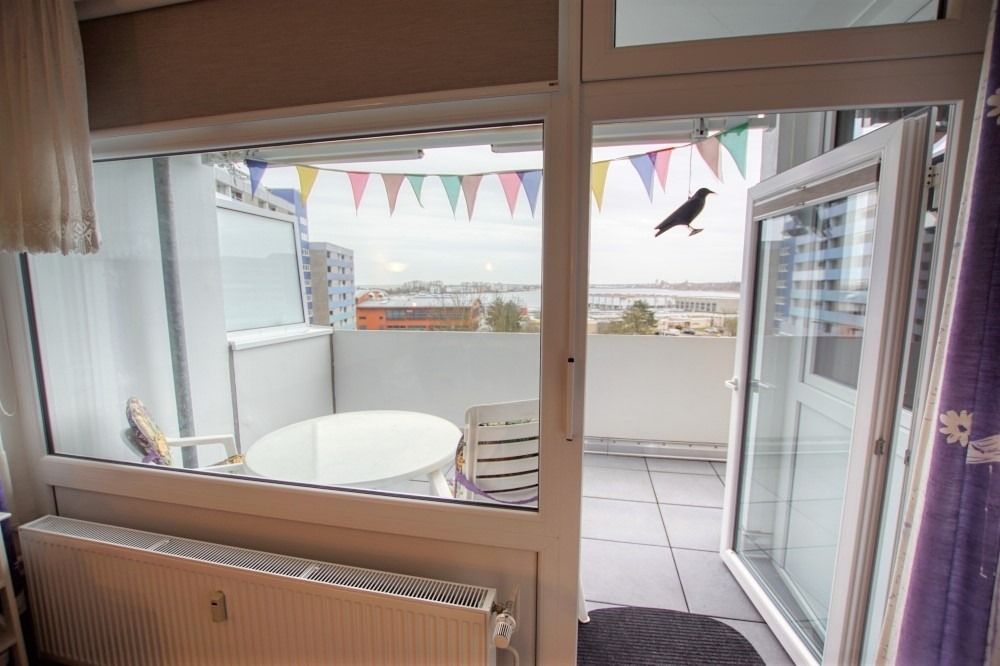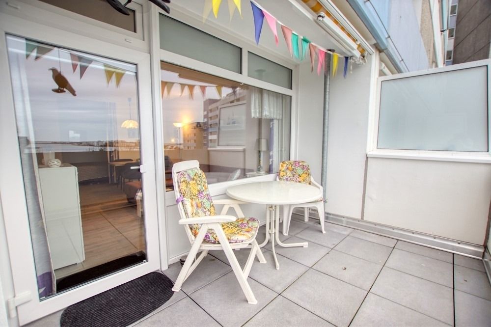 Die Ferienwohnung im Haus F, 5. Etage, mit Balkon zur Ostseite, bietet einen herrlichen Blick auf den großen Binnensee und den Innenhof.
