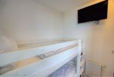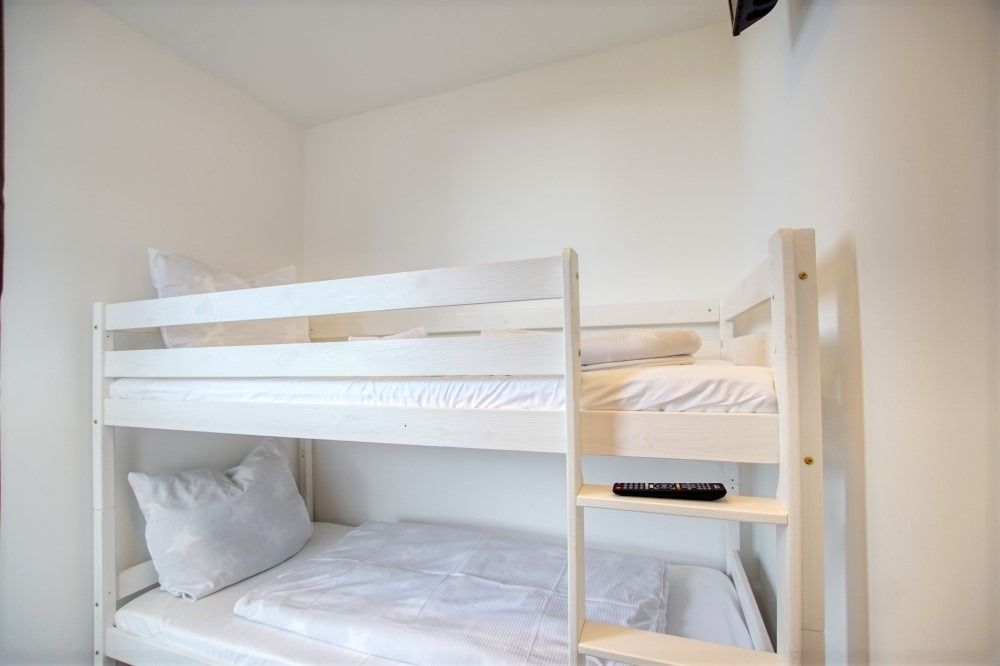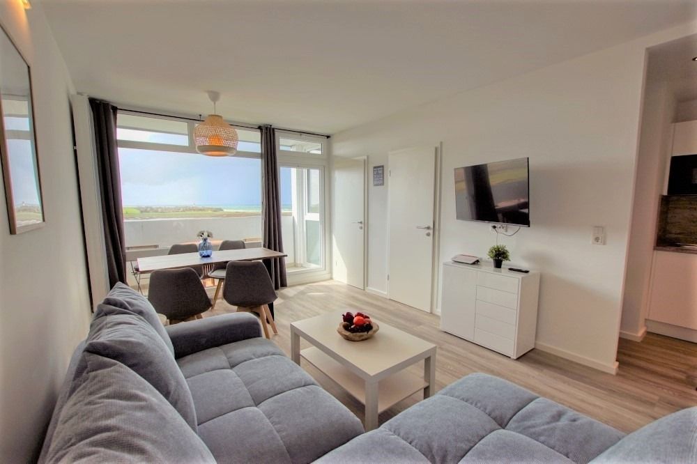 Wohnfläche 45 m² für bis zu 5 Personen: Elternschlafzimmer mit Doppelbett/TV, Kinderzimmer mit Etagenbett/TV, Schlafcouch im Wohnbereich. Offener Wohn-/Essbereich mit Sofa, Esstisch (4 Plätze), Flachbild-TV, maritimer Boden. Küche mit Ceranfeld, Backofen, Geschirrspüler, Mikrowelle, Kühlschrank/Gefrierfach, Kaffeemaschine, Wasserkocher. Bad mit Dusche/WC, Handtuchtrockner. Balkon Westseite, WLAN inklusive. Nichtraucher, keine Haustiere, nicht allergikerfreundlich. Strand ca. 300 m, Aktiv-Hus und Läden in Nähe, Fahrstuhl, Fahrradräume, kostenfreier Parkplatz.