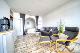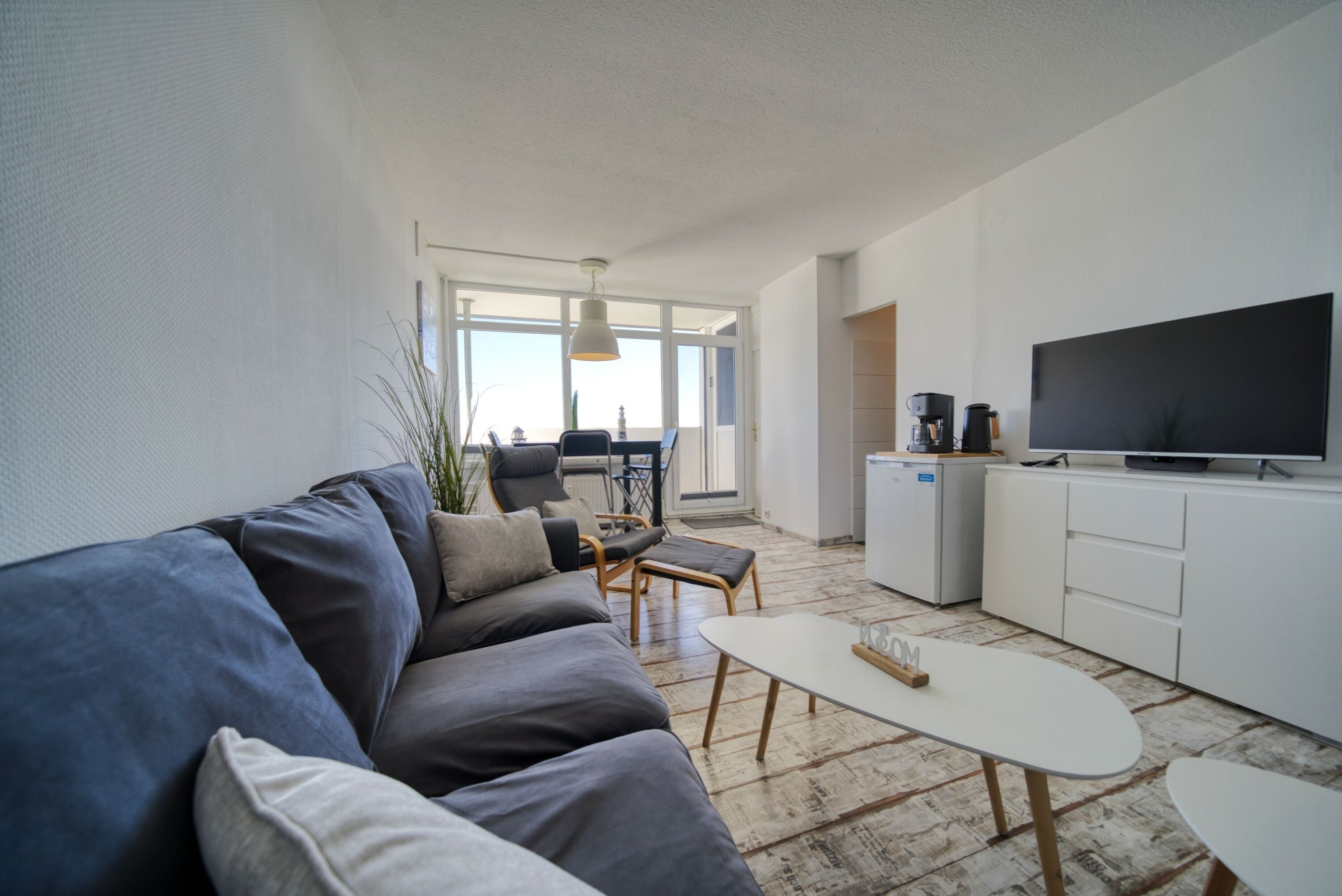 Die Wohnung verfügt über einen separaten Schlafbereich mit Doppelbett sowie ein Kinderzimmer mit Etagenbett; ein Babybett kann bei Bedarf im Schlafzimmer aufgestellt werden. Die moderne Küche ist mit Backofen und Ceranfeld ausgestattet. Glasfaser-Internet steht ebenfalls zur Verfügung.