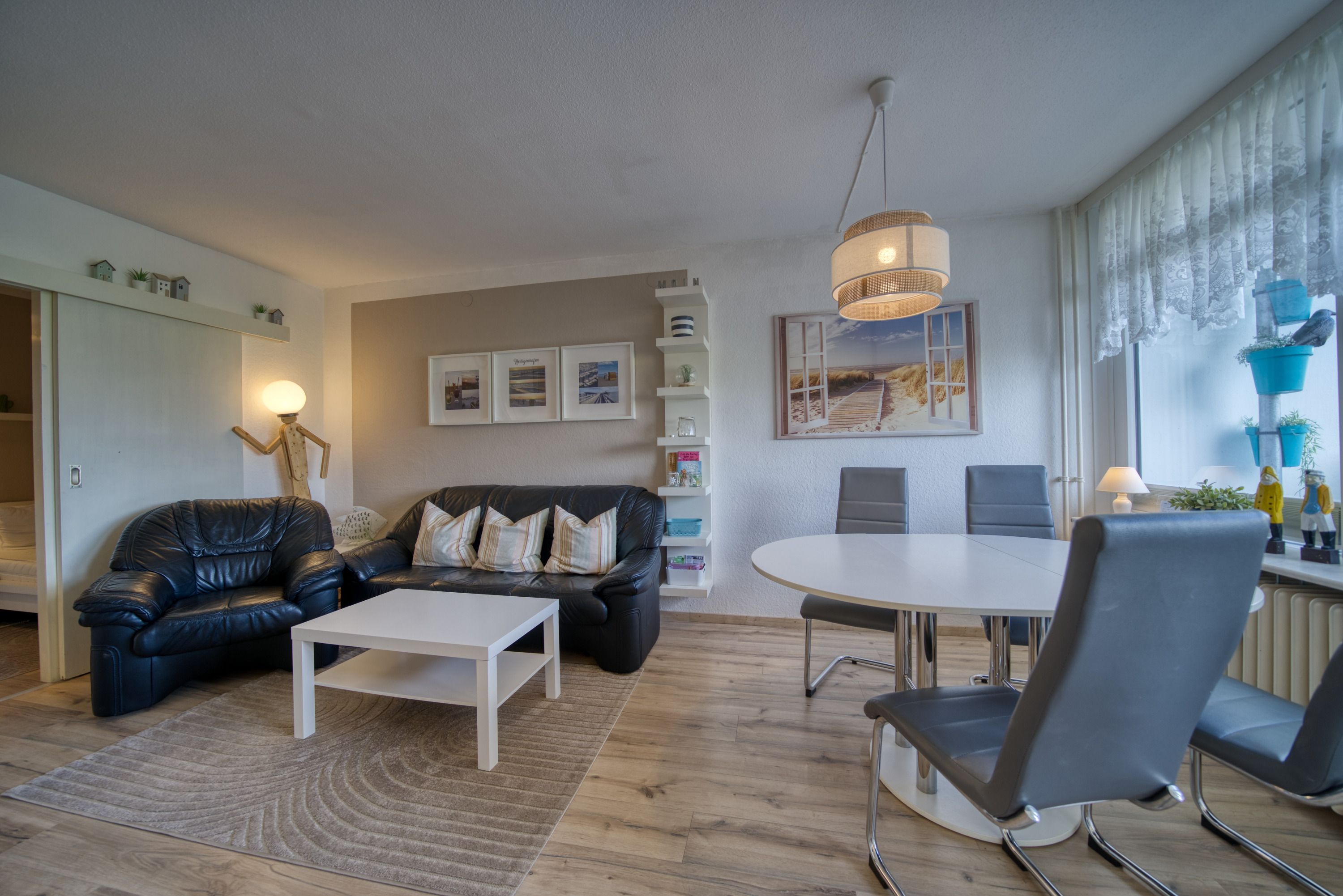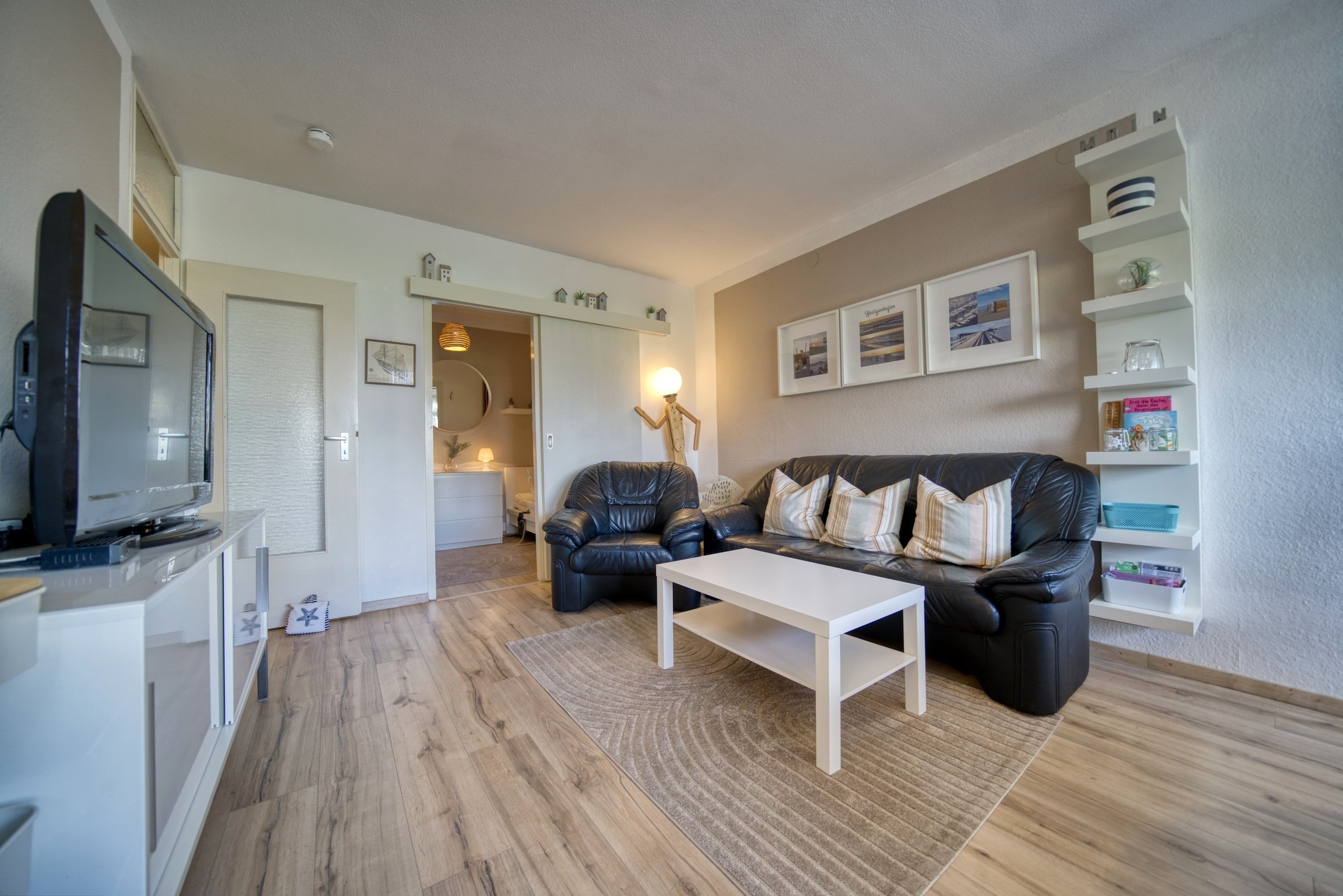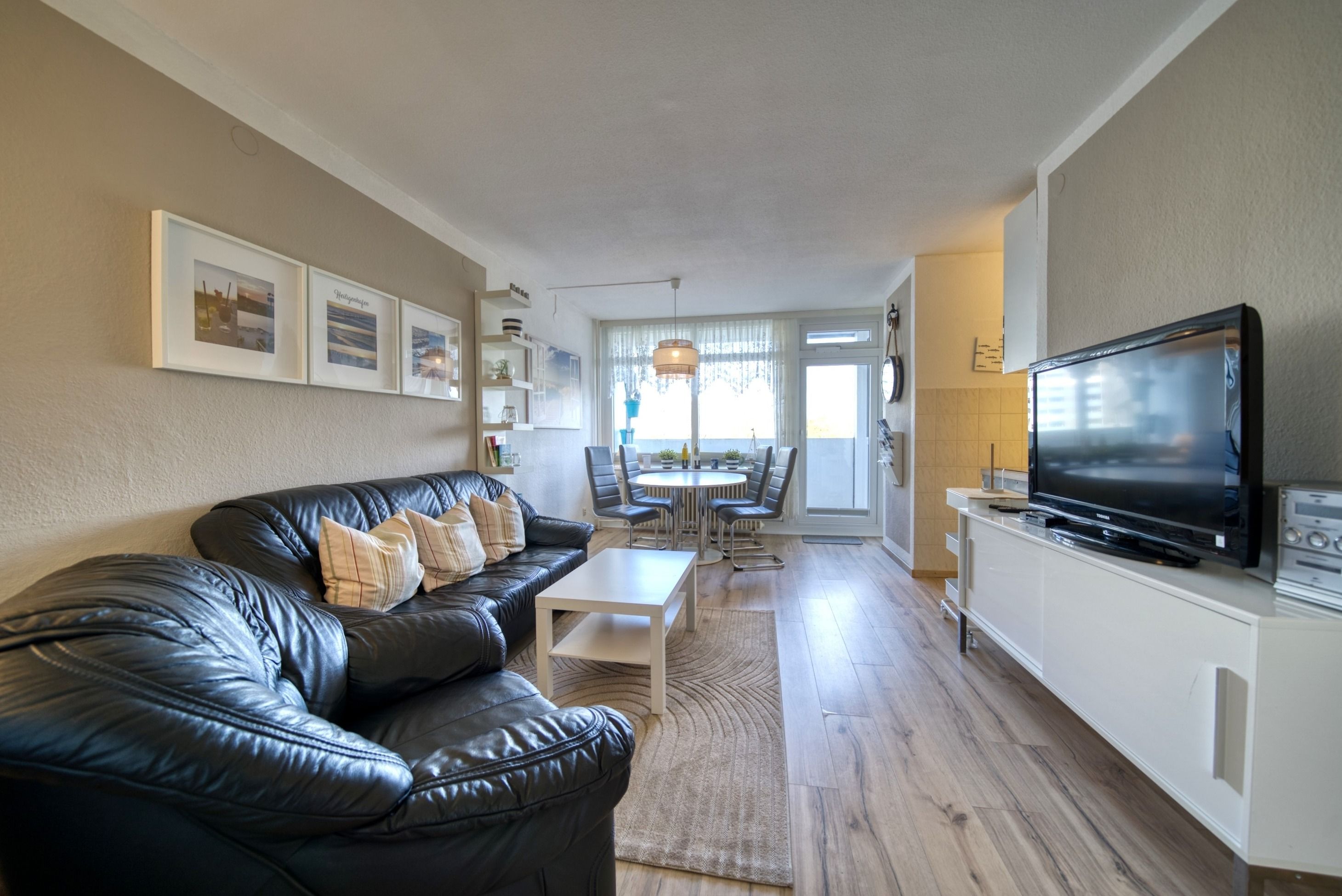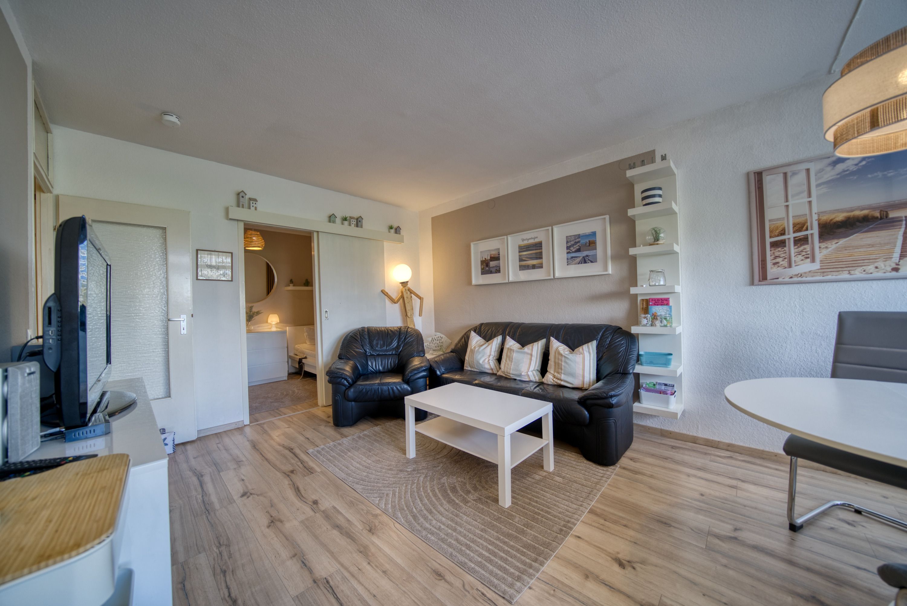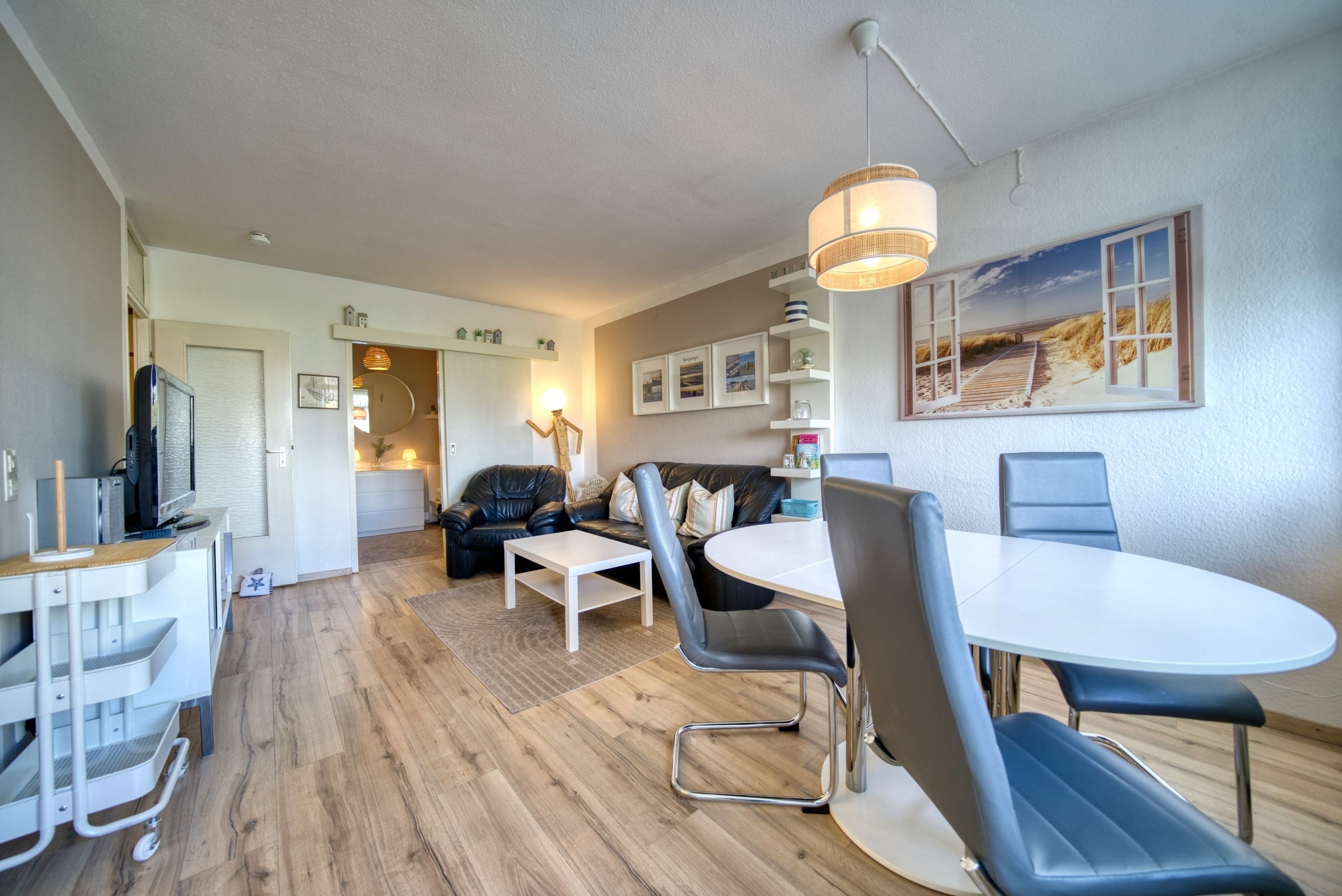 Die 45 m² große Wohnung bietet Platz für bis zu 4 Personen und verfügt über einen Elternschlafraum mit Einzelbetten, Wohn-Esszimmer mit TV und Radio, Kinderzimmer mit Etagenbett, sowie eine Küche mit Mikrowelle, Kühlschrank, 4-Platten-Herd und Backofen. Badezimmer mit WC und Dusche. Nichtraucherwohnung, keine Haustiere, kein WLAN. Balkon mit Blick ins Grüne. Strand ca. 300 m, Aktiv-Hus mit Schwimmbad, Sauna, Wellness, Kinderspielwelt und Einkaufsmöglichkeiten direkt im Ferienpark.