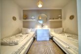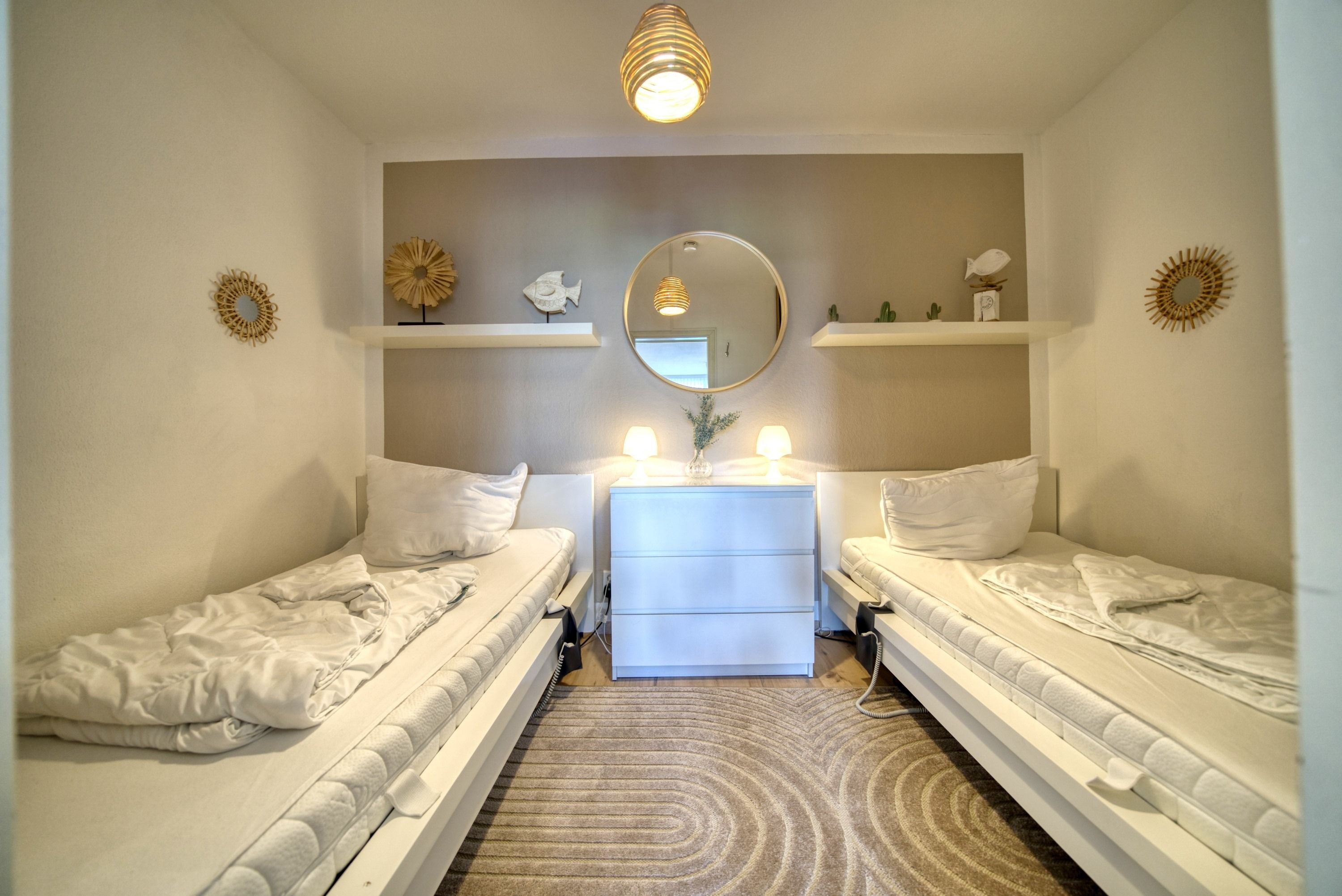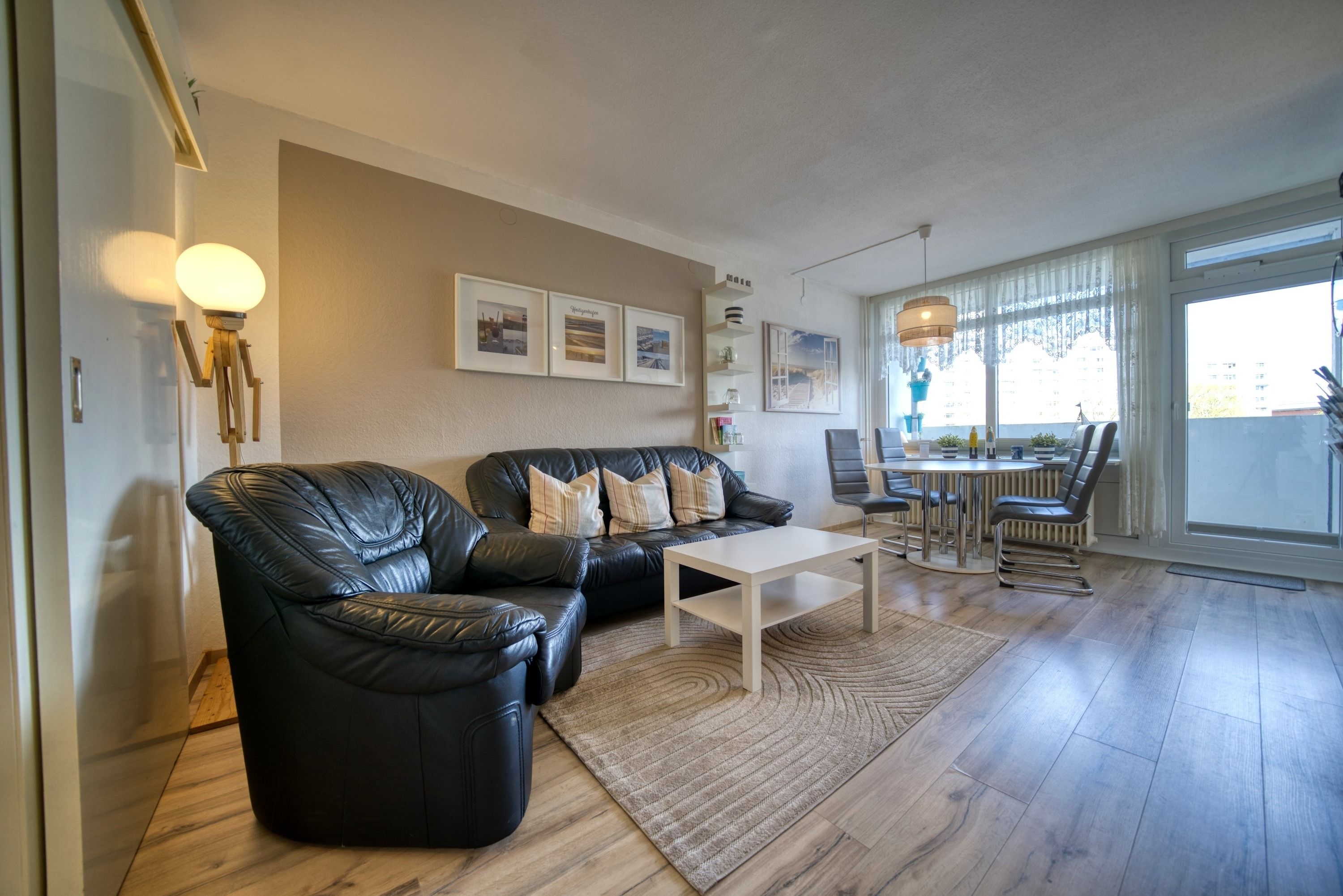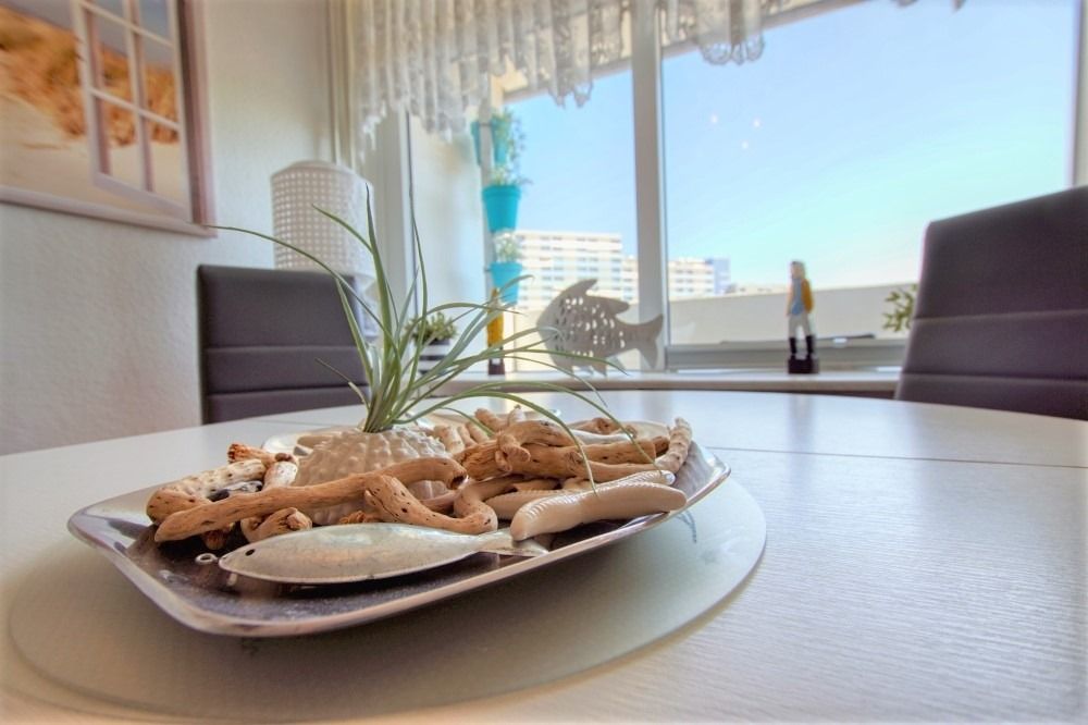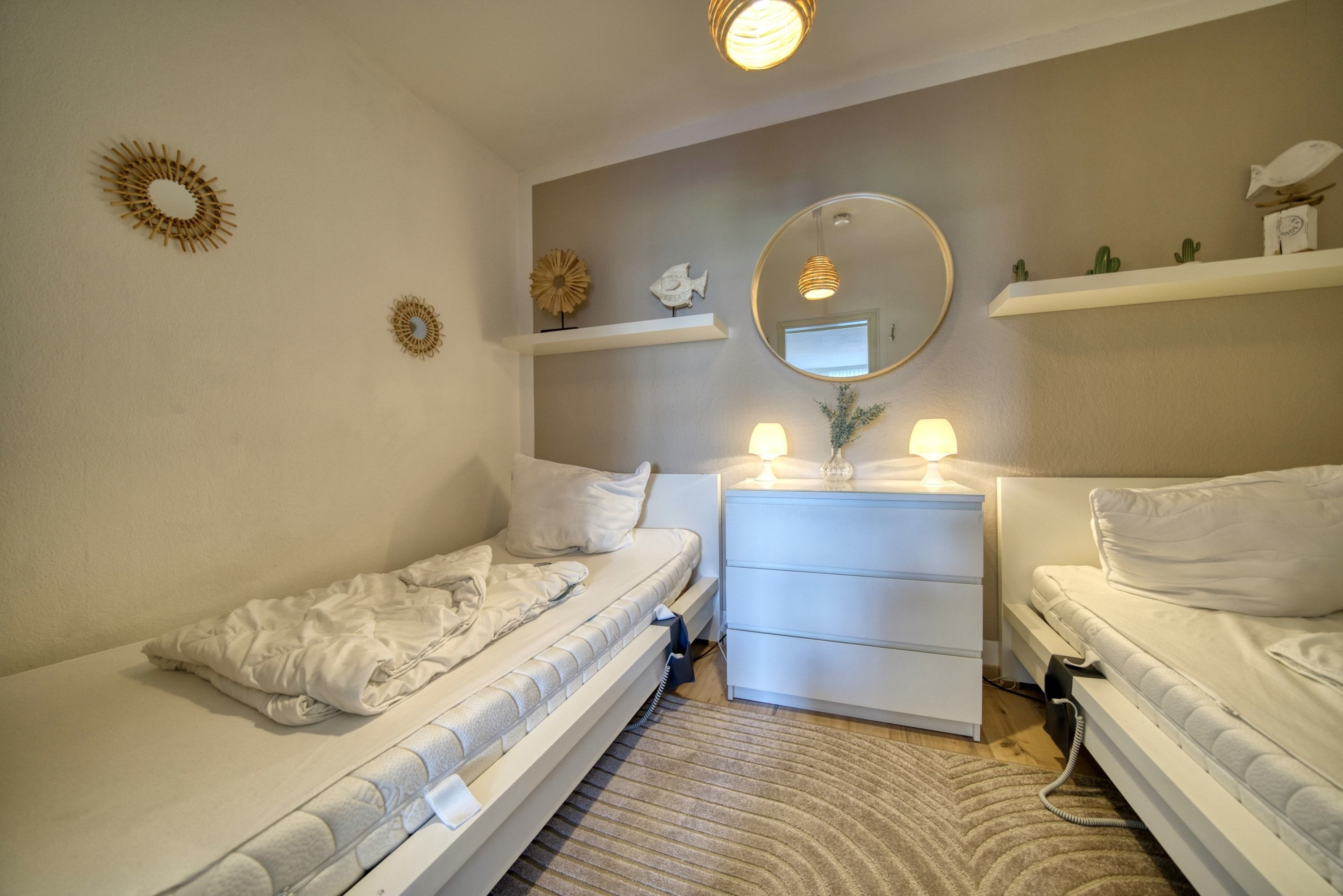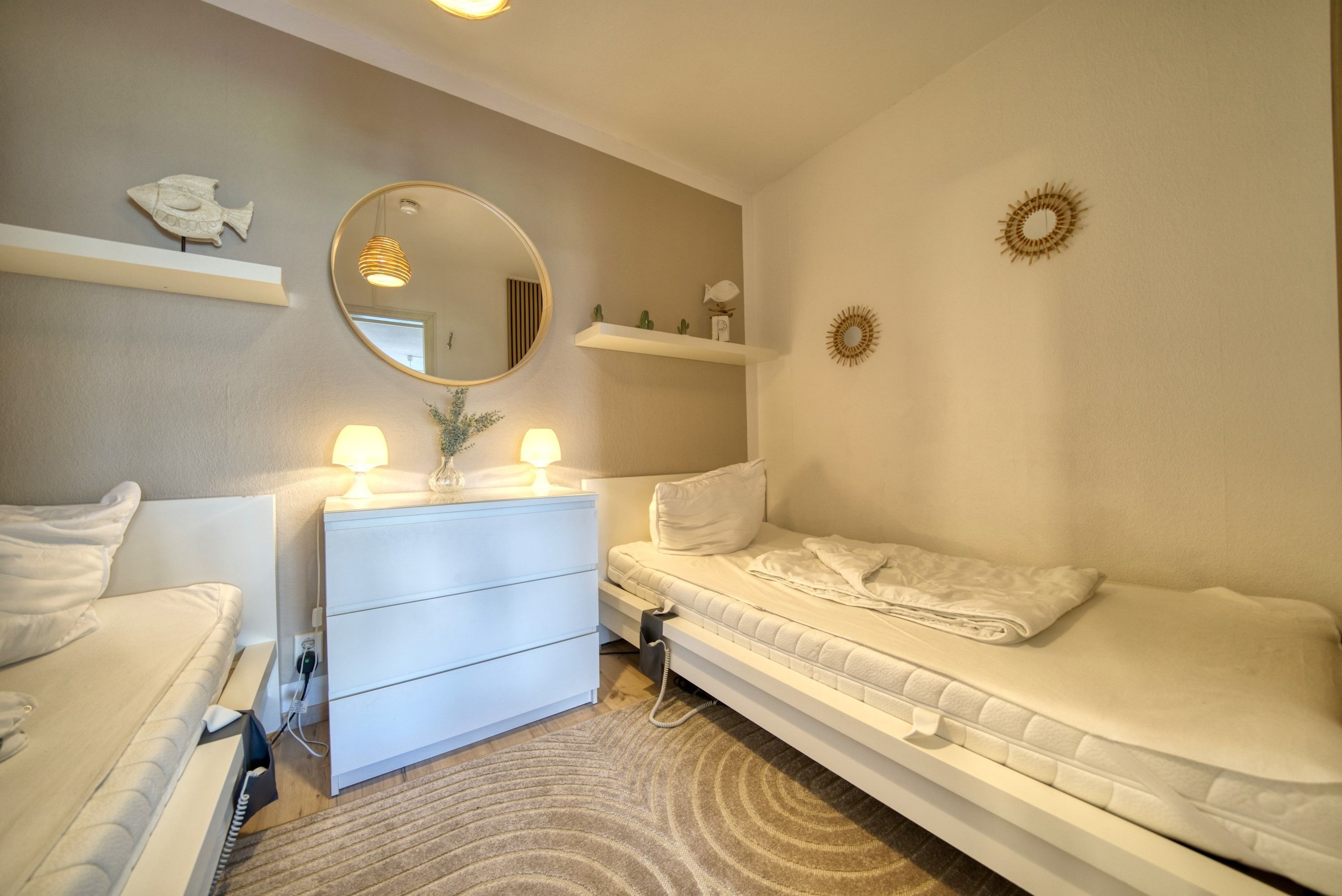Die 45 m² große Wohnung bietet Platz für bis zu 4 Personen und verfügt über einen Elternschlafraum mit Einzelbetten, Wohn-Esszimmer mit TV und Radio, Kinderzimmer mit Etagenbett, sowie eine Küche mit Mikrowelle, Kühlschrank, 4-Platten-Herd und Backofen. Badezimmer mit WC und Dusche. Nichtraucherwohnung, keine Haustiere, kein WLAN. Balkon mit Blick ins Grüne. Strand ca. 300 m, Aktiv-Hus mit Schwimmbad, Sauna, Wellness, Kinderspielwelt und Einkaufsmöglichkeiten direkt im Ferienpark.