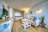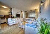 Liebevoll eingerichtete Ferienwohnung im Haus N, 5. Etage, mit Balkon zum Innenhof und Blick auf Grünanlagen und Ostsee Richtung Fehmarn. Auf 45 m² für bis zu 5 Personen: offener Wohn-Schlafbereich mit abtrennbarem Vorhang und Schlafsofa, Kinderzimmer mit Einzel- und Hochbett, Küchenzeile mit Induktionskochfeld, Geschirrspüler und Backofen, modernes Bad mit WC, Duschkabine und Waschbecken. Bonus: WLAN und Freikarte für die Kinderspielwelt. Strand ca. 300 m entfernt, Aktiv-Hus mit Schwimmbad, Sauna, Wellnessbereich und vielfältigen Freizeitmöglichkeiten direkt im Ferienpark.