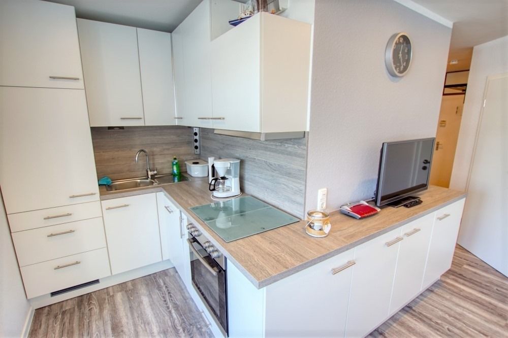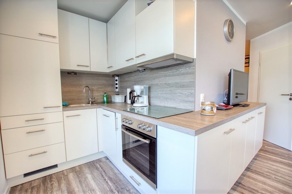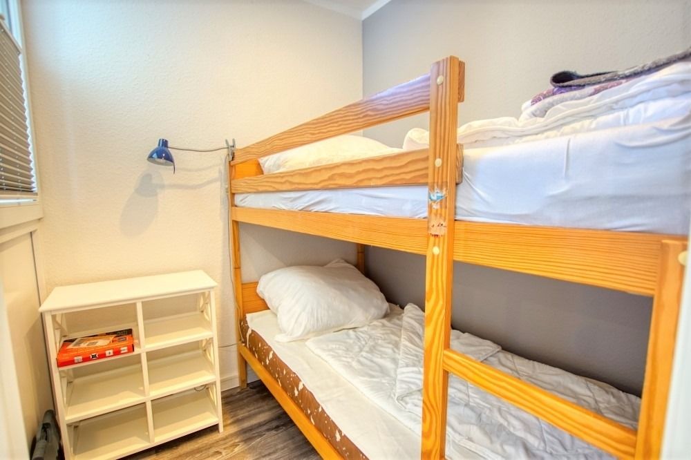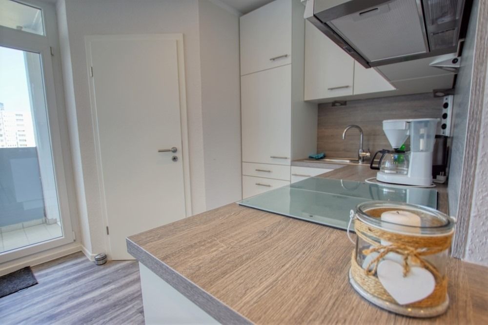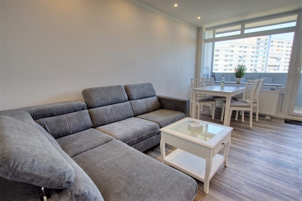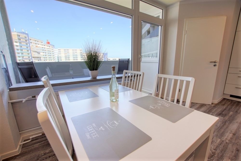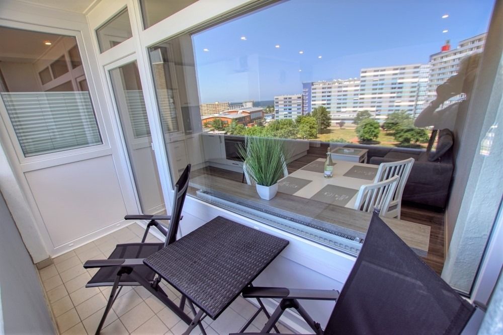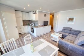 Die renovierte Wohnung befindet sich im Haus N im Ferienpark, 7. Etage, und verfügt über einen Balkon zum Innenhof mit Blick auf die Grünanlagen und die Ostsee Richtung Fehmarn. Auf 45 qm bietet sie ein Wohn-Esszimmer mit modernem Flat-TV und Radio, ein Elternschlafzimmer mit Doppelbett und Tür sowie ein Kinderzimmer mit Etagenbett und TV. Die Küche ist komplett ausgestattet mit Geschirrspüler, Backofen, Kühlschrank, 4-Platten-Ceran und Mikrowelle. Das Bad verfügt über Dusche und WC.