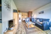 Die Wohnung im Haus O, 1. Etage, verfügt über einen Balkon zur Nordseite mit Blick in den Innenhof. Das Wohn-Esszimmer ist mit Schlafcouch und Fernseher ausgestattet, der Elternschlafbereich bietet ein Doppelschrankbett, und das separate Kinderzimmer ein Einzelbett. Die Küche ist komplett eingerichtet mit Kühlschrank, 4-Plattenherd und Geschirrspüler, das Bad mit WC und Dusche. Eine Loggia ist ebenfalls vorhanden.