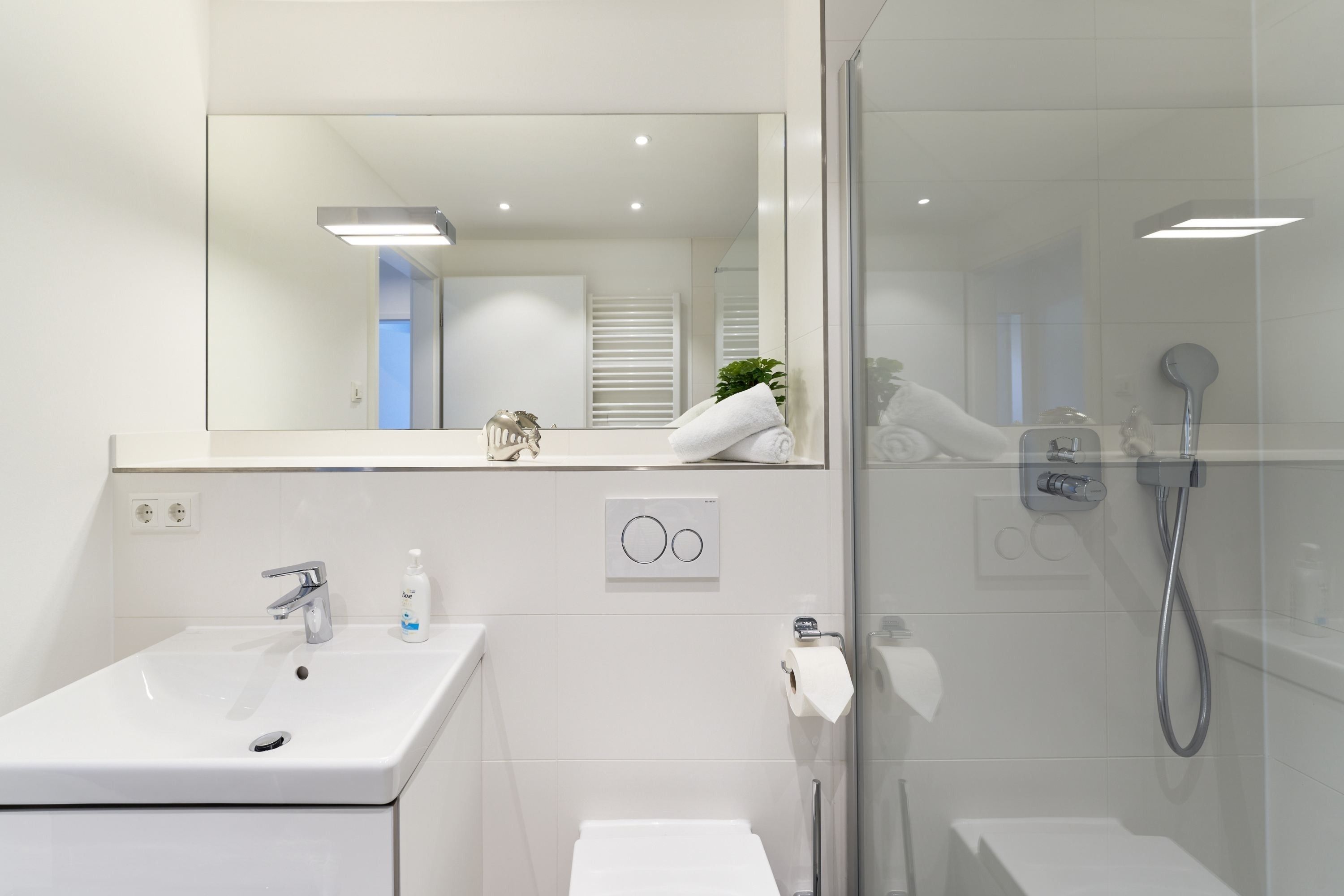 Das erste Schlafzimmer ist mit einem Boxspringbett (1,80 x 2,00m), einem Smart-TV (43) sowie einem Kleiderschrank ausgestattet. Im 2. Schlafzimmer befinden sich zwei Einzel-Boxspringbetten (1,00 x 2,00m) sowie ein 43-TV. Alle Räume lassen sich durch Außenrollläden verdunkeln. Das Duschbad ist mit einem Handtuchheizkörper und einer bodengleichen Dusche ausgestattet. Kosmetikspiegel und Haartrockner sind hier selbstverständlich vorhanden.